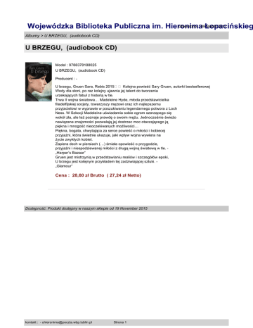 Utworzono : 08Łopacińskieg March 2017 Wojewódzka Biblioteka Publiczna im. Hieronima Albumy > U BRZEGU, (audiobook CD) U BRZEGU, (audiobook CD) Model : 9788378188025 U BRZEGU, (audiobook CD) Producent : U brzegu, Gruen Sara, Rebis 2015�� Kolejna powieść Sary Gruen, autorki bestsellerowej Wody dla słoni, po raz kolejny ujawnia jej talent do tworzenia urzekających fabuł z historią w tle. Trwa II wojna światowa… Madeleine Hyde, młoda przedstawicielka filadelfijskiej socjety, towarzyszy mężowi oraz ich najlepszemu przyjacielowi w wyprawie w poszukiwaniu legendarnego potwora z Loch Ness. W Szkocji Madeleine uświadamia sobie ogrom szerzącego się wokół zła, ale też poznaje prawdę o swoim mężu. Jednocześnie świeżo nawiązane znajomości pozwalają jej dostrzec moc otaczającego ją piękna i mnogość nieoczekiwanych możliwości… Piękna, bogata, chwytająca za serce powieść o miłości i kobiecej przyjaźni, która świetnie ukazuje, jaki wpływ wojna wywiera na życie zwykłych kobiet. Zapiera dech w piersiach (…) śmiała opowieść o przygodzie, przyjaźni i niespodziewanej miłości z drugą wojną światową w tle. „Harper’s Bazaar” Gruen jest mistrzynią w przedstawianiu realiów i szczegółów epoki, U brzegu jest kolejnym przykładem tej zadziwiającej sztuki. „Glamour” Cena : 28,60 zł Brutto ( 27,24 zł Netto) Dostępność: Produkt dostępny w naszym sklepie od 19 November 2015 kontakt : - [email protected] Strona 1