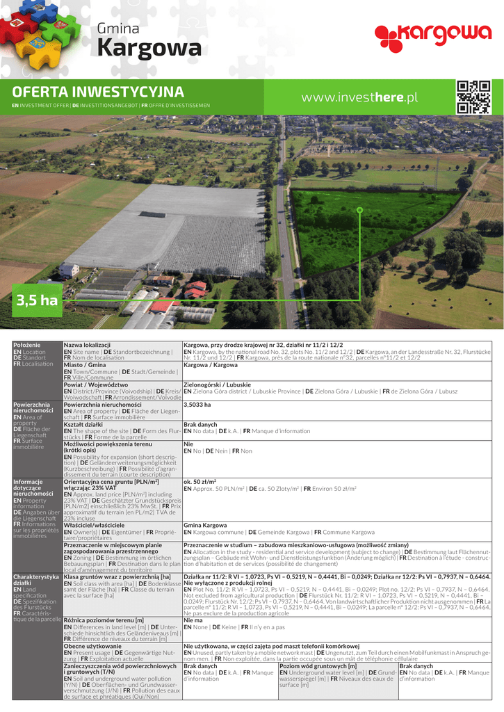 Gmina Kargowa OFERTA INWESTYCYJNA EN INVESTMENT OFFER | DE INVESTITIONSANGEBOT | FR OFFRE D’INVESTISSEMEN www.investhere.pl 3,5 ha Położenie EN Location DE Standort FR Localisation Nazwa lokalizacji EN Site name | DE Standortbezeichnung | FR Nom de localisation Miasto / Gmina EN Town/Commune | DE Stadt/Gemeinde | FR Ville/Commune Powiat / Województwo EN District/Province (Voivodship) | DE Kreis/ Woiwodschaft | FR Arrondissement/VoÏvodie Powierzchnia Powierzchnia nieruchomości nieruchomości EN Area of property | DE Fläche der LiegenEN Area of schaft | FR Surface immobilière property Kształt działki DE Fläche der EN The shape of the site | DE Form des FlurLiegenschaft stücks | FR Forme de la parcelle FR Surface Możliwości powiększenia terenu immobilière (krótki opis) EN Possibility for expansion (short description) | DE Geländeerweiterungsmöglichkeit (Kurzbeschreibung) | FR Possibilité d’agrandissement du terrain (courte description) Informacje Orientacyjna cena gruntu [PLN/m2] dotyczące włączając 23% VAT nieruchomości EN Approx. land price [PLN/m2] including EN Property 23% VAT | DE Geschätzter Grundstückspreis information [PLN/m2] einschließlich 23% MwSt. | FR Prix DE Angaben über approximatif du terrain [en PL/m2] TVA de die Liegenschaft 23% incluse FR Informations Właściciel/właściciele sur les propriétés EN Owner(s) | DE Eigentümer | FR Propriéimmobilières taire/propriétaires Przeznaczenie w miejscowym planie zagospodarowania przestrzennego EN Zoning | DE Bestimmung im örtlichen Bebauungsplan | FR Destination dans le plan local d’aménagement du territoire Charakterystyka Klasa gruntów wraz z powierzchnią [ha] działki EN Soil class with area [ha] | DE Bodenklasse EN Land samt der Fläche [ha] | FR Classe du terrain specification avec la surface [ha] DE Spezifikation des Flurstücks FR Caractéristique de la parcelle Różnica poziomów terenu [m] EN Differences in land level [m] | DE Unterschiede hinsichtlich des Geländeniveaus [m] | FR Différence de niveaux du terrain [m] Obecne użytkowanie EN Present usage | DE Gegenwärtige Nutzung | FR Exploitation actuelle Zanieczyszczenia wód powierzchniowych i gruntowych (T/N) EN Soil and underground water pollution (Y/N) | DE Oberflächen- und Grundwasserverschmutzung (J/N) | FR Pollution des eaux de surface et phréatiques (Oui/Non) Kargowa, przy drodze krajowej nr 32, działki nr 11/2 i 12/2 EN Kargowa, by the national road No. 32, plots No. 11/2 and 12/2 | DE Kargowa, an der Landesstraße Nr. 32, Flurstücke Nr. 11/2 und 12/2 | FR Kargowa, près de la route nationale n°32, parcelles n°11/2 et 12/2 Kargowa / Kargowa Zielonogórski / Lubuskie EN Zielona Góra district / Lubuskie Province | DE Zielona Góra / Lubuskie | FR de Zielona Góra / Lubusz 3,5033 ha Brak danych EN No data | DE k.A. | FR Manque d’information Nie EN No | DE Nein | FR Non ok. 50 zł/m2 EN Approx. 50 PLN/m2 | DE ca. 50 Zloty/m2 | FR Environ 50 zł/m2 Gmina Kargowa EN Kargowa commune | DE Gemeinde Kargowa | FR Commune Kargowa Przeznaczenie w studium – zabudowa mieszkaniowo-usługowa (możliwość zmiany) EN Allocation in the study - residential and service development (subject to change) | DE Bestimmung laut Flächennutzungsplan – Gebäude mit Wohn- und Dienstleistungsfunktion (Änderung möglich) | FR Destination à l’étude - construction d’habitation et de services (possibilité de changement) Działka nr 11/2: R VI – 1,0723, Ps VI – 0,5219, N – 0,4441, Bi – 0,0249; Działka nr 12/2: Ps VI – 0,7937, N – 0,6464. Nie wyłączone z produkcji rolnej EN Plot No. 11/2: R VI – 1,0723, Ps VI – 0,5219, N – 0,4441, Bi – 0,0249; Plot no. 12/2: Ps VI – 0,7937, N – 0,6464. Not excluded from agricultural production | DE Flurstück Nr. 11/2: R VI – 1,0723, Ps VI – 0,5219, N – 0,4441, Bi – 0,0249; Flurstück Nr. 12/2: Ps VI – 0,7937, N – 0,6464. Von landwirtschaftlicher Produktion nicht ausgenommen | FR La parcelle n° 11/2: R VI – 1,0723, Ps VI – 0,5219, N – 0,4441, Bi – 0,0249; La parcelle n° 12/2: Ps VI – 0,7937, N – 0,6464. Ne pas exclure de la production agricole Nie ma EN None | DE Keine | FR Il n’y en a pas Nie użytkowana, w części zajęta pod maszt telefonii komórkowej EN Unused, partly taken by a mobile network mast | DE Ungenutzt, zum Teil durch einen Mobilfunkmast in Anspruch genom men. | FR Non exploitée, dans la partie occupée sous un mât de téléphonie céllulaire Brak danych Poziom wód gruntowych [m] Brak danych EN No data | DE k.A. | FR Manque EN Underground water level [m] | DE Grund- EN No data | DE k.A. | FR Manque d’information wasserspiegel [m] | FR Niveaux des eaux de d’information surface [m] Czy były prowadzone badania geologiczne terenu (T/N) EN Were geological research done (Y/N) | DE Wurde geologische Forschung durchgeführt (J/N)? | FR Est-ce qu’on a fait des essais géologiques (Oui/Non)? Przeszkody podziemne (T/N) EN Underground obstacles (Y/N) | DE Unterirdische Hindernisse (J/N) | FR Obstacles souterrain (Oui/Non) Istniejące ograniczenia ekologiczne (T/N) EN Ecological restrictions (Y/N) | DE Bestehende ökologische Einschränkungen (J/N) | FR Limitations écologiques (Oui/Non) Połączenia transportowe EN Transport links DE Verkehrsanbindung FR Liaisons de transport Droga dojazdowa do terenu (rodzaj drogi i jej szerokość) EN Access road to the plot (type and width of access road) | DE Zufahrt zum Gelände (Art und Breite der Zufahrtsstraße) | FR Route de desserte sur le terrain (type de route et sa largeur) Autostrada / droga krajowa [km] EN Nearest motorway / national road [km] | DE Autobahn / Landesstraße [km] | FR Autoroute / route nationale [km] Porty rzeczne i morskie w odległości do 200 km EN Sea and river ports located up to 200 km | DE Fluss- und Seehäfen in einer Entfernung von bis zu 200 km | FR Ports fluviaux et maritimes à une distance maximum de 200 km. Kolej [km] EN Railway line [km] | DE Eisenbahnlin