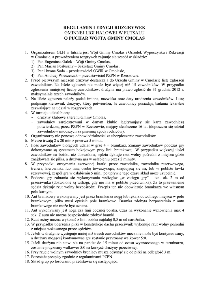 REGULAMIN I EDYCJI ROZGRYWEK GMINNEJ LIGI HALOWEJ W FUTSALU O PUCHAR WÓJTA GMINY CMOLAS 1. Organizatorem GLH w futsalu jest Wójt Gminy Cmolas i Ośrodek Wypoczynku i Rekreacji w Cmolasie, a prowadzeniem rozgrywek zajmuje sie zespół w składzie: 1) Pan Eugeniusz Galek – Wójt Gminy Cmolas, 2) Pan Marian Posłuszny – Sekretarz Gminy Cmolas, 3) Pani Iwona Soda – przedstawiciel OWiR w Cmolasie, 4) Pan Andrzej Wieczerzak – przedstawiciel PZPN w Rzeszowie. 2. Przed pierwszym meczem drużyny dostarczają do Urzędu Gminy w Cmolasie listę zgłoszeń zawodników. Na liście zgłoszeń nie może być więcej niż 15 zawodników. W przypadku zgłoszenia mniejszej liczby zawodników, drużyna ma prawo zgłosić do 31 grudnia 2012 r. maksymalnie trzech zawodników. 3. Na liście zgłoszeń należy podać imiona, nazwiska oraz daty urodzenia zawodników. Listę podpisuje kierownik drużyny, który potwierdza, że zawodnicy posiadają badania lekarskie zezwalające na udział w rozgrywkach. 4. W turnieju udział biorą: - drużyny klubowe z terenu Gminy Cmolas, - zawodnicy zarejestrowani w danym klubie legitymujący się kartą zawodniczą potwierdzoną przez PZPN w Rzeszowie, mający ukończone 16 lat (dopuszcza się udział zawodników młodszych za pisemną zgodą rodziców), 5. Organizatorzy nie ponoszą odpowiedzialności za ubezpieczenie zawodników. 6. Mecze trwają 2 x 20 min z przerwa 5 minut. 7. Ilość zawodników biorących udział w grze 4 + bramkarz. Zmiany zawodników podczas gry dokonywane są systemem hokejowym przy linii bramkowej. W przypadku większej ilości zawodników na boisku niż dozwolona, sędzia dyktuje rzut wolny pośredni z miejsca gdzie znajdowała sie piłka, a drużyna gra w osłabieniu przez 2 minuty. 8. W przypadku otrzymania czerwonej kartki przez zawodnika, zawodnika rezerwowego, trenera, kierownika lub inną osobę towarzyszącą znajdującą sie na, lub w pobliżu ławki rezerwowej, zespół gra w osłabieniu 5 min., po upływie tego czasu skład może uzupełnić. 9. Podczas gry zabrania sie wykonywania wślizgów „w zasięgu gry” - tzn. ok. 2 m od przeciwnika (dozwolone są wślizgi, gdy nie ma w pobliżu przeciwnika). Za to przewinienie sędzia dyktuje rzut wolny bezpośredni. Przepis ten nie obowiązuje bramkarza we własnym polu karnym. 10. Aut bramkowy wykonywany jest przez bramkarza nogą lub ręką z dowolnego miejsca w polu bramkowym, piłka musi opuścić pole bramkowe. Bramka zdobyta bezpośrednio z autu bramkowego nie może być uznana. 11. Aut wykonywany jest noga zza linii bocznej boiska. Czas na wykonanie wznowienia max 4 sek. Z autu nie można bezpośrednio zdobyć bramki. 12. Rzut rożny można wykonać z linii boiska najdalej 0,5 m od narożnika. 13. W przypadku uderzenia piłki w konstrukcje dachu przeciwnik wykonuje rzut wolny pośredni z miejsca wskazanego przez sędziów. 14. Jeżeli w drużynie występuje mniej niż trzech zawodników mecz nie może być kontynuowany, a drużyny mogącej kontynuować grę zostanie przyznany walkower 5:0. 15. Jeżeli drużyna nie stawi sie na parkiet do 15 minut od czasu wyznaczonego w terminarzu, zostanie przyznany walkower 5:0 na korzyść drużyny przeciwnej. 16. Przy rzucie wolnym zawodnicy broniący musza odsunąć sie od piłki na odległość 3 m. 17. Pozostałe przepisy zgodnie z regulaminami PZPN 18. Skład grup po losowaniu przedstawia się następująco: Grupa I 1. 2. 3. 4. 5. 6. TEMPO CMOLAS I OSTROVIA OSTROWY BARANOWSKIE II CERAMIKA HADYKÓWKA I VIGOR TRZĘSÓWKA II UNITAS PORĘBY DYMARSKIE I TEMPO CMOLAS III Grupa II 1. TEMPO CMOLAS II 2. OSTROVIA OSTROWY BARANOWSKIE I 3. CERAMIKA HADYKÓWKA II 4. VIGOR TRZĘSÓWKA I 5. UNITAS PORĘBY DYMARSKIE II 6. FLORIAN OSTROWY TUSZOWSKIE 19. Drużyny rozgrywają w ligach mecze systemem „każdy z każdym”. Po zakończeniu rozgrywek ustala się tabelę. O miejscu w tabeli decyduje większa liczba punktów a w przypadku równej ich ilości, mecze bezpośrednie miedzy zainteresowanymi drużynami. 20. W uzasadnionych przypadkach gdy drużyna nie może rozegrać meczu zgodnie z terminarzem, składa do zespołu prowadzącego rozgrywki pismo z prośbą o przełożenie spotkania. Zespołowi przysługuje tylko jedna zmiana w ciągu całego turnieju. Pismo takie musi wpłynąć najpóźniej do wtorku przed planowanym spotkaniem. O przełożeniu spotkania decyduje zespół prowadzący rozgrywki. 21. W sprawach nie uwzględnionych w niniejszym regulaminie decydować będzie zespół prowadzący rozgrywki.