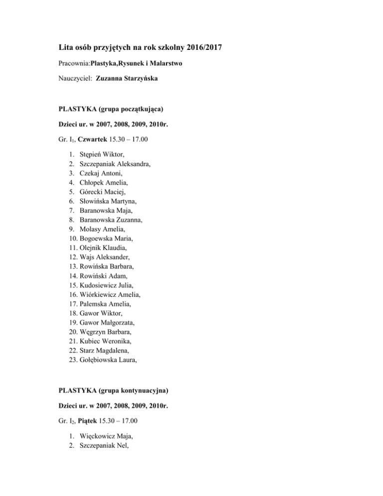 Lita osób przyjętych na rok szkolny 2016/2017 Pracownia:Plastyka,Rysunek i Malarstwo Nauczyciel: Zuzanna Starzyńska PLASTYKA (grupa początkująca) Dzieci ur. w 2007, 2008, 2009, 2010r. Gr. I1, Czwartek 15.30 – 17.00 1. Stępień Wiktor, 2. Szczepaniak Aleksandra, 3. Czekaj Antoni, 4. Chłopek Amelia, 5. Górecki Maciej, 6. Słowińska Martyna, 7. Baranowska Maja, 8. Baranowska Zuzanna, 9. Molasy Amelia, 10. Bogoewska Maria, 11. Olejnik Klaudia, 12. Wajs Aleksander, 13. Rowińska Barbara, 14. Rowiński Adam, 15. Kudosiewicz Julia, 16. Wiórkiewicz Amelia, 17. Palemska Amelia, 18. Gawor Wiktor, 19. Gawor Małgorzata, 20. Węgrzyn Barbara, 21. Kubiec Weronika, 22. Starz Magdalena, 23. Gołębiowska Laura, PLASTYKA (grupa kontynuacyjna) Dzieci ur. w 2007, 2008, 2009, 2010r. Gr. I2, Piątek 15.30 – 17.00 1. Więckowicz Maja, 2. Szczepaniak Nel, 3. Kojacz Paweł, 4. Boksa Aleksandra, 5. Skowroński Aleksander, 6. Znojek Julia, 7. Stanek Zofia, 8. Kołodziejczyk Natalia, 9. Matusiewicz Julia, 10. LafaScarlet, 11. Pędzik Natalia, 12. Orzeł Hanna, 13. Wolska Maja, 14. Ślusarczyk Apolonia, 15. Bąk Stanisław, 16. Korodziej Kornelia, 17. Czerwiec Gabriela, 18. Zapała Mariola, 19. SornatOliwier, 20. Borek Natalia, 21. Plutecka Barbara, 22. Orzech Hanna, 23. Janisz Karolina, RYSUNEK I MALARSTWO(grupa początkująca) Dzieci ur. w 2004, 2005, 2006r. Gr. II1, Wtorek 15.00 – 16.30 1. Gruszka Aleksandra, 2. Czekaj Albert, 3. Wsuł Gabriela, 4. Dziubek Natalia, 5. Węgrzyn Karolina, 6. Węgrzyn Bartłomiej, 7. Nowak Oliwia, 8. Wajs Emilia, 9. Wojtyna Aleksander 10. Styczeń Julia 11. Amelie De Roover 12. Serwatka Alicja 13. Stasik Dawid, 14. Stasik Kacper, 15. Styczeń Amelia, RYSUNEK I MALARSTWO(grupa kontynuacyjna) Dzieci ur. w 2004, 2005, 2006r. Gr. II2, Czwartek 17.15 – 18.45 1. Czekaj Natalia, 2. Śladkowska Kaja, 3. Gawroński Tomasz, 4. Ślęzak Jacek, 5. Ciesielska Zofia, 6. Kowalik Wiktoria, 7. Kowalik Aleksandra, 8. Nowalska Amelia, 9. Szlufik Karolina, 10. Stojanowska Natalia, 11. Morawiecka Zuzanna, 12. Dudek Oskar, 13. Kowalicka Maja, 14. Kowalicka Gabriela, 15. Żarnowiecka Julia, 16. Kondracka Zofia, 17. Kondracka Maria, 18. Jurczak Małgorzata, 19. Ryś Alicja, 20. Stępień Szymon, 21. Zawisza Aleksandra, 22. Lesisz Iga, 23. Zapała Aleksandra, RYSUNEK I MALARSTWO (grupa kontynuacyjna) Młodzież ur. w 1997, 1998, 1999, 2000, 2001, 2002, 2003r. Gr. III, Piątek 17.15 – 18.45 1. 2. 3. 4. 5. 6. 7. 8. 9. Kozłowski Adam, Galera Karolina, Stec Agnieszka, Tworogowski Bartłomiej, Tworogowski Krzysztof, Majewska Antonina, Bujak Karolina, Coś Gabriela, Pastuszko Elżbieta, 10. Pala Katarzyna, 11. Sornat Filip, 12. Sornat Laura, 13. Czubat Julia, 14. Jaros Julia, 15. Dygas Katarzyna, 16. Smolarczyk Aleksandra, 17. Dudzik Kamila, 18. Sybila Emilia, 19. Sikorska Maja, 20. Węgrzyn Karolina, 21. Janik Ewa,