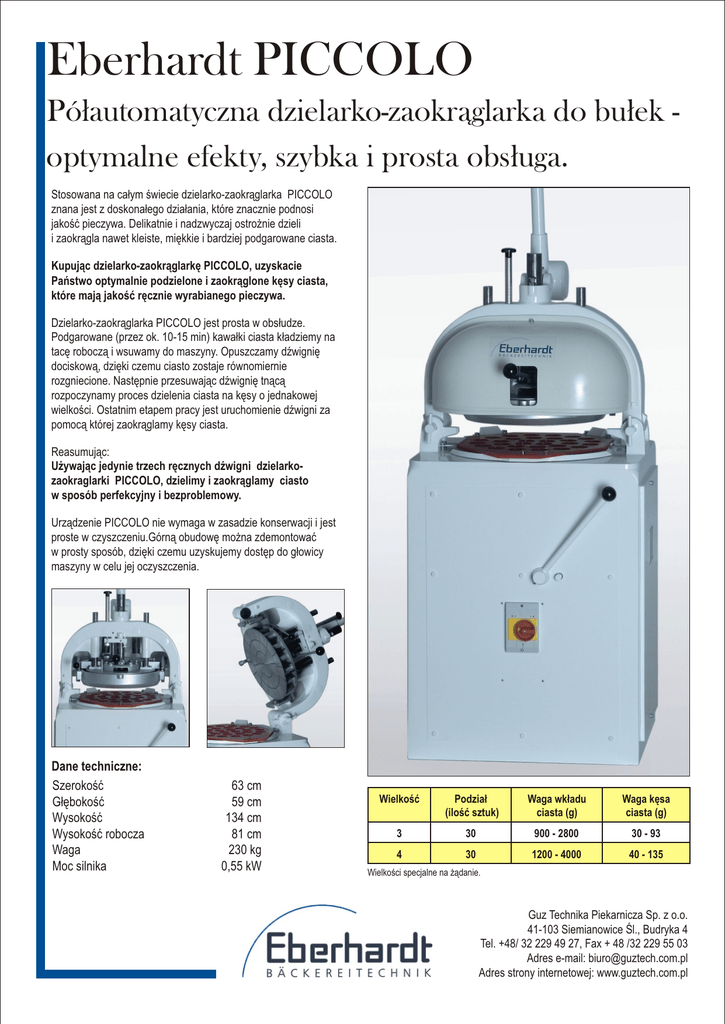 Eberhardt PICCOLO Pó³automatyczna dzielarko-zaokr¹glarka do bu³ek optymalne efekty, szybka i prosta obs³uga. Stosowana na całym świecie dzielarko-zaokrąglarka PICCOLO znana jest z doskonałego działania, które znacznie podnosi jakość pieczywa. Delikatnie i nadzwyczaj ostrożnie dzieli i zaokrągla nawet kleiste, miękkie i bardziej podgarowane ciasta. Kupując dzielarko-zaokrąglarkę PICCOLO, uzyskacie Państwo optymalnie podzielone i zaokrąglone kęsy ciasta, które mają jakość ręcznie wyrabianego pieczywa. Dzielarko-zaokrąglarka PICCOLO jest prosta w obsłudze. Podgarowane (przez ok. 10-15 min) kawałki ciasta kładziemy na tacę roboczą i wsuwamy do maszyny. Opuszczamy dźwignię dociskową, dzięki czemu ciasto zostaje równomiernie rozgniecione. Następnie przesuwając dźwignię tnącą rozpoczynamy proces dzielenia ciasta na kęsy o jednakowej wielkości. Ostatnim etapem pracy jest uruchomienie dźwigni za pomocą której zaokrąglamy kęsy ciasta. Reasumując: Używając jedynie trzech ręcznych dźwigni dzielarkozaokraglarki PICCOLO, dzielimy i zaokrąglamy ciasto w sposób perfekcyjny i bezproblemowy. Urządzenie PICCOLO nie wymaga w zasadzie konserwacji i jest proste w czyszczeniu.Górną obudowę można zdemontować w prosty sposób, dzięki czemu uzyskujemy dostęp do głowicy maszyny w celu jej oczyszczenia. Dane techniczne: Szerokość Głębokość Wysokość Wysokość robocza Waga Moc silnika 63 cm 59 cm 134 cm 81 cm 230 kg 0,55 kW Wielkość Podział (ilość sztuk) Waga wkładu ciasta (g) Waga kęsa ciasta (g) 3 30 900 - 2800 30 - 93 4 30 1200 - 4000 40 - 135 Wielkości specjalne na żądanie. Guz Technika Piekarnicza Sp. z o.o. 41-103 Siemianowice Śl., Budryka 4 Tel. +48/ 32 229 49 27, Fax + 48 /32 229 55 03 Adres e-mail: [email protected] Adres strony internetowej: www.guztech.com.pl