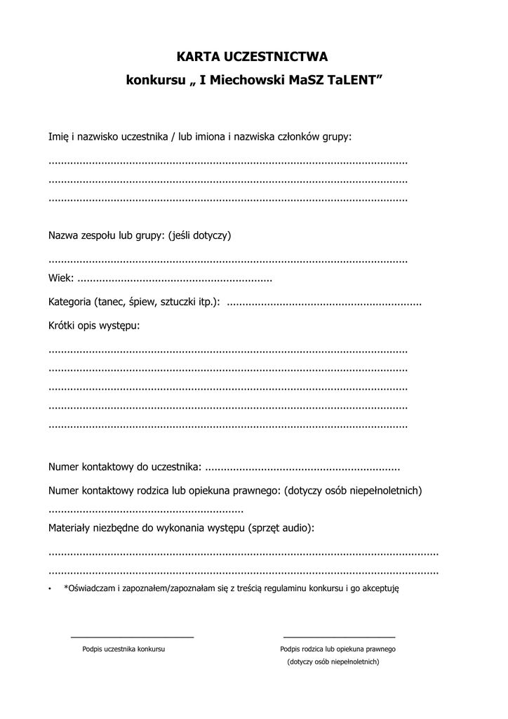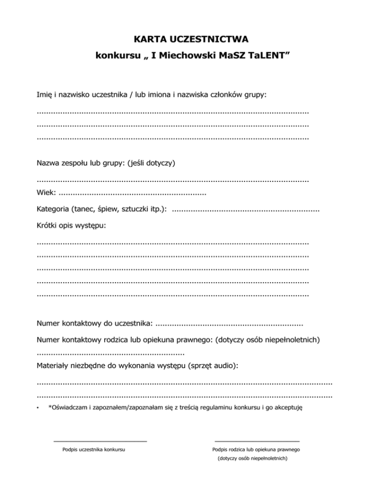 KARTA UCZESTNICTWA konkursu „ I Miechowski MaSZ TaLENT” Imię i nazwisko uczestnika / lub imiona i nazwiska członków grupy: .................................................................................................................... .................................................................................................................... .................................................................................................................... Nazwa zespołu lub grupy: (jeśli dotyczy) .................................................................................................................... Wiek: ............................................................... Kategoria (tanec, śpiew, sztuczki itp.): ............................................................... Krótki opis występu: .................................................................................................................... .................................................................................................................... .................................................................................................................... .................................................................................................................... .................................................................................................................... Numer kontaktowy do uczestnika: ............................................................... Numer kontaktowy rodzica lub opiekuna prawnego: (dotyczy osób niepełnoletnich) ............................................................... Materiały niezbędne do wykonania występu (sprzęt audio): .............................................................................................................................. .............................................................................................................................. • *Oświadczam i zapoznałem/zapoznałam się z treścią regulaminu konkursu i go akceptuję ______________________ Podpis uczestnika konkursu ____________________ Podpis rodzica lub opiekuna prawnego (dotyczy osób niepełnoletnich)