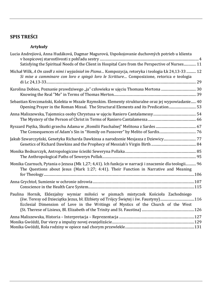 SPIS TREŚCI Artykuły Lucia Andrejiová, Anna Hudáková, Dagmar Magurová, Uspokojovanie duchovných potrieb u klienta v hospicovej starostlivosti z pohľadu sestry ................................................................................................................. 4 Satisfying the Spiritual Needs of the Client in Hospital Care from the Perspective of Nurses .............. 11 Michał Wilk, A On szedł z nimi i wyjaśniał im Pisma… Kompozycja, retoryka i teologia Łk 24,13-33 ........... 12 Si mise a camminare con loro e spiegò loro le Scritture… Composizione, retorica e teologia di Lc 24,13-33........................................................................................................................................................................... 29 Karolina Dobies, Poznanie prawdziwego „ja” człowieka w ujęciu Thomasa Mertona ........................................ 30 Knowing the Real "Me" in Terms of Thomas Merton.............................................................................................. 39 Sebastian Kreczmański, Kolekta w Mszale Rzymskim. Elementy strukturalne oraz jej wypowiadanie...... 40 Opening Prayer in the Roman Missal. The Structural Elements and its Predication ............................... 53 Anna Maliszewska, Tajemnica osoby Chrystusa w ujęciu Raniero Cantalamessy ................................................. 54 The Mystery of the Person of Christ in Terms of Raniero Cantalamessa ....................................................... 66 Ryszard Piętka, Skutki grzechu Adama w „Homilii Paschalnej” Melitona z Sardes .............................................. 67 The Consequences of Adam’s Sin in “Homily on Passover” by Melito of Sardis.......................................... 76 Jakub Szwarczyński, Genetyka Richarda Dawkinsa a narodzenie Mesjasza z Dziewicy..................................... 77 Genetics of Richard Dawkins and the Prophecy of Messiah’s Virgin Birth ................................................... 84 Monika Bednarczyk, Antropologiczne ścieżki Seweryna Pollaka ................................................................................. 85 The Anthropological Paths of Seweryn Pollak ........................................................................................................... 95 Monika Czarnuch, Pytania o Jezusa (Mk 1,27; 4,41). Ich funkcja w narracji i znaczenie dla teologii............ 96 The Questions about Jesus (Mark 1:27; 4:41). Their Function in Narrative and Meaning for Theology ............................................................................................................................................................................ 106 Anna Grychtoł, Sumienie w ochronie zdrowia .................................................................................................................... 107 Conscience in the Health Care System......................................................................................................................... 115 Paulina Hornik, Eklezjalny wymiar miłości w pismach mistyczek Kościoła Zachodniego (św. Teresy od Dzieciątka Jezus, bł. Elżbiety od Trójcy Świętej i św. Faustyny)....................................... 116 Ecclesial Dimension of Love in the Writings of Mystics of the Church of the West (St. Therese of Lisieux, Bl. Elizabeth of the Trinity and St. Faustina) ............................................................ 126 Anna Maliszewska, Historia – Interpretacja – Reprezentacja ...................................................................................... 127 Monika Gwóźdź, Dar viery a impulzy novej evanjelizácie .............................................................................................. 129 Monika Gwóźdź, Rola rodziny w opiece nad chorym przewlekle ............................................................................... 131