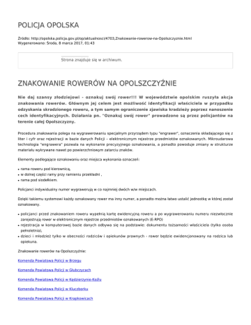 POLICJA OPOLSKA Źródło: http://opolska.policja.gov.pl/op/aktualnosci/4703,Znakowanie-rowerow-na-Opolszczyznie.html Wygenerowano: Środa, 8 marca 2017, 01:43 Strona znajduje się w archiwum. ZNAKOWANIE ROWERÓW NA OPOLSZCZYŹNIE Nie daj szansy złodziejowi - oznakuj swój rower!!! W województwie opolskim ruszyła akcja znakowania rowerów. Głównym jej celem jest możliwość identyfikacji właściciela w przypadku odzyskania skradzionego roweru, a tym samym ograniczenie zjawiska kradzieży poprzez nanoszenie cech identyfikacyjnych. Działania pn. "Oznakuj swój rower" prowadzone są przez policjantów na terenie całej Opolszczyzny. Procedura znakowania polega na wygrawerowaniu specjalnym przyrządem typu "engrawer", oznaczenia składającego się z liter i cyfr oraz rejestracji w bazie danych Policji – elektronicznym rejestrze przedmiotów oznakowanych. Mikroudarowa technologia "engrawera" pozwala na wykonanie precyzyjnego oznakowania, a ponadto powoduje zmiany w strukturze materiału wykrywane nawet po powierzchniowym zatarciu znaków. Elementy podlegające oznakowaniu oraz miejsca wykonania oznaczeń: ● rama roweru pod kierownicą, ● w dolnej części ramy przy ramieniu przekładni , ● rama pod siodełkiem. Policjanci indywidualny numer wygrawerują w co najmniej dwóch w/w miejscach. Dzięki takiemu systemowi każdy oznakowany rower ma inny numer, a ponadto można łatwo ustalić jednostkę w której został oznakowany. ● policjanci przed znakowaniem roweru wypełnią kartę ewidencyjną roweru a po wygrawerowaniu numeru niezwłocznie zarejestrują rower w elektronicznym rejestrze przedmiotów oznakowanych (E-RPO) ● rejestracja w komputerowej bazie danych odbywa się na podstawie: dokumentu tożsamości właściciela (tylko osoba pełnoletnia), ● dzieci i młodzież tylko w obecności rodziców i opiekunów prawnych - rower będzie ewidencjonowany na rodzica lub opiekuna. Znakowanie rowerów na Opolszczyźnie: Komenda Powiatowa Policji w Brzegu Komenda Powiatowa Policji w Głubczycach Komenda Powiatowa Policji w Kędzierzynie-Koźlu Komenda Powiatowa Policji w Kluczborku Komenda Powiatowa Policji w Krapkowicach Komenda Powiatowa Policji w Namysłowie Komenda Powiatowa Policji w Nysie Komenda Powiatowa Policji w Oleśnie Komenda Miejska Policji w Opolu Komenda Powiatowa Policji w Prudniku Komenda Powiatowa Policji w Strzelcach Opolskich Ocena: 5/5 (1) Tweetnij zabezpiecz swój rower, profilaktyka