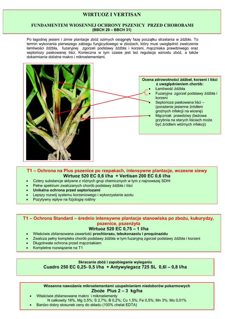 WIRTUOZ I VERTISAN FUNDAMENTEM WIOSENNEJ OCHRONY PSZENICY PRZED CHOROBAMI (BBCH 29 – BBCH 31) Po łagodnej jesieni i zimie plantacje zbóż ozimych osiągnęły fazę początku strzelania w źdźbło. To termin wykonania pierwszego zabiegu fungicydowego w zbożach, który musi uwzględnić zwalczenie łamliwości źdźbła, fuzaryjnej zgorzeli podstawy źdźbła i korzeni, mączniaka prawdziwego oraz septoriozy paskowanej liści. Konieczna w tym czasie jest też regulacja wzrostu zbóż, a także dokarmianie dolistne makro i mikroelementami. Ocena zdrowotności źdźbeł, korzeni i liści z uwzględnieniem chorób: Łamliwość źdźbła Fuzaryjna zgorzel podstawy źdźbła i korzeni Septorioza paskowana liści – (porażenie jesienne źródłem groźnych infekcji na wiosnę) Mączniak prawdziwy (beżowa grzybnia na starych liściach może być źródłem wtórnych infekcji) T1 – Ochrona na Plus pszenice po rzepakach, intensywne plantacje, wczesne siewy Wirtuoz 520 EC 0,6 l/ha + Vertisan 200 EC 0,6 l/ha Cztery substancje aktywne z różnych grup chemicznych w tym z najnowszej SDHI Pełne spektrum zwalczanych chorób podstawy źdźbła i liści Unikalna ochrona przed septoriozami Lepszy rozwój systemu korzeniowego i wykorzystanie azotu Pozytywny wpływ na fizjologię rośliny T1 – Ochrona Standard – średnio intensywne plantacje stanowiska po zbożu, kukurydzy, pszenice, pszenżyta Wirtuoz 520 EC 0,75 – 1 l/ha Właściwie zbilansowana zawartość prochlorazu, tebukonazolu i proquinazidu Zwalcza pełny kompleks chorób podstawy źdźbła w tym fuzaryjną zgorzel podstawy źdźbła i korzeni Długotrwała ochrona przed mączniakiem Kompletne rozwiązanie na T1 Skracanie zbóż i zapobieganie wyleganiu Cuadro 250 EC 0,25- 0,5 l/ha + Antywylegacz 725 SL 0,6l – 0,8 l/ha Wiosenne nawożenie mikroelementami uzupełnieniem niedoborów pokarmowych Zboże Plus 2 – 3 kg/ha Właściwie zbilansowane makro i mikroelementy N całkowity 18%, Mg 3,5%; S 2,7%; B 0,2%; Cu 1,5%; Fe 0,5%; Mn 3%; Mo 0,01% Bardzo dobry stosunek ceny do składu (100% chelat EDTA)