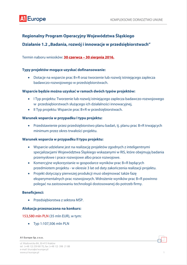 KOMPLEKSOWE DORADZTWO UNIJNE Regionalny Program Operacyjny Województwa Śląskiego Działanie 1.2 „Badania, rozwój i innowacje w przedsiębiorstwach” Termin naboru wniosków: 30 czerwca – 30 sierpnia 2016. Typy projektów mogące uzyskać dofinansowanie: • Dotacje na wsparcie prac B+R oraz tworzenie lub rozwój istniejącego zaplecza badawczo-rozwojowego w przedsiębiorstwach. Wsparcie będzie można uzyskać w ramach dwóch typów projektów: • • I Typ projektu: Tworzenie lub rozwój istniejącego zaplecza badawczo-rozwojowego w przedsiębiorstwach służącego ich działalności innowacyjnej, II Typ projektu: Wsparcie prac B+R w przedsiębiorstwach. Warunek wsparcia w przypadku I typu projektu: • Przedstawienie przez przedsiębiorstwo planu badań, tj. planu prac B+R trwających minimum przez okres trwałości projektu. Warunek wsparcia w przypadku II typu projektu: • • • Wsparcie udzielane jest na realizację projektów zgodnych z inteligentnymi specjalizacjami Województwa Śląskiego wskazanymi w RIS, które obejmują badania przemysłowe i prace rozwojowe albo prace rozwojowe. Komercyjne wykorzystanie w gospodarce wyników prac B+R będących przedmiotem projektu - w okresie 3 lat od daty zakończenia realizacji projektu. Projekt dotyczący pierwszej produkcji musi obejmować także fazę eksperymentalnych prac rozwojowych. Wdrożenie wyników prac B+R powinno polegać na zastosowaniu technologii dostosowanej do potrzeb firmy. Beneficjenci: • Przedsiębiorstwa z sektora MŚP. Alokacja przeznaczona na konkurs: 153,580 mln PLN (35 mln EUR), w tym: • Typ 1:107,506 mln PLN A1 Europe Sp. z o.o. ul. Wadowicka 8A, 30-415 Kraków tel. (+48 12) 259 80 70, fax: (+48 12) 398 21 88 e-mail: [email protected] www.a1europe.pl 1 KOMPLEKSOWE DORADZTWO UNIJNE • Typ 2: 46,074 mln PLN Minimalna wartość dofinansowania: • 200 tys. PLN. Maksymalna wartość projektu: • • I Typ projektu: Tworzenie lub rozwój istniejącego zaplecza B+R: 10 mln PLN. II Typ projektu:Wsparcie prac B+R: 5 mln PLN. Maksymalna intensywność pomocy: W ramach Regionalnej Pomocy Inwestycyjnej: • • 45% dla mikro- i małych przedsiębiorstw, 35% dla średnich przedsiębiorstw; W ramach prac badawczo-rozwojowych: • • • • • 70%na badania przemysłowe dla mikro- i małych przedsiębiorstw, 60%na badania przemysłowe dla średnich przedsiębiorstw, 45%na eksperymentalne prace rozwojowe dla mikro- i małych przedsiębiorstw, 35%na eksperymentalne prace rozwojowe dla średnich przedsiębiorstw, intensywność pomocy w przypadku badań przemysłowych i eksperymentalnych prac rozwojowych może zostać zwiększona o 15 punktów procentowych (jednak nie więcej niż do80% kosztów kwalifikowalnych), w sytuacji gdy wyniki projektu zostaną szeroko rozpowszechnione podczas konferencji, za pośrednictwem publikacji, ogólnodostępnych baz bądź oprogramowania bezpłatnego lub otwartego. W ramach Rozporządzenia z dnia 5 listopada 2015 r.w sprawie udzielania pomocy na wspieranie innowacyjności oraz innowacje procesowe i organizacyjne: • 50% dla mikro-, małych i średnich przedsiębiorstw. Ograniczenia: • • wsparcie przeznaczone jest wyłącznie dla MŚP, wnioskodawca w ramach konkursu może złożyć 2 wnioski o dofinansowanie zgodnie z warunkami przyznawania pomocy. W ramach typu 1: jeden wniosek dofinansowanie; w ramach typu 2: jeden wniosek o dofinansowanie, A1 Europe Sp. z o.o. ul. Wadowicka 8A, 30-415 Kraków tel. (+48 12) 259 80 70, fax: (+48 12) 398 21 88 e-mail: [email protected] www.a1europe.pl 2 KOMPLEKSOWE DORADZTWO UNIJNE • • • warunkiem wsparcia prac badawczych jest ich komercyjne wykorzystanie w gospodarce, wsparcie mogą uzyskać wyłącznie projekty wpisujące się w regionalne inteligentne specjalizacje, w ramach oceny merytorycznej kryterium „Zasadność i odpowiednia wysokość wydatków” eksperci mogą dokonywać korekty wydatków ujętych we wniosku o dofinansowanie w przypadku stwierdzenia w projekcie wydatków nieuzasadnionych lub zawyżonych w porównaniu z cenami rynkowymi. Poziom obniżenia lub uznanie wydatku za nieuzasadniony nie może przekroczyć 10% wartości całkowitych wydatków kwalifikowalnych projektu. Jeżeli zdaniem oceniającego więcej niż 10% wartości wydatków kwalifikowalnych jest nieuzasadnione lub zawyżone uznaje się, że projekt nie spełnia kryterium. Katalog kosztów: Koszty kwalifikowalne w ramach I typu projektu: Koszty nabycia nowych środków trwałych: • • • zakup fabrycznie nowych maszyn i urządzeń stanowiących infrastrukturę wykorzystywaną dla działalności badawczo – rozwojowej, zakup fabrycznie nowej aparatury badawczej oraz sprzętu badawczego, zakup fabrycznie nowych: wyposażenia naukowego, zestawów przyrządów i innego niezbędnego wyposażenia do prowadzenia badań, w tym m.in.: koszt zakupu, wytworzenia, instalacji, montażu, pierwszego uruchomienia, transportu, opakowania, rozładunku, koszty sprawdzenia i przystosowania nabytego sprzętu, koszty szkolenia personelu, instruktażu - pod warunkiem, że koszty te są ujęte w wartości początkowej zakupionego/wytworzonego środka trwałego w ewidencji środków trwałych beneficjenta. Koszty nabycia wartości niematerialnych i prawnych: • zakup oprogramowania, • zakup licencji na oprogramowanie w tym m.in.: koszty zakupu, wytworzenia, instalacji, montażu, pierwszego uruchomienia, koszty sprawdzenia i przystosowania nabytego oprogramowania, koszty szkolenia personelu, instruktażu - pod warunkiem, że koszty te są ujęte w wartości początkowej zakupionej/wytworzonej wartości niematerialnej i prawnej w ewidencji środków trwałych/wartości niematerialnych i prawnych beneficjenta; zakup wartości niematerialnych i prawnych dedykowanych/wytworzonych bezpośrednio dla wnioskodawcy lub A1 Europe Sp. z o.o. ul. Wadowicka 8A, 30-415 Kraków tel. (+48 12) 259 80 70, fax: (+48 12) 398 21 88 e-mail: [email protected] www.a1europe.pl 3 KOMPLEKSOWE