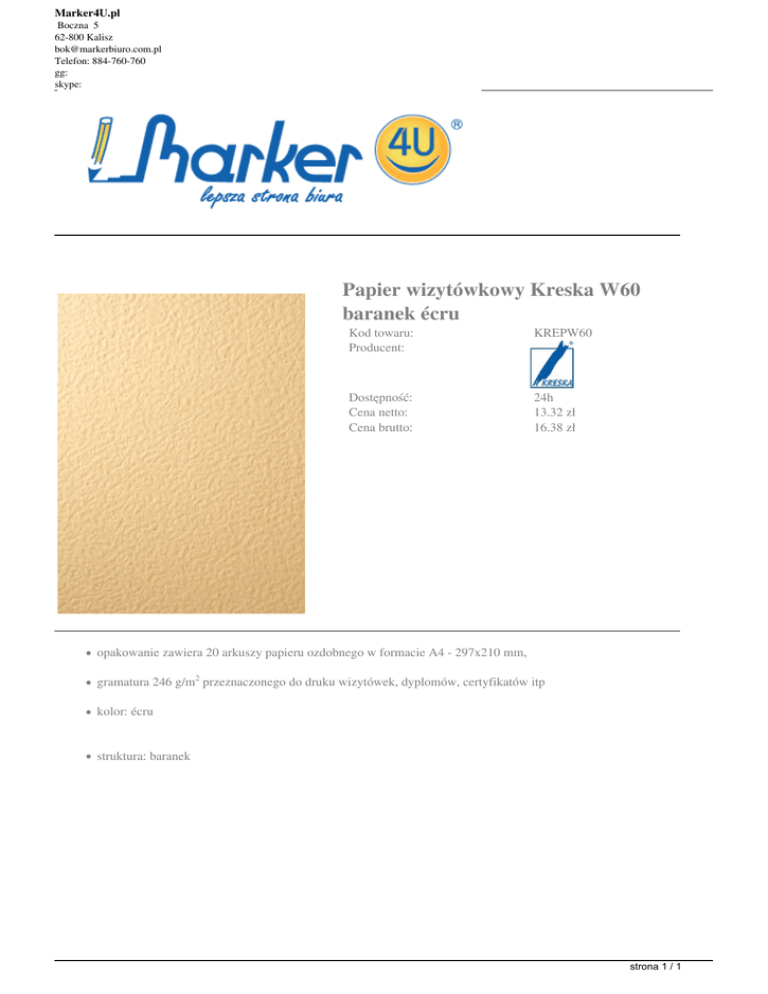 Marker4U.pl Boczna 5 62-800 Kalisz [email protected] Telefon: 884-760-760 gg: skype: Papier wizytówkowy Kreska W60 baranek écru Kod towaru: Producent: KREPW60 Dostępność: Cena netto: Cena brutto: 24h 13.32 zł 16.38 zł opakowanie zawiera 20 arkuszy papieru ozdobnego w formacie A4 - 297x210 mm, gramatura 246 g/m2 przeznaczonego do druku wizytówek, dyplomów, certyfikatów itp kolor: écru struktura: baranek strona 1 / 1 Powered by TCPDF (www.tcpdf.org)
