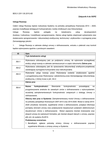 Ministerstwo Infrastruktury i Rozwoju BDG.V.2511.50.2015.AD Załącznik A do SOPZ Usługa Rozwoju Celem Usługi Rozwoju będzie rozbudowa Systemu na potrzeby perspektywy finansowej 2014 – 2020, poprzez modyfikacje istniejących funkcjonalności, kodów źródłowych oraz Dokumentacji. Usługa Rozwoju będzie na polegała świadczeniu usług developerskich (budowy / rozbudowy / modyfikacji) oprogramowania. Zakres usługi będzie obejmował wytwarzanie oraz dostarczanie oprogramowania i dokumentacji analitycznej, technicznej i użytkownika o wymaganej przez Zamawiającego jakości. Usługa Rozwoju w zakresie obsługi umowy o dofinansowanie, wniosku o płatność oraz kontroli 1. będzie wykonywana zgodnie z poniższymi zasadami: ID AA-1 AA-2 AA-3 Opis Tryb świadczenia usługi Wykonawca zobowiązany jest, po podpisaniu umowy, do wykonania szczegółowej analizy usługi rozwoju w zakresie zamieszczonym w części dokumentu Zakres prac. Wykonawca zobowiązany jest do opracowania dokumentacji analityczno-projektowej zawierającej wymagania funkcjonalne oraz niefunkcjonalne. Wykonanie usługi rozwoju przez Wykonawcę zostanie zrealizowane zgodnie z przygotowaną przez Wykonawcę i zatwierdzoną przez Zamawiającego dokumentacją analityczną, o której mowa w pkt. AA-2. Zakres prac AA-4 Nazwa funkcjonalności: Stworzenie funkcjonalności pozwalającej na przygotowywanie aneksów do zawartych umów o dofinansowanie z wykorzystaniem wcześniej zaimplementowanych funkcjonalności związanych z obsługą Umowy o dofinasowanie. Obecny stan prac w Systemie: Zaimplementowany moduł Umowy o dofinansowanie na potrzeby perspektyw finansowych 2007-2013 oraz 2014-2020. Moduł w wersji 20142020 umożliwia: tworzenie, wypełnianie Umów o dofinansowanie, przepływ informacji pomiędzy stronami umowy oraz podpisywanie bezpiecznym podpisem elektronicznym dwustronnym Umów o dofinansowanie. Moduł zapewnia również drukowanie oraz eksport umowy do wybranych formatów, jak również eksport danych z umowy, poprzez plik xml, do systemu SL2014. Podstawowy scenariusz. 1. Beneficjent, zgłasza potrzebę zmiany Umowy wypełnienie Wniosku o zmianę umowy w Systemie. 1 o dofinansowanie poprzez Ministerstwo Infrastruktury i Rozwoju ID Opis 2. Beneficjent podpisuje bezpiecznym podpisem elektronicznym Wniosek o zmianę umowy i przekazuje dokument w Systemie do Instytucji Zarządzającej. Uwagi: Beneficjent ma możliwość złożenia Wniosku o zmianę umowy w każdym momencie trwania projektu. Wniosek o zmianę umowy składa się z formularza oraz załącznika. Wzór formularza o zmianę umowy zdefiniowany jest w panelu administracyjnym. Załącznikiem do Wniosku o zmianę umowy jest formularz ostatniego Wniosku o dofinansowanie, zawierający jednak tylko te pola, które Beneficjent zmodyfikował w trakcie tworzenia wniosku o zmianę umowy. 3. Instytucja Zarządzająca pozytywnie ocenia Wniosek, stwierdza konieczność zmiany Umowy o dofinansowanie i przygotowuje w Systemie Aneks do umowy o dofinansowanie. Uwagi: Aneks do umowy o dofinansowanie to formularz zdefiniowany w panelu administracyjnym. Istnieje możliwość zdefiniowania wielu wzorów Aneksów, które mogą być wybierane na etapie tworzenia Aneksu przez Instytucję Zarządzającą. 4. Instytucja Zarządzająca po przygotowaniu Aneksu do umowy o dofinansowanie podpisuje go bezpiecznym podpisem elektronicznym i przesyła dokument do Beneficjenta. 5. Beneficjent akceptuje treść Aneksu, podpisuje bezpiecznym podpisem elektronicznym Aneks do umowy o dofinansowanie, a następnie przesyła dokument do Instytucji Zarządzającej. Scenariusze alternatywne: Opinia pozytywna - brak konieczności zmiany umowy o dofinansowanie. 3a) Instytucja opiniuje pozytywnie Wniosek o zmianę umowy o dofinansowanie, nie stwierdza konieczności przygotowywania Aneksu do umowy o dofinansowanie - wprowadza zmiany w formularzu Wniosku o dofinansowanie oraz Umowy o dofinansowanie Uwagi: Do osoby kontaktowej wskazanej przez Beneficjenta w zatwierdzonym Wniosku o dofinansowanie, przesyłana jest informacja o wprowadzonych zmianach we Wniosku o dofinansowanie Zakończenie scenariusza 2 Ministerstwo Infrastruktury i Rozwoju ID Opis Opinia negatywna: 3b) Instytucja Zarządzająca opiniuje negatywnie Wniosek o zmianę umowy o dofinansowanie i uzupełniania we Wniosku informacje o przyczynach odrzucenia dokumentu. 4b) Instytucja Zarządzająca odsyła w systemie Wniosek o zmianę umowy o dofinansowanie do Beneficjenta. Zakończenie scenariusza AA-5 Nazwa funkcjonalności: Funkcjonalność pozwalająca na przygotowanie Wniosku o płatność przez Beneficjenta, a następnie na procesowanie Wniosku oraz dokumentów powiązanych zgodnie z zaimplementowanym przepływem pomiędzy Beneficjentem a Instytucją Zarządzającą. Obecny stan prac w Systemie: Zaimplementowany moduł Wnioski o płatność na potrzeby perspektywy finansowej 2007-2013.. Podstawowy scenariusz: 1. Beneficjent przygotowuje Wniosek o płatność poprzez wypełnienie odpowiedniego formularza wraz załącznikami oraz dodatkowo załączając kopie dokumentów księgowych. Uwagi: Wzór formularza Wniosku o płatność jest zaimplementowanym wewnątrz aplikacji dokumentem, bez możliwości modyfikacji wzoru w panelu administracyjnym. Pola we Wniosku o płatność są walidowane w szczególności z danymi we Wnioskach o dofinansowanie. Błędne wypełnienie Wniosku o płatność sygnalizowane jest stosownymi komunikatami. Załączniki do Wnioski o płatność to: o Formularze zawierające zestawienia między innymi finansowe, opisów stanowisk, które można importować do systemu ze źródeł zewnętrznych z plików xls, xml. Odpowiednie szablony importu xls, xml, są możliwe do pobrania z Systemu. o Kopie dokumentów księgowych, w postaci zeskanowanej, które Beneficjent załącza do Wniosku o płatność. 2. Po zakończeniu przygotowania Wniosku o płatność Beneficjent podpisuje dokument bezpiecznym podpisem elektronicznym i pr
