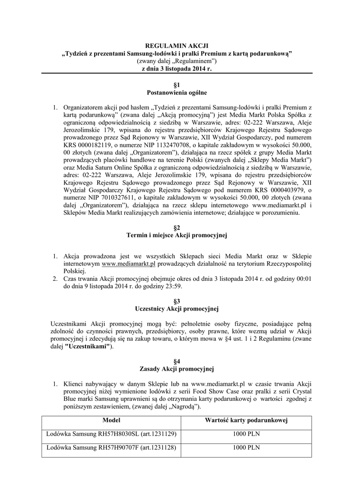 REGULAMIN AKCJI „Tydzień z prezentami Samsung-lodówki i pralki Premium z kartą podarunkową” (zwany dalej „Regulaminem”) z dnia 3 listopada 2014 r. §1 Postanowienia ogólne 1. Organizatorem akcji pod hasłem „Tydzień z prezentami Samsung-lodówki i pralki Premium z kartą podarunkową” (zwana dalej „Akcją promocyjną”) jest Media Markt Polska Spółka z ograniczoną odpowiedzialnością z siedzibą w Warszawie, adres: 02-222 Warszawa, Aleje Jerozolimskie 179, wpisana do rejestru przedsiębiorców Krajowego Rejestru Sądowego prowadzonego przez Sąd Rejonowy w Warszawie, XII Wydział Gospodarczy, pod numerem KRS 0000182119, o numerze NIP 1132470708, o kapitale zakładowym w wysokości 50.000, 00 złotych (zwana dalej „Organizatorem”), działająca na rzecz spółek z grupy Media Markt prowadzących placówki handlowe na terenie Polski (zwanych dalej „Sklepy Media Markt”) oraz Media Saturn Online Spółka z ograniczoną odpowiedzialnością z siedzibą w Warszawie, adres: 02-222 Warszawa, Aleje Jerozolimskie 179, wpisana do rejestru przedsiębiorców Krajowego Rejestru Sądowego prowadzonego przez Sąd Rejonowy w Warszawie, XII Wydział Gospodarczy Krajowego Rejestru Sądowego pod numerem KRS 0000403979, o numerze NIP 7010327611, o kapitale zakładowym w wysokości 50.000, 00 złotych (zwana dalej „Organizatorem”), działająca na rzecz sklepu internetowego www.mediamarkt.pl i Sklepów Media Markt realizujących zamówienia internetowe; działające w porozumieniu. §2 Termin i miejsce Akcji promocyjnej 1. Akcja prowadzona jest we wszystkich Sklepach sieci Media Markt oraz w Sklepie internetowym www.mediamarkt.pl prowadzących działalność na terytorium Rzeczypospolitej Polskiej. 2. Czas trwania Akcji promocyjnej obejmuje okres od dnia 3 listopada 2014 r. od godziny 00:01 do dnia 9 listopada 2014 r. do godziny 23:59. §3 Uczestnicy Akcji promocyjnej Uczestnikami Akcji promocyjnej mogą być: pełnoletnie osoby fizyczne, posiadające pełną zdolność do czynności prawnych, przedsiębiorcy, osoby prawne, które wezmą udział w Akcji promocyjnej i zdecydują się na zakup towaru, o którym mowa w §4 ust. 1 i 2 Regulaminu (zwane dalej "Uczestnikami"). §4 Zasady Akcji promocyjnej 1. Klienci nabywający w danym Sklepie lub na www.mediamarkt.pl w czasie trwania Akcji promocyjnej niżej wymienione lodówki z serii Food Show Case oraz pralki z serii Crystal Blue marki Samsung uprawnieni są do otrzymania karty podarunkowej o wartości zgodnej z poniższym zestawieniem, (zwanej dalej „Nagrodą”). Model Wartość karty podarunkowej Lodówka Samsung RH57H8030SL (art.1231129) 1000 PLN Lodówka Samsung RH57H90707F (art.1231128) 1000 PLN Pralka Samsung WW10H9600EW (art.1231125) 500 PLN Pralka Samsung WW12H8400EW (art.1231126) 500 PLN Pralka Samsung WW80H7410EW (art.1231127) 500 PLN 2. Do otrzymania nagrody uprawnia dokonanie za zakupiony towar płatności gotówką, kartą płatniczą, kartą kredytową, bonem, przelewem, jak również sprzedaż w systemie ratalnym. 3. Płatność Kartą Podarunkową Media Markt nie uprawnia do otrzymania nagrody. 4. Karta Podarunkowa Media Markt, stanowiąca nagrodę w sprzedaży promocyjnej, jest wystawiana na okaziciela i umożliwia dokonywanie zakupu towarów z oferty handlowej Media Markt w dowolnym sklepie Media Markt na terenie Rzeczypospolitej Polskiej, zgodnie z Regulaminem aktywacji i użytkowania Karty Podarunkowej Media Markt dostępnym na terenie sklepu lub na stronie internetowej www.mediamarkt.pl. 5. W przypadku zakupu w sklepie internetowym www.mediamarkt.pl o wydaniu karty podarunkowej decyduje data złożenia zamówienia w sklepie internetowym. 6. Karta Podarunkowa Media Markt, stanowiąca nagrodę w sprzedaży premiowej, nie podlega wymianie na gotówkę za wyjątkiem przypadków określonych w Regulaminie aktywacji i użytkowania Karty Podarunkowej Media Markt. 7. Media Markt Polska Sp. z o.o. nie ponosi żadnej odpowiedzialności w przypadku utraty Karty Podarunkowej. 8. Akcja promocyjna nie może być łączona z innymi Akcjami promocyjnymi, w tym kodami rabatowymi otrzymanymi w ramach programu Konto Premium. 9. Uczestnik dokonuje odbioru towaru zakupionego zgodnie z ust. 1 w dniu sprzedaży lub, w wypadku uzgodnienia późniejszego terminu odbioru jednakże nie dłuższego niż 30 dni od daty sprzedaży, najpóźniej w okresie 30 dni od daty sprzedaży. W wypadku bezskutecznego upływu uzgodnionego terminu odbioru towaru, Sklep Media Markt może pobierać opłatę za magazynowanie towaru według obowiązujących na danym rynku stawek. &5 Wydanie nagród 1. Nagrody zostaną wydane Klientom, którzy spełnią warunki określone w &4 pkt 1, 2, 3, wyłącznie w dniu nabycia towarów uprawniających do uzyskania nagrody (decyduje data nabycia wydrukowana na paragonie fiskalnym lub na fakturze VAT). Nagrody wydawane są wyłącznie w czasie trwania sprzedaży premiowej zgodnie z postanowieniem &2 pkt 2 niniejszego Regulaminu. 2. Nagrody wydawane będą w punkcie informacyjnym Sklepu, w którym dokonany został zakup, po okazaniu przez Klienta dowodu zakupu (paragonu fiskalnego lub faktury VAT) lub innym miejscu wskazanym przez Organizatora. W przypadku zakupu w sklepie internetowym www.mediamarkt.pl z dostawą do domu, karta podarunkowa zostanie dołączona do towaru. 3. Organizator informuje, że zgodnie z obowiązującymi przepisami prawa, przy wydaniu nagród o jednorazowej wartości przekraczającej 760 zł Klientom będącym osobami fizycznymi i nabywającym towary oferowane przez Organizatora w celu bezpośrednio nie związanym z prowadzoną działalnością gospodarczą, potrąci 10% kwoty doładowania na poczet należnego podatku dochodowego od osób fizycznych z tytułu nagród związanych ze sprzedażą premiową, którego Organizator jest płatnikiem. 4. Sklep jako płatnik przekazuje Podatek do właściwego Urzędu Skarbowego na podstawie art. 30 ust. 1 ustawy z dnia 26 lipca 1991 r. (Dz.U. z 2000