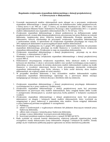 Regulamin zwiększania stypendium doktoranckiego z dotacji projakościowej w Uniwersytecie w Białymstoku §1 1. Uczestnik stacjonarnych studiów doktoranckich może ubiegać się o przyznanie zwiększenia stypendium doktoranckiego z dotacji podmiotowej na dofinansowanie zadań projakościowych, o której mowa w art. 94b ust. 1 pkt. 5 Ustawy, na zasadach określonych art. 200a Ustawy oraz rozporządzeniem Ministra Nauki i Szkolnictwa Wyższego z dnia 5 października 2011 r. w sprawie studiów doktoranckich oraz stypendiów doktoranckich (Dz. U. Nr 225 poz. 1351). 2. Zwiększenie stypendium doktoranckiego z dotacji podmiotowej na dofinansowanie zadań projakościowych, zwanej dalej dotacją projakościową, przyznawane jest przez Rektora na wniosek doktoranta, zaopiniowany przez właściwą komisję doktorancką. Komisja sporządza listę doktorantów, których rekomenduje do przyznania zwiększenia stypendium doktoranckiego z zachowaniem zasady, iż uprawnienie do zwiększenia stypendium przysługuje nie więcej niż 30% najlepszych doktorantów na poszczególnych latach studiów doktoranckich. 3. Doktorantowi znajdującemu się w grupie 30% najlepszych doktorantów, któremu nie przyznano stypendium doktoranckiego, przyznaje się środki finansowe w wysokości kwoty zwiększenia stypendium doktoranckiego. Zwiększenie to staje się stypendium doktoranckim. 4. Zwiększenie stypendium doktoranckiego z dotacji projakościowej przyznaje się na okres 12 miesięcy, z zastrzeżeniem § 5 pkt 2. 5. Minimalna wysokość kwoty zwiększenia stypendium doktoranckiego z dotacji projakościowej wynosi 800 zł. 6. Doktorantowi otrzymującemu zwiększenie stypendium, który ukończył studia w terminie krótszym niż określony w akcie o utworzeniu studiów oraz uzyskał wyróżniającą ocenę rozprawy doktorskiej, za okres pozostały do terminu ukończenia studiów doktoranckich wypłaca się środki finansowe w wysokości stanowiącej iloczyn kwoty przyznanego miesięcznie zwiększenia stypendium doktoranckiego oraz liczby miesięcy, o które został skrócony okres studiów doktoranckich, nie większej jednak niż sześć miesięcy. 7. W przypadku skreślenia doktoranta z listy uczestników studiów doktoranckich wypłaty zwiększenia stypendium doktoranckiego zaprzestaje się z pierwszym dniem miesiąca następującego po miesiącu, w którym decyzja o skreśleniu stała się ostateczna. §2 1. Zwiększenie stypendium doktoranckiego z dotacji projakościowej przysługuje doktorantowi wyróżniającemu się w pracy naukowej i dydaktycznej. 2. Zwiększenie stypendium doktoranckiego z dotacji projakościowej może być przyznane doktorantowi na pierwszym roku studiów doktoranckich, który osiągnął bardzo dobre wyniki w postępowaniu rekrutacyjnym tj. uzyskał najwyższą liczbę punktów w kolejności uzyskanych wyników. 3. Zwiększenie stypendium doktoranckiego z dotacji projakościowej może być przyznane doktorantowi na drugim i kolejnych latach studiów doktoranckich, który wyróżniał się osiągnięciami w pracy badawczej w poprzednim roku studiów. Ocena osiągnięć doktoranta w pracy badawczej powinna uwzględniać w szczególności: 1) Publikacje, 2) udział w konferencjach z wygłoszonym referatem lub plakatem dotyczącym tematyki pracy badawczej doktoranta, 3) odbyte staże związane z tematyką pracy badawczej doktoranta, 4) postępy w pracy doktorskiej/ wszczęcie przewodu doktorskiego, 5) kierowanie projektem naukowo-badawczym w ramach NCBiR lub NCN, 4. Rada wydziału na wniosek komisji doktoranckiej właściwej jednostki organizacyjnej ustala szczegółowe zasady dokonywania oceny doktorantów drugiego i kolejnych lat studiów. Zasady podaje się do wiadomości publicznej poprzez ogłoszenie na stronie internetowej jednostki. §3 1. Wniosek o przyznanie zwiększenia stypendium z dotacji projakościowej należy złożyć do kierownika studiów doktoranckich razem z wnioskiem o przyznanie stypendium doktoranckiego w terminie do 15 października każdego roku akademickiego, z zastrzeżeniem § 5 pkt 1. Wnioski złożone po terminie pozostawia się bez rozpoznania. Wzór wniosku stanowi załącznik do niniejszego Regulaminu. 2. Komisja doktorancka dokonuje oceny wniosków zgodnie z zasadami, o których mowa w § 2 ust. 2 i 4, i rekomenduje do przyznania zwiększenia stypendium doktoranckiego z dotacji projakościowej nie więcej niż 30% doktorantów każdego roku danych studiów doktoranckich. 3. Kierownik studiów doktoranckich przekazuje Rektorowi zaopiniowane wnioski doktorantów o zwiększenie stypendium oraz listę rekomendacyjną komisji doktoranckiej wraz z uzasadnieniem decyzji. 4. Decyzja Rektora w sprawie przyznania zwiększenia stypendium doktoranckiego z dotacji projakościowej jest ostateczna. 5. Doktorantowi przysługuje prawo do złożenia do rektora, za pośrednictwem kierownika studiów doktoranckich, wniosku o ponowne rozpatrzenie sprawy. Wniosek należy złożyć w terminie 14 dni od daty otrzymania decyzji. §4 1. Kierownik studiów doktoranckich może wystąpić do Rektora z wnioskiem o cofnięcie zwiększenia stypendium doktoranckiego w przypadku gdy doktorant nie wypełnia obowiązków wynikających z Regulaminu studiów doktoranckich lub został ukarany karą dyscyplinarną. 2. Decyzję o cofnięciu zwiększenia stypendium doktoranckiego podejmuje Rektor. Decyzja Rektora jest ostateczna. 3. Doktorantowi przysługuje prawo do złożenia do Rektora, za pośrednictwem kierownika studiów doktoranckich, wniosku o ponowne rozpatrzenie sprawy. Wniosek należy złożyć w terminie 14 dni od daty otrzymania decyzji. §5 W roku akademickim 2011/2012: 1) wniosek o przyznanie zwiększenia stypendium z dotacji projakościowej należy złożyć do kierownika studiów doktoranckich w terminie do 10 lipca 2012 r. 2) zwiększenie stypendium doktoranckiego z dotacji projakościowej przyznaje się za okres 9 miesięcy - od 1 stycznia do 30 września 2012 r.