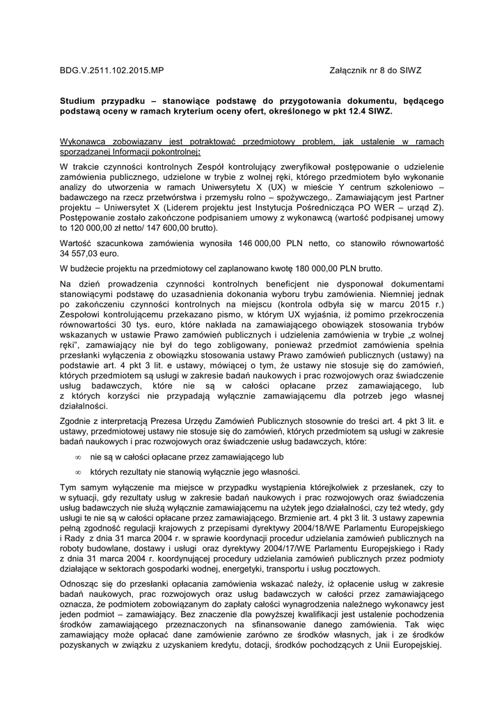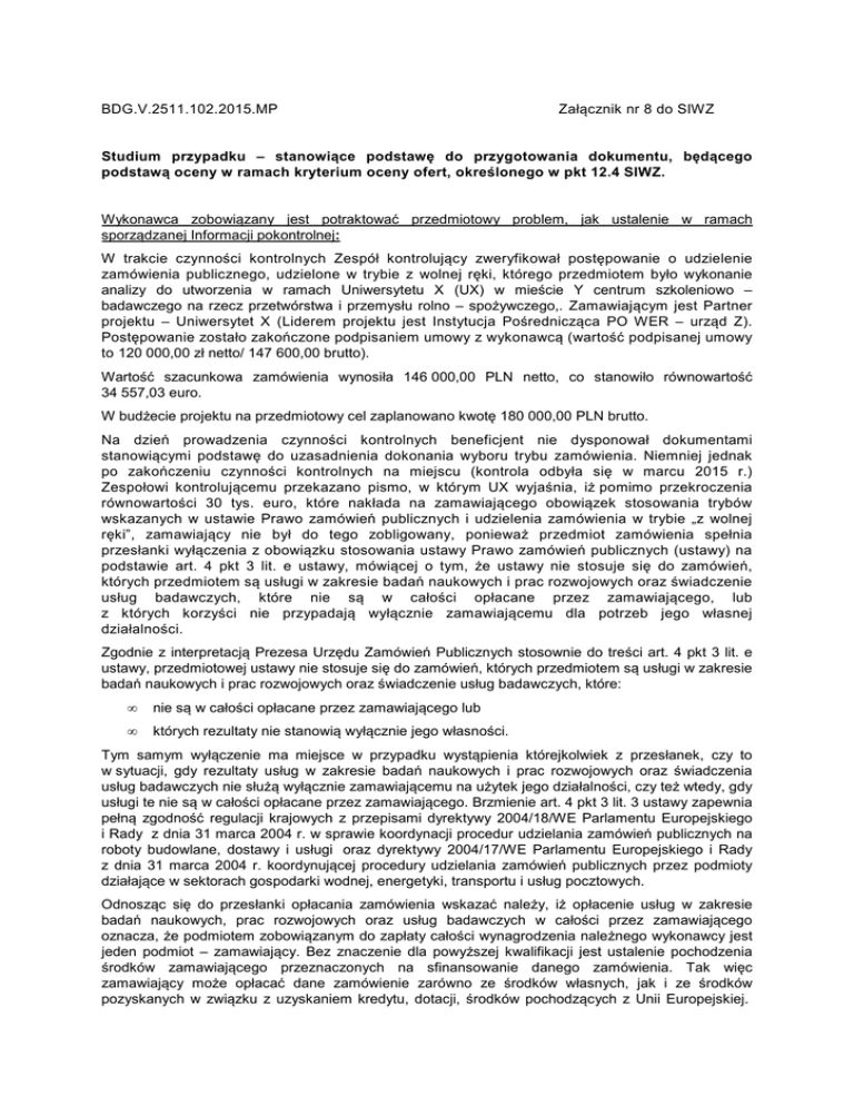 BDG.V.2511.102.2015.MP Załącznik nr 8 do SIWZ Studium przypadku – stanowiące podstawę do przygotowania dokumentu, będącego podstawą oceny w ramach kryterium oceny ofert, określonego w pkt 12.4 SIWZ. Wykonawca zobowiązany jest potraktować przedmiotowy problem, jak ustalenie w ramach sporządzanej Informacji pokontrolnej: W trakcie czynności kontrolnych Zespół kontrolujący zweryfikował postępowanie o udzielenie zamówienia publicznego, udzielone w trybie z wolnej ręki, którego przedmiotem było wykonanie analizy do utworzenia w ramach Uniwersytetu X (UX) w mieście Y centrum szkoleniowo – badawczego na rzecz przetwórstwa i przemysłu rolno – spożywczego,. Zamawiającym jest Partner projektu – Uniwersytet X (Liderem projektu jest Instytucja Pośrednicząca PO WER – urząd Z). Postępowanie zostało zakończone podpisaniem umowy z wykonawcą (wartość podpisanej umowy to 120 000,00 zł netto/ 147 600,00 brutto). Wartość szacunkowa zamówienia wynosiła 146 000,00 PLN netto, co stanowiło równowartość 34 557,03 euro. W budżecie projektu na przedmiotowy cel zaplanowano kwotę 180 000,00 PLN brutto. Na dzień prowadzenia czynności kontrolnych beneficjent nie dysponował dokumentami stanowiącymi podstawę do uzasadnienia dokonania wyboru trybu zamówienia. Niemniej jednak po zakończeniu czynności kontrolnych na miejscu (kontrola odbyła się w marcu 2015 r.) Zespołowi kontrolującemu przekazano pismo, w którym UX wyjaśnia, iż pomimo przekroczenia równowartości 30 tys. euro, które nakłada na zamawiającego obowiązek stosowania trybów wskazanych w ustawie Prawo zamówień publicznych i udzielenia zamówienia w trybie „z wolnej ręki”, zamawiający nie był do tego zobligowany, ponieważ przedmiot zamówienia spełnia przesłanki wyłączenia z obowiązku stosowania ustawy Prawo zamówień publicznych (ustawy) na podstawie art. 4 pkt 3 lit. e ustawy, mówiącej o tym, że ustawy nie stosuje się do zamówień, których przedmiotem są usługi w zakresie badań naukowych i prac rozwojowych oraz świadczenie usług badawczych, które nie są w całości opłacane przez zamawiającego, lub z których korzyści nie przypadają wyłącznie zamawiającemu dla potrzeb jego własnej działalności. Zgodnie z interpretacją Prezesa Urzędu Zamówień Publicznych stosownie do treści art. 4 pkt 3 lit. e ustawy, przedmiotowej ustawy nie stosuje się do zamówień, których przedmiotem są usługi w zakresie badań naukowych i prac rozwojowych oraz świadczenie usług badawczych, które: • nie są w całości opłacane przez zamawiającego lub • których rezultaty nie stanowią wyłącznie jego własności. Tym samym wyłączenie ma miejsce w przypadku wystąpienia którejkolwiek z przesłanek, czy to w sytuacji, gdy rezultaty usług w zakresie badań naukowych i prac rozwojowych oraz świadczenia usług badawczych nie służą wyłącznie zamawiającemu na użytek jego działalności, czy też wtedy, gdy usługi te nie są w całości opłacane przez zamawiającego. Brzmienie art. 4 pkt 3 lit. 3 ustawy zapewnia pełną zgodność regulacji krajowych z przepisami dyrektywy 2004/18/WE Parlamentu Europejskiego i Rady z dnia 31 marca 2004 r. w sprawie koordynacji procedur udzielania zamówień publicznych na roboty budowlane, dostawy i usługi oraz dyrektywy 2004/17/WE Parlamentu Europejskiego i Rady z dnia 31 marca 2004 r. koordynującej procedury udzielania zamówień publicznych przez podmioty działające w sektorach gospodarki wodnej, energetyki, transportu i usług pocztowych. Odnosząc się do przesłanki opłacania zamówienia wskazać należy, iż opłacenie usług w zakresie badań naukowych, prac rozwojowych oraz usług badawczych w całości przez zamawiającego oznacza, że podmiotem zobowiązanym do zapłaty całości wynagrodzenia należnego wykonawcy jest jeden podmiot – zamawiający. Bez znaczenie dla powyższej kwalifikacji jest ustalenie pochodzenia środków zamawiającego przeznaczonych na sfinansowanie danego zamówienia. Tak więc zamawiający może opłacać dane zamówienie zarówno ze środków własnych, jak i ze środków pozyskanych w związku z uzyskaniem kredytu, dotacji, środków pochodzących z Unii Europejskiej. Tym samym nie można uznać, iż spełniona została przesłanka dotycząca współopłacania zamówienia w sytuacji, gdy zamawiający uzyskał dofinansowanie zadania ze środków Unii Europejskiej i wydatkował je w związku z udzieleniem zamówienia publicznego. Jeśli zamawiający otrzymuje środki publiczne (np. z UE) na realizację projektu i wydatkuje je w związku z udzieleniem zamówienia publicznego, to należy przyjąć, iż zamówienie jest opłacane przez tegoż zamawiającego, nie zaś przez podmiot trzeci. Nie jest również opłacaniem zamówienia wspólnie z zamawiającym, ponoszenie przez wykonawcę kosztów realizacji udzielonego mu zamówienia. Celem wyłączenia przewidzianego w art. 4 pkt 3 lit. e ustawy jest m.in. wsparcie potencjału przedsiębiorstw poprzez wsparcie instytucji zamawiających prowadzących prace badawcze i rozwojowe. Przesłanka w zakresie opłacania byłaby zatem spełniona, gdyby udział w finansowaniu zamówienia ponosiła osoba trzecia czyli np. prywatny przedsiębiorca, czy nawet inna jednostka naukowo-badawcza. Natomiast do spełnienia drugiej przesłanki dojdzie wówczas, gdy rezultaty zlecanych badań naukowych, prac rozwojowych oraz świadczenia usług badawczych będą nie tylko własnością zamawiającego, ale w swoim podstawowym założeniu będą służyć także innym podmiotom. Celem tej regulacji było wyłączenie z procedur udzielania zamówień publicznych na usługi badawczo-rozwojowe zamówień mających nieść korzyści społeczeństwu jako całości. Byłby to przypadek, w którym korzyści z usług w zakresie badań naukowych i prac rozwojowych finansowanych z budżetu przypadają instytucjom badawczym, uniwersytetom, a nawet prywatnym przedsięb