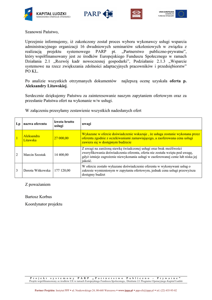 Szanowni Państwo, Uprzejmie informujemy, iż zakończony został proces wyboru wykonawcy usługi wsparcia administracyjnego organizacji 16 dwudniowych seminariów szkoleniowych w związku z realizacją projektu systemowego PARP pt. „Partnerstwo publiczno-prywatne”, który współfinansowany jest ze środków Europejskiego Funduszu Społecznego w ramach Działania 2.1 „Rozwój kadr nowoczesnej gospodarki”, Podziałanie 2.1.3 „Wsparcie systemowe na rzecz zwiększania zdolności adaptacyjnych pracowników i przedsiębiorstw” PO KL. Po analizie wszystkich otrzymanych dokumentów Aleksandry Litawskiej. najlepszą ocenę uzyskała oferta p. Serdecznie dziękujemy Państwu za zainteresowanie naszym zapytaniem ofertowym oraz za przesłanie Państwa ofert na wykonanie w/w usługi. W załączeniu przesyłamy zestawienie wszystkich nadesłanych ofert Lp nazwa oferenta 1 Aleksandra Litawska kwota brutto usługi uwagi 27 000,00 Wykazane w ofercie doświadczenie wskazuje , że usługa zostanie wykonana przez oferenta zgodnie z oczekiwaniami zamawiającego, a zaoferowana cena usługi zawiera się w dostępnym budżecie 2 Marcin Szostak 14 400,00 Z uwagi na zaniżoną stawkę świadczonej usługi oraz brak możliwości zweryfikowania doświadczenia oferenta, oferta nie została wzięta pod uwagę, gdyż istnieje zagrożenie niewykonania usługi w zaoferowanej cenie lub niska jej jakość. 3 Dorota Witkowska 177 120,00 W ofercie zostało wykazane doświadczenie oferenta w wykonywani usług o zakresie wymienionym w zapytaniu ofertowym, jednak cena usługi przewyższa dostępny budżet Z poważaniem Bartosz Korbus Koordynator projektu P r o j e k t s y s t e m o w y P A R P „ P a r t n e r s t w o P u b l i c z n o - P r y w a t n e ” Projekt współfinansowany ze środków UE w ramach Europejskiego Funduszu Społecznego, Działanie 2.1 Programu Operacyjnego Kapitał Ludzki Partner Projektu: Instytut PPP ul. Noakowskiego 24, 00-668 Warszawa www.ippp.pl [email protected] tel. (22) 435-95-02