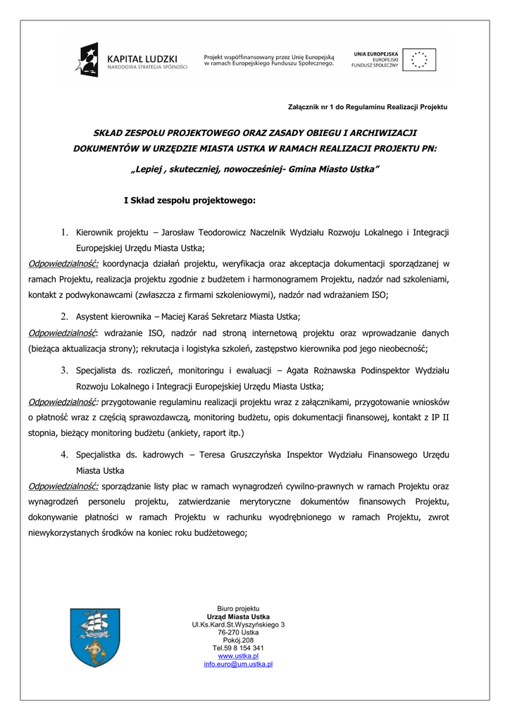 Załącznik nr 1 do Regulaminu Realizacji Projektu SKŁAD ZESPOŁU PROJEKTOWEGO ORAZ ZASADY OBIEGU I ARCHIWIZACJI DOKUMENTÓW W URZĘDZIE MIASTA USTKA W RAMACH REALIZACJI PROJEKTU PN: „Lepiej , skuteczniej, nowocześniej- Gmina Miasto Ustka” I Skład zespołu projektowego: 1. Kierownik projektu – Jarosław Teodorowicz Naczelnik Wydziału Rozwoju Lokalnego i Integracji Europejskiej Urzędu Miasta Ustka; Odpowiedzialność: koordynacja działań projektu, weryfikacja oraz akceptacja dokumentacji sporządzanej w ramach Projektu, realizacja projektu zgodnie z budżetem i harmonogramem Projektu, nadzór nad szkoleniami, kontakt z podwykonawcami (zwłaszcza z firmami szkoleniowymi), nadzór nad wdrażaniem ISO; 2. Asystent kierownika – Maciej Karaś Sekretarz Miasta Ustka; Odpowiedzialność: wdrażanie ISO, nadzór nad stroną internetową projektu oraz wprowadzanie danych (bieżąca aktualizacja strony); rekrutacja i logistyka szkoleń, zastępstwo kierownika pod jego nieobecność; 3. Specjalista ds. rozliczeń, monitoringu i ewaluacji – Agata Rożnawska Podinspektor Wydziału Rozwoju Lokalnego i Integracji Europejskiej Urzędu Miasta Ustka; Odpowiedzialność: przygotowanie regulaminu realizacji projektu wraz z załącznikami, przygotowanie wniosków o płatność wraz z częścią sprawozdawczą, monitoring budżetu, opis dokumentacji finansowej, kontakt z IP II stopnia, bieżący monitoring budżetu (ankiety, raport itp.) 4. Specjalistka ds. kadrowych – Teresa Gruszczyńska Inspektor Wydziału Finansowego Urzędu Miasta Ustka Odpowiedzialność: sporządzanie listy płac w ramach wynagrodzeń cywilno-prawnych w ramach Projektu oraz wynagrodzeń personelu projektu, zatwierdzanie merytoryczne dokumentów finansowych Projektu, dokonywanie płatności w ramach Projektu w rachunku wyodrębnionego w ramach Projektu, zwrot niewykorzystanych środków na koniec roku budżetowego; Biuro projektu Urząd Miasta Ustka Ul.Ks.Kard.St.Wyszyńskiego 3 76-270 Ustka Pokój.208 Tel.59 8 154 341 www.ustka.pl [email protected] 5. Specjalistka ds. obsługi księgowo – finansowej Małgorzata Górska Inspektor Wydziału Finansowego Odpowiedzialność: księgowanie dokumentów zgodnie z wytycznymi Programu Operacyjnego Kapitał Ludzki 2007-2013; 6. Specjalistka ds. zamówień publicznych – Mariola Tomas Różycka Samodzielne stanowisko ds. zamówień publicznych Odpowiedzialność: prawidłowe wydatkowanie środków w ramach projektu – zgodnie z ustawą Prawo zamówień publicznych z dnia 29 stycznia 2004 roku z późniejszymi zmianami, kontrola i udział nad postępowaniami w sprawie udzielania zamówienia publicznego w ramach Projektu; 7. Specjaliści ds. prawnych – Krzysztof Wenta oraz Aleksandra Gibuła radcowie prawni Odpowiedzialność: całościowy nadzór prawny nad realizacją projektu; Zespół Projektowy zobligowany jest do składania do Biura Projektu do ostatniego dnia roboczego każdego miesiąca Karty Pracy z realizacji swoich obowiązków pełnionych w ramach Projektu. Karty Pracy akceptowane są przez Kierownika Projektu bądź jego Asystenta oraz Burmistrza Miasta Ustka. Kartę Pracy Kierownika Projektu akceptuje Burmistrz Miasta Ustka. II Opis obiegu dokumentów finansowo –księgowych potwierdzających poniesione wydatki: CZYNNOŚĆ PODMIOT MIEJSCE SPOSÓB CZAS 1.Wystawienie Osoba Upoważniony Wystawienie dokumentu Zgodnie dokumentu upoważniona do podmiot i przekazanie go do Biura Obsługi z przepisami potwierdzającego wystawienia Interesanta w celu zarejestrowania prawa poniesienie dokumentu konkretnego wydatku 2.Akceptacja Kierownik Wydział Rozwoju Sprawdzenie dokumentu pod Zgodnie merytoryczna Projektu; Lokalnego i względem merytorycznym z przepisami Asystent Integracji (zgodność z realizowanym prawa kierownika Europejskiej projektem) Biuro projektu Urząd Miasta Ustka Ul.Ks.Kard.St.Wyszyńskiego 3 76-270 Ustka Pokój.208 Tel.59 8 154 341 www.ustka.pl [email protected] Urzędu Miasta i akceptacja kosztów w nim ujętych 3.Opisanie dokumentu Specjalistka ds. Ustka Wydział Rozwoju Opisanie dokumentu zgodnie z Zgodnie zgodnie rozliczeń, Lokalnego i wytycznymi Programu z przepisami z wytycznymi monitoringu i Integracji Operacyjnego Kapitał Ludzki 2007- prawa ewaluacji Europejskiej 2013 Urzędu Miasta 4.Sprawdzenie Specjalista ds. poprawności Zamówień zastosowania Ustawy „Prawo Zamówień Ustka Samodzielne Weryfikacja dokumentu zgodnie Zgodnie stanowisko Urzędu Ustawą „Prawo Zamówień z przepisami Miasta Ustka Publicznych” prawa Publicznych Publicznych” 5.Weryfikacja Specjalistka ds. Wydział Finansowy Weryfikacja dokumentu pod Zgodnie formalno-rachunkowa obsługi księgowo Urzędu Miasta względem formalno-rachunkowym, z przepisami – finansowej; Ustka dekretacja i ewidencja dokumentów prawa Specjalistka ds. księgowych, dokonanie płatności kadrowych (przelew) z wyodrębnionego dla 6.Weryfikacja Skarbnik Miasta Wydział Finansowy projektu rachunku bankowego Potwierdzenie zgodności z planem Zgodnie ostateczna Ustka Urzędu Miasta finansowym z przepisami 7.Zatwierdzenie Burmistrz Miasta Ustka Urząd Miasta Ustka Akceptacja-zatwierdzam prawa Zgodnie Ustka z przepisami prawa III Listy płac: Listy płac dla personelu projektu sporządza specjalistka ds. kadrowych w jednym egzemplarzu na podstawie umowy o pracę oraz decyzji Burmistrza Miasta Ustka o przyznaniu regulaminowego dodatku specjalnego w związku z przyjęciem dodatkowych obowiązków. Listę płac pod względem merytorycznym podpisuje Naczelnik Wydziału Spraw Obywatelskich i Administracyjno Gospodarczych Pani Danuta Groszek bądź Zastępca Naczelnika Wydziału Spraw Obywatelskich i Administracyjno Biuro projektu Urząd Miasta Ustka Ul.Ks.Kard.St.Wyszyńskiego 3 76-270 Ustka Pokój.208 Tel.59 8 154 341 www.ustka.pl [email protected] Gospodarczych Pani Renata Kromrych/Skarbnik Miasta Ustka Urszula Pietrasiewicz/Zastępca Skarbnika Miasta Ustka Pani Beata Rogowska/Burmistrz Miasta Ustka Jan