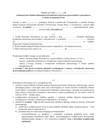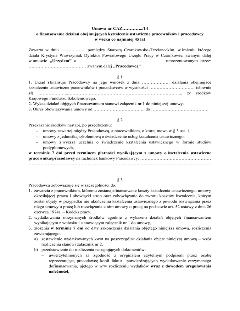 Umowa nr CAZ…………../14 o finansowanie działań obejmujących kształcenie ustawiczne pracowników i pracodawcy w wieku co najmniej 45 lat Zawarta w dniu …………….. pomiędzy Starostą Czarnkowsko-Trzcianeckim, w imieniu którego działa Krystyna Wawrzyniak Dyrektor Powiatowego Urzędu Pracy w Czarnkowie, zwanym dalej w umowie „Urzędem” a ………………………………………………… reprezentowanym przez: ………………………………… zwanym dalej „Pracodawcą” §1 1. Urząd sfinansuje Pracodawcy na jego wniosek z dnia ………………. działania obejmujące kształcenie ustawiczne pracowników i pracodawców w wysokości …………………………. (słownie zł) ………………...…………………………………………………………………... ze środków Krajowego Funduszu Szkoleniowego. 2. Wykaz działań objętych finansowaniem stanowi załącznik nr 1 do niniejszej umowy. 3. Okres obowiązywania umowy od …………………………….. do ………………………………… §2 Przekazanie środków nastąpi, po przedłożeniu: umowy zawartej między Pracodawcą, a pracownikiem, o której mowa w § 3 ust. 1, umowy z jednostką szkoleniową o świadczenie usług kształcenia ustawicznego, umowy z wyższą uczelnią o świadczenie kształcenia ustawicznego w formie studiów podyplomowych, w terminie 7 dni przed terminem płatności wynikającym z umowy o kształcenia ustawiczne pracownika/pracodawcy na rachunek bankowy Pracodawcy: ………………………………………… …………………………………………………………………………………………………………… §3 Pracodawca zobowiązuje się w szczególności do: 1. zawarcia z pracownikiem, któremu zostaną sfinansowane koszty kształcenia ustawicznego, umowy określającej prawa i obowiązki stron oraz zobowiązanie do zwrotu kosztów kształcenia, którym został objęty w przypadku nie ukończenia kształcenia ustawicznego z powodu rozwiązania przez niego umowy o pracę lub rozwiązania z nim umowy o pracę na podstawie art. 52 ustawy z dnia 26 czerwca 1974r. – Kodeks pracy, 2. wydatkowania otrzymanych środków zgodnie z wykazem działań objętych finansowaniem wynikającym z wniosku i stanowiącym załącznik nr 1 do umowy, 3. złożenia w terminie 7 dni od daty zakończenia działania objętego niniejszą umową, rozliczenia zawierającego: a) zestawienie wydatkowanych kwot na poszczególne działania objęte niniejszą umową – wzór rozliczenia stanowi załącznik nr 2. b) przedstawienie do rozliczenia następujących dokumentów: uwierzytelnionych za zgodność z oryginałem czytelnym podpisem przez osobę reprezentującą pracodawcę kopii faktur potwierdzających wydatkowanie otrzymanego dofinansowania, ujętego w w/w rozliczeniu wydatków wraz z dowodem uregulowania należności, c) w przypadku finansowania studiów podyplomowych należy przedłożyć dowód uregulowania należności oraz zaświadczenie z uczelni o kontynowaniu studiów podyplomowych przez osobę objętą finansowaniem, 4. Przedłożenia w terminie 7 dni od daty zakończenia działania objętego finansowaniem, stosownych zaświadczeń lub innych dokumentów potwierdzających ukończenie działania i uzyskanie uprawnień lub kwalifikacji, 5. Przekazania na żądanie Urzędu danych dotyczących: a) liczby osób objętych działaniami finansowanymi z udziałem środków Krajowego Funduszu Szkoleniowego, według płci, grup wieku 15-24 lata, 25-34 lata, 35-44 lata, 45 lat i więcej, poziomu wykształcenia oraz liczby osób pracujących w szczególnych warunkach lub wykonujących prace o szczególnym charakterze, b) liczby osób, które rozpoczęły kurs, studia podyplomowe lub przystąpiły do egzaminu – finansowane z udziałem środków Krajowego Funduszu Szkoleniowego, c) liczby, osób, które ukończyły z wynikiem pozytywnym kurs, studia podyplomowe lub zdały egzamin - finansowane z udziałem środków Krajowego Funduszu Szkoleniowego, 6. Każdorazowego, niezwłocznego informowania Urzędu o każdym przypadku przerwania kształcenia ustawicznego przez osobę objętą finansowaniem, rozwiązania z pracownikiem umowy o pracę w trakcie trwania kształcenia ustawicznego lub innych istotnych zdarzeń mających wpływ na realizację niniejszej umowy. §4 Urząd ma prawo wypowiedzieć za dwutygodniowym wypowiedzeniem zawartą umowę w przypadku: 1. niewykorzystania lub wykorzystania przyznanych środków niezgodnie z przeznaczeniem, 2. nieukończenia kształcenia ustawicznego przez uczestnika, 3. złożenia niezgodnych z prawdą oświadczeń, zaświadczeń lub informacji, 4. naruszenia innych warunków umowy, 5. rozwiązania przez Pracodawcę umowy o pracę z pracownikiem w trakcie trwania kształcenia ustawicznego w części dotyczącej tego pracownika. §5 Pracownik, który nie ukończył kształcenia ustawicznego finansowanego ze środków Krajowego funduszu Szkoleniowego z powodu rozwiązania przez niego umowy o pracę lub rozwiązania z nim umowy o pracę na podstawie art. 52 ustawy z dnia 26 czerwca 1974r. – Kodeks pracy, jest zobowiązany do zwrotu pracodawcy poniesionych kosztów, na zasadach określonych w umowie z pracodawcą o której mowa w § 3 ust. 1. §6 1. Pracodawca zobowiązuje się do zwrotu Urzędowi środków Krajowego Funduszu Szkoleniowego wydanych na kształcenie ustawiczne pracownika w terminie 7 dni od daty otrzymania wezwania urzędu w przypadku o którym mowa w § 5. 2. Pracodawca zobowiązuje się do zwrotu Urzędowi środków Krajowego Funduszu Szkoleniowego wydanych na kształcenie ustawiczne pracownika w terminie 7 dni od daty otrzymania wezwania urzędu w przypadku: a) niewykorzystania lub wykorzystania przyznanych środków niezgodnie z przeznaczeniem, b) nieukończenia kształcenia ustawicznego przez uczestnika, c) złożenia niezgodnych z prawdą oświadczeń, zaświadczeń lub informacji, d) na