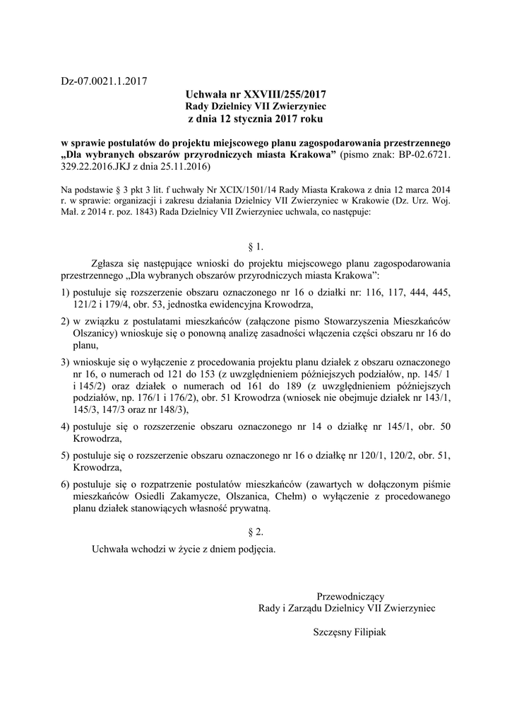 Dz-07.0021.1.2017 Uchwała nr XXVIII/255/2017 Rady Dzielnicy VII Zwierzyniec z dnia 12 stycznia 2017 roku w sprawie postulatów do projektu miejscowego planu zagospodarowania przestrzennego „Dla wybranych obszarów przyrodniczych miasta Krakowa” (pismo znak: BP-02.6721. 329.22.2016.JKJ z dnia 25.11.2016) Na podstawie § 3 pkt 3 lit. f uchwały Nr XCIX/1501/14 Rady Miasta Krakowa z dnia 12 marca 2014 r. w sprawie: organizacji i zakresu działania Dzielnicy VII Zwierzyniec w Krakowie (Dz. Urz. Woj. Mał. z 2014 r. poz. 1843) Rada Dzielnicy VII Zwierzyniec uchwala, co następuje: § 1. Zgłasza się następujące wnioski do projektu miejscowego planu zagospodarowania przestrzennego „Dla wybranych obszarów przyrodniczych miasta Krakowa”: 1) postuluje się rozszerzenie obszaru oznaczonego nr 16 o działki nr: 116, 117, 444, 445, 121/2 i 179/4, obr. 53, jednostka ewidencyjna Krowodrza, 2) w związku z postulatami mieszkańców (załączone pismo Stowarzyszenia Mieszkańców Olszanicy) wnioskuje się o ponowną analizę zasadności włączenia części obszaru nr 16 do planu, 3) wnioskuje się o wyłączenie z procedowania projektu planu działek z obszaru oznaczonego nr 16, o numerach od 121 do 153 (z uwzględnieniem późniejszych podziałów, np. 145/ 1 i 145/2) oraz działek o numerach od 161 do 189 (z uwzględnieniem późniejszych podziałów, np. 176/1 i 176/2), obr. 51 Krowodrza (wniosek nie obejmuje działek nr 143/1, 145/3, 147/3 oraz nr 148/3), 4) postuluje się o rozszerzenie obszaru oznaczonego nr 14 o działkę nr 145/1, obr. 50 Krowodrza, 5) postuluje się o rozszerzenie obszaru oznaczonego nr 16 o działkę nr 120/1, 120/2, obr. 51, Krowodrza, 6) postuluje się o rozpatrzenie postulatów mieszkańców (zawartych w dołączonym piśmie mieszkańców Osiedli Zakamycze, Olszanica, Chełm) o wyłączenie z procedowanego planu działek stanowiących własność prywatną. § 2. Uchwała wchodzi w życie z dniem podjęcia. Przewodniczący Rady i Zarządu Dzielnicy VII Zwierzyniec Szczęsny Filipiak Uzasadnienie: Ad. 1. Pomimo włączenia powyższych działek w obszar procedowanego miejscowego planu zagospodarowania przestrzennego „Balice II” Rada Dzielnicy uznaje, że stanowią one obszar cenny przyrodniczo, który bardziej wpisuje się w charakter tworzonego planu „Dla wybranych obszarów przyrodniczych miasta Krakowa”. Ad. 2. Włączenie zaproponowanych obszarów w rejonie Olszanicy do planu budzi protesty wśród mieszkańców, którzy zgłaszali analogiczne uwagi na etapie procedowania Studium uwarunkowań i kierunków zagospodarowania przestrzennego Miasta Krakowa. Podpisy załączone do pisma mieszkańców pozostają do wglądu w siedzibie Rady Dzielnicy. Ad. 3. Na w/w teren złożony jest wniosek o wydanie W/Z wnioskowany przez 100% właścicieli działek, dotyczący zabudowy budynkami mieszkalnymi jednorodzinnymi wolnostojącymi. Również złożony jest wniosek do Komisji Architektury i Planowania Przestrzennego Rady Miasta Krakowa o zmianę punktową przeznaczenia terenu w Studium uwarunkowań i kierunków zagospodarowania przestrzennego Miasta Krakowa z Z.R na MN z dnia 2015-02-06, który do dnia dzisiejszego nie został rozpatrzony. Ad.4, 5, 6. Wyłączenie powyższych działek stanowiących własność Skarbu Państwa, przy równoczesnym włączeniu do projektu planu okolicznych działek stanowiących własność prywatną, stanowi o nierównym wobec prawa traktowaniu obywateli (w tym przypadku mieszkańców, właścicieli działek położonych w obszarach objętych planem).