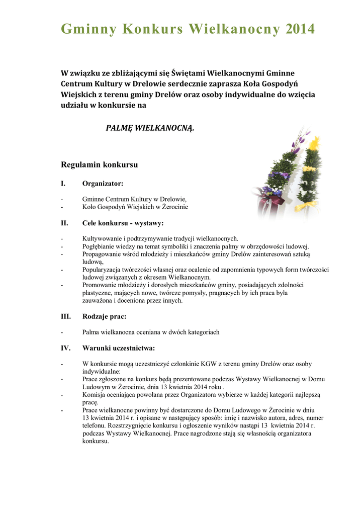 Gminny Konkurs Wielkanocny 2014 W związku ze zbliżającymi się Świętami Wielkanocnymi Gminne Centrum Kultury w Drelowie serdecznie zaprasza Koła Gospodyń Wiejskich z terenu gminy Drelów oraz osoby indywidualne do wzięcia udziału w konkursie na PALMĘ WIELKANOCNĄ. Regulamin konkursu I. Organizator: - Gminne Centrum Kultury w Drelowie, Koło Gospodyń Wiejskich w Żerocinie II. Cele konkursu - wystawy: - Kultywowanie i podtrzymywanie tradycji wielkanocnych. Pogłębianie wiedzy na temat symboliki i znaczenia palmy w obrzędowości ludowej. Propagowanie wśród młodzieży i mieszkańców gminy Drelów zainteresowań sztuką ludową, Popularyzacja twórczości własnej oraz ocalenie od zapomnienia typowych form twórczości ludowej związanych z okresem Wielkanocnym. Promowanie młodzieży i dorosłych mieszkańców gminy, posiadających zdolności plastyczne, mających nowe, twórcze pomysły, pragnących by ich praca była zauważona i doceniona przez innych. - III. Rodzaje prac: - Palma wielkanocna oceniana w dwóch kategoriach IV. Warunki uczestnictwa: - W konkursie mogą uczestniczyć członkinie KGW z terenu gminy Drelów oraz osoby indywidualne: Prace zgłoszone na konkurs będą prezentowane podczas Wystawy Wielkanocnej w Domu Ludowym w Żerocinie, dnia 13 kwietnia 2014 roku . Komisja oceniająca powołana przez Organizatora wybierze w każdej kategorii najlepszą pracę. Prace wielkanocne powinny być dostarczone do Domu Ludowego w Żerocinie w dniu 13 kwietnia 2014 r. i opisane w następujący sposób: imię i nazwisko autora, adres, numer telefonu. Rozstrzygnięcie konkursu i ogłoszenie wyników nastąpi 13 kwietnia 2014 r. podczas Wystawy Wielkanocnej. Prace nagrodzone stają się własnością organizatora konkursu. - V. Kryteria oceny: - Zadaniem uczestników w każdej kategorii jest wykonanie tradycyjnej palmy wielkanocnej; Materiał do wykonania palmy (naturalny): żarnowiec, bukszpan, bazie, suche kwiaty, krepina ,bibuła, wstążka, wydmuszki, zboża, trawy, krzewy iglaste; VI. Palmy oceniane będą w dwóch kategoriach: - I KATEGORIA – ZESPOŁOWA W konkursie biorą udział palmy wykonane przez członków KGW i innych organizacji działających na terenie Gminy Drelów. Zadaniem ich jest wykonanie jednej palmy na każdą placówkę lub zespól. Palma musi mieć wysokość powyżej 1 metra. II KATEGORIA - INDYWIDUALNA Uczestnikami konkursu są osoby indywidualne, bez względu na wiek, które mają pomysł na stworzenie oryginalnej i niepowtarzalnej palmy wielkanocnej, opartej na motywach tradycyjnych. Palma może mieć wysokość poniżej 1 metra. - VII. Warunki oceny: Organizator powoła co najmniej 3-osobową Komisję Konkursową, która oceniając palmy będzie brać pod uwagę następujące kryteria: - Różnorodność użytych materiałów tworzących palmy, Tradycyjne techniki tworzenia motywów tworzących palmy, Walory estetyczne (kompozycja, dobór barw, architektura bryły), Nawiązanie do tradycyjnych palm wielkanocnych. Prace wykonane niesamodzielnie lub zawierające sztuczne gotowe materiały i ozdoby, nie będą oceniane. VIII. Nagrody: I kat: Trzy pierwsze miejsca nagrody pieniężne dla instytucji oraz wyróżnienia II kat: Pierwsza nagroda pieniężna, pozostałe - nagrody rzeczowe. IX. Postanowienia końcowe: 1. Komisja konkursu jest niezawisła w swojej ocenie. Jej werdykt jest niepodważalny i ostateczny. Przebieg prac komisji będzie udokumentowany w protokole. 2. Organizator dokonuje interpretacji zapisów niniejszego regulaminu i rozstrzyga ostatecznie zgłaszane kwestie sporne.