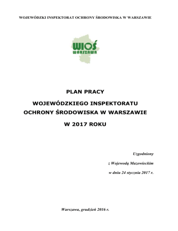 WOJEWÓDZKI INSPEKTORAT OCHRONY ŚRODOWISKA W WARSZAWIE PLAN PRACY WOJEWÓDZKIEGO INSPEKTORATU OCHRONY ŚRODOWISKA W WARSZAWIE W 2017 ROKU Uzgodniony z Wojewodą Mazowieckim w dniu 24 stycznia 2017 r. Warszawa, grudzień 2016 r. SPIS TREŚCI 1. Zakres planu kontroli ..................................................................................................................... 4 1.1. Obszar objęty planem kontroli i monitoringiem środowiska ................................................... 4 1.2. Zadania, kompetencje i zobowiązania ustawowe do przeprowadzania inspekcji .................... 5 1.3. Polityki środowiskowe i priorytety wymagające uwzględnienia ............................................. 5 1.4. Obowiązujące przepisy ............................................................................................................ 6 1.5. Struktura organizacyjna............................................................................................................ 6 1.6. Zakres działań kontrolnych ...................................................................................................... 7 1.7. Zasoby .................................................................................................................................... 11 1.8. Budżet..................................................................................................................................... 11 2. Środowisko, czynności i zakłady ................................................................................................. 15 2.1. Ogólna ocena znaczących zagadnień dotyczących środowiska ............................................. 15 2.2. Ogólna ocena znaczących zagadnień dotyczących bezpieczeństwa (w odniesieniu do zakładów o zwiększonym ryzyku i zakładów o dużym ryzyku wystąpienia poważnej awarii) ............................................................................................................................................. 15 2.3. Konkretne, tematyczne zagadnienia ochrony środowiska na obszarze województwa mazowieckiego ....................................................................................................................... 19 2.4. Kontrolowane czynności ........................................................................................................ 27 2.5. Zachowanie w zakresie zgodności GIOŚ ............................................................................... 29 3. Wyniki planowane na rok 2017 ................................................................................................... 33 3.1. Priorytety z uzasadnieniem .................................................................................................... 33 3.2. Procedury dla kontroli planowych, w tym procedury opracowywania programów kontroli planowych .............................................................................................................................. 36 3.3. Procedury dla kontroli nieplanowych .................................................................................... 37 3.4. Procedury dla koordynacji z organizacjami partnerskimi ...................................................... 38 3.5. Procedury weryfikacji planu kontroli ..................................................................................... 39 3.6. Zasoby .................................................................................................................................... 40 4. Działania kontrolne na rok 2017 .................................................................................................. 41 4.1. Planowane kontrole ................................................................................................................ 41 4.2. Zakłady ................................................................................................................................... 42 4.3. Grupy zakładów, których zlokalizowanie względem siebie może spowodować efekt domina. ............................................................................................................................................. 42 4.4. Kontrole pozaplanowe............................................................................................................ 42 4.5. Wnioski o interwencje ............................................................................................................ 43 4.6. Wypadki i zdarzenia ............................................................................................................... 43 2 4.7. Inne czynności ........................................................................................................................ 44 5. Program państwowego monitoringu środowiska w roku 2017 .................................................... 45 5.1. Badanie stanu środowiska ...................................................................................................... 45 5.2. Bazy danych PMŚ .................................................................................................................. 52 5.3. Gromadzenie wyników badań z zakresu Państwowego Monitoringu Środowiska i terminowe przekazywanie danych do baz krajowych .............................................................................. 52 5.4. Upowszechnianie informacji o środowisku ........................................................................... 54 5.5. Ryzyko odstępstw i niewykonania Planu pracy w Wydziale Monitoringu Środowiska........ 55 6. Plan pracy Laboratorium .............................................................................................................. 56 6.1. Procedury dotyczące działalności analityczno-pomiarowej .................................................. 56 6.2. Zadania organizacyjne............................................................................................................ 56 7. Plan pracy 