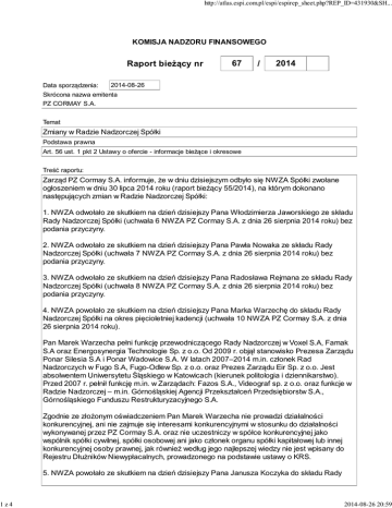 1z4 http://atlas.espi.com.pl/espi/espirep_sheet.php?REP_ID=431930&SH... KOMISJA NADZORU FINANSOWEGO Raport bieżący nr Data sporządzenia: 67 / 2014 2014-08-26 Skrócona nazwa emitenta PZ CORMAY S.A. Temat Zmiany w Radzie Nadzorczej Spółki Podstawa prawna Art. 56 ust. 1 pkt 2 Ustawy o ofercie - informacje bieżące i okresowe Treść raportu: Zarząd PZ Cormay S.A. informuje, że w dniu dzisiejszym odbyło się NWZA Spółki zwołane ogłoszeniem w dniu 30 lipca 2014 roku (raport bieżący 55/2014), na którym dokonano następujących zmian w Radzie Nadzorczej Spółki: 1. NWZA odwołało ze skutkiem na dzień dzisiejszy Pana Włodzimierza Jaworskiego ze składu Rady Nadzorczej Spółki (uchwała 6 NWZA PZ Cormay S.A. z dnia 26 sierpnia 2014 roku) bez podania przyczyny. 2. NWZA odwołało ze skutkiem na dzień dzisiejszy Pana Pawła Nowaka ze składu Rady Nadzorczej Spółki (uchwała 7 NWZA PZ Cormay S.A. z dnia 26 sierpnia 2014 roku) bez podania przyczyny. 3. NWZA odwołało ze skutkiem na dzień dzisiejszy Pana Radosława Rejmana ze składu Rady Nadzorczej Spółki (uchwała 8 NWZA PZ Cormay S.A. z dnia 26 sierpnia 2014 roku) bez podania przyczyny. 4. NWZA powołało ze skutkiem na dzień dzisiejszy Pana Marka Warzechę do składu Rady Nadzorczej Spółki na okres pięcioletniej kadencji (uchwała 10 NWZA PZ Cormay S.A. z dnia 26 sierpnia 2014 roku). Pan Marek Warzecha pełni funkcję przewodniczącego Rady Nadzorczej w Voxel S.A, Famak S.A oraz Energosynergia Technologie Sp. z o.o. Od 2009 r. objął stanowisko Prezesa Zarządu Ponar Silesia S.A i Ponar Wadowice S.A. W latach 2007–2014 m.in. członek Rad Nadzorczych w Fugo S.A, Fugo-Odlew Sp. z o.o. oraz Prezes Zarządu Eir Sp. z o.o. Jest absolwentem Uniwersytetu Śląskiego w Katowicach (kierunek politologia i dziennikarstwo). Przed 2007 r. pełnił funkcję m.in. w Zarządach: Fazos S.A., Videograf sp. z o.o. oraz funkcje w Radzie Nadzorczej – m.in. Górnośląskiej Agencji Przekształceń Przedsiębiorstw S.A., Górnośląskiego Funduszu Restrukturyzacyjnego S.A. Zgodnie ze złożonym oświadczeniem Pan Marek Warzecha nie prowadzi działalności konkurencyjnej, ani nie zajmuje się interesami konkurencyjnymi w stosunku do działalności wykonywanej przez PZ Cormay S.A. oraz nie uczestniczy w spółce konkurencyjnej jako wspólnik spółki cywilnej, spółki osobowej ani jako członek organu spółki kapitałowej lub innej konkurencyjnej osoby prawnej, jak również według jego najlepszej wiedzy nie jest wpisany do Rejestru Dłużników Niewypłacalnych, prowadzonego na podstawie ustawy o KRS. 5. NWZA powołało ze skutkiem na dzień dzisiejszy Pana Janusza Koczyka do składu Rady 2014-08-26 20:59 2z4 http://atlas.espi.com.pl/espi/espirep_sheet.php?REP_ID=431930&SH... Nadzorczej Spółki na okres pięcioletniej kadencji (uchwała 11 NWZA PZ Cormay S.A. z dnia 26 sierpnia 2014 roku). Pan Janusz Koczyk jest udziałowcem spółek kapitałowych na rynku prywatnym. W latach 1995-2009 pełnił funkcję Wiceprezesa, a następnie Prezesa Trinity Management Sp. z o.o. w tym samym czasie obejmując stanowisko Wiceprezesa, a następnie Prezesa Jupiter NFI S.A. W latach 1991-1995 zatrudniony w Centralnym Biurze Maklerskim Banku Pekao S.A., na kolejnych stanowiskach do Dyrektora Departamentu Emisji i Gwarancji CDM Pekao S.A. Pełni funkcje Przewodniczącego/Członka Rady Nadzorczej następujących spółek: Huta Pokój S.A., Pepees S.A., Wrozamet S.A., Vistula S.A., Erg Pustków S.A., Mega Plus S.A., Parkiet Sp. z o.o., Ceramika Nowa Gala S.A., Energomontaż Północ S.A., Pro Futuro S.A., DataCom S.A., Wisene Sp. z o.o., Ponar Silesia S.A., Ponar Wadowice S.A. Jako magister ekonomii na Wydziale Handlu Zagranicznego SGPiS zdobył doświadczenie w zakresie corporate governance wielu firm, organizacji procesów sprzedaży akcji/podniesienia kapitału w ramach ofert publicznych, prowadzeniu negocjacji zakupu akcji spółek do portfeli inwestycyjnych funduszy oraz współtworzył pierwsze emisje rządowych papierów wartościowych i gwarancji emisji papierów wartościowych na polskim rynku kapitałowym. Zgodnie ze złożonym oświadczeniem Pan Janusz Koczyk nie prowadzi działalności konkurencyjnej, ani nie zajmuje się interesami konkurencyjnymi w stosunku do działalności wykonywanej przez PZ Cormay S.A. oraz nie uczestniczy w spółce konkurencyjnej jako wspólnik spółki cywilnej, spółki osobowej ani jako członek organu spółki kapitałowej lub innej konkurencyjnej osoby prawnej, jak również według jego najlepszej wiedzy nie jest wpisany do Rejestru Dłużników Niewypłacalnych, prowadzonego na podstawie ustawy o KRS. 6. NWZA powołało ze skutkiem na dzień dzisiejszy Pana Piotr Augustyniaka do składu Rady Nadzorczej Spółki na okres pięcioletniej kadencji (uchwała 12 NWZA PZ Cormay S.A. z dnia 26 sierpnia 2014 roku). Pan Piotr Augustyniak jest absolwentem Wydział Filologii oraz Wydziału Zarządzania Uniwersytetu Warszawskiego. W latach 1991-1992 był zatrudniony w New York Times (Warszawa) na stanowisku tłumacza. W latach 1992-1993 był asystentem oficera finansowego w Fundacji Przekształceń Własnościowych przy Ministerstwie Przekształceń Własnościowych. W latach 1993-1994 kierował zespołem prywatyzacyjnym oraz był kierownikiem projektu w Ministerstwie Przekształceń Własnościowych, W latach 1994-2011 był związany z Enterprise Investors (EI) jako partner (2006-2011, odpowiedzialny za monitoring, wprowadzanie spółek na GPW, transakcje sprzedaży znaczących pakietów akcji spółek portfela EI na rynku publicznym i prywatnym, członek rad nadzorczych spółek portfela EI: Polfa Kutno, Energoaparatura, Elektrobudowa, Wizów, Sfinks, CSS, Bauma, Comp, Comp Rzeszów (obecenie Asseco Poland), Agros Nova, Teta, Opoczno, AB, Siveco (Rumunia), STD Donivo (Słowacja), AVG Technologis (Holandia), wiceprezes, dyrektor inwestycyjny, analityk. Jego główne osiągnięcia w EI to: udział w ponad 40 transakcjac