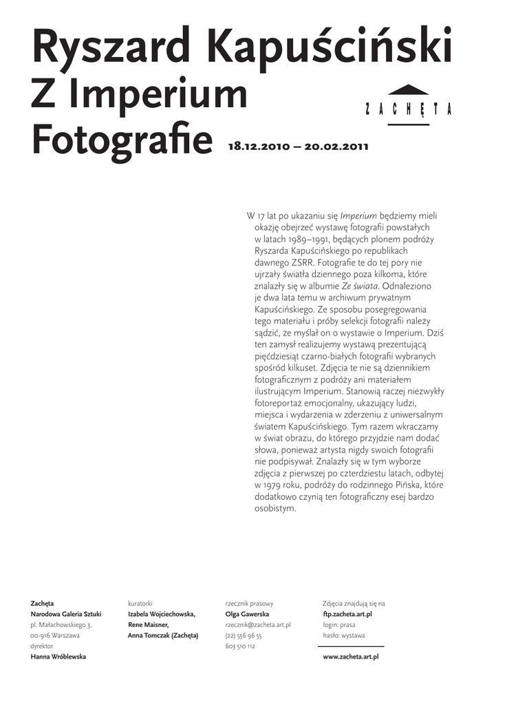 Ryszard Kapuściński Z Imperium Fotografie 18.12.2010 – 20.02.2011 W 17 lat po ukazaniu się Imperium będziemy mieli okazję obejrzeć wystawę fotografii powstałych w latach 1989–1991, będących plonem podróży Ryszarda Kapuścińskiego po republikach dawnego ZSRR. Fotografie te do tej pory nie ujrzały światła dziennego poza kilkoma, które znalazły się w albumie Ze świata. Odnaleziono je dwa lata temu w archiwum prywatnym Kapuścińskiego. Ze sposobu posegregowania tego materiału i próby selekcji fotografii należy sądzić, że myślał on o wystawie o Imperium. Dziś ten zamysł realizujemy wystawą prezentującą pięćdziesiąt czarno-białych fotografii wybranych spośród kilkuset. Zdjęcia te nie są dziennikiem fotograficznym z podróży ani materiałem ilustrującym Imperium. Stanowią raczej niezwykły fotoreportaż emocjonalny, ukazujący ludzi, miejsca i wydarzenia w zderzeniu z uniwersalnym światem Kapuścińskiego. Tym razem wkraczamy w świat obrazu, do którego przyjdzie nam dodać słowa, ponieważ artysta nigdy swoich fotografii nie podpisywał. Znalazły się w tym wyborze zdjęcia z pierwszej po czterdziestu latach, odbytej w 1979 roku, podróży do rodzinnego Pińska, które dodatkowo czynią ten fotograficzny esej bardzo osobistym. Zachęta Narodowa Galeria Sztuki pl. Małachowskiego 3, 00-916 Warszawa dyrektor Hanna Wróblewska kuratorki Izabela Wojciechowska, Rene Maisner, Anna Tomczak (Zachęta) rzecznik prasowy Olga Gawerska [email protected] (22) 556 96 55 603 510 112 Zdjęcia znajdują się na ftp.zacheta.art.pl login: prasa hasło: wystawa www.zacheta.art.pl Program edukacyjny towarzyszący wystawie Spotkanie na wystawie z współkuratorką, Anną Tomczak 19 grudnia (niedziela) godz. 12.15 w cenie biletu; spotkanie w holu głównym Patrzeć/Zobaczyć. Sztuka współczesna i seniorzy 21 stycznia 2011 (piątek), godz. 12.15 Prowadzenie: Barbara Dąbrowska i Maria Kosińska Spotkania z cyklu Patrzeć/zobaczyć skierowane są do osób w wieku emerytalnym. Próbują przełamywać istniejące stereotypy o „prawdziwej dawnej sztuce i młodych skandalistach”, wyjaśniają, że sztuka współczesna nie jest niezrozumiała lub trudna i trzeba do niej podejść z odpowiednim dystansem. Seniorzy biorący udział w spotkaniach mają okazję do wyrażenia swojego zdania, dyskusji na temat twórczości artystów oraz konkretnych prac z wystawy. Obowiązują zapisy: Barbara Dąbrowska [email protected], tel. 22 / 566 96 42 Program filmowy towarzyszący wystawie Fotografie prezentowane na wystawie w Zachęcie zostały wykonane przez Ryszarda Kapuścińskiego na przełomie lat 80. i 90. na terenie dawnego ZSRR. Czasy pierestrojki i intensywnych przemian politycznych w Rosji skłoniły reportażystę do podróży, co zaowocowało napisaniem Imperium. Książka ta opisuje w trzech częściach spotkania Kapuścińskiego z Imperium Rosyjskim: w 1939 roku w rodzinnym Pińsku, gdzie jako dziecko był świadkiem pierwszych deportacji na Syberię oraz w latach 1958 i 1967, kiedy podróżował po krajach b. Związku Radzieckiego w czasie największych zmian ustrojowych i początku upadku ZSRR. Ostatnia część Imperium stanowi zbiór refleksji autora. Proponowany program filmowy przybliża opisywane przez Kapuścińskiego momenty w historii Rosji. Podobnie jak zdjęcia prezentowane na wystawie, wybrane filmy dokumentalne i fabularne opowiadają o ludziach — świadkach zdarzeń, których życie zdeterminowała historia. wstęp wolny, spotkanie w holu główny Partner programu Patrzeć/Zobaczyć. Sztuka współczesna i seniorzy Panel dyskusyjny towarzyszący wystawie 24 stycznia 2011 (poniedziałek), godz. 18 uczestnicy: Karolina Wojciechowska, Wojciech Górecki, Sławomir Popowski moderatorka Anna Tomczak Doświadczenie wojny 12 stycznia (środa), godz. 18 Anna reż. Nikita Michałkow, Rosja, 1993, 100 min Paradokument rodzinny z historią w tle. Reżyser co roku zadaje swojej córce podobne, proste pytania dotyczące jej opinii na temat życia, upodobań i zainteresowań. Cykliczne mini-wywiady z Anną pokazują jak zmienia się ona od 6 do 18 roku życia, co dzieje się w jej otoczeniu, jakie możliwości przed nią stają. Zmiana optyki dziewczyny spowodowana jest nie tylko dojrzewaniem emocjonalnym, ale wielkimi przełomami historycznymi. Karolina Wojciechowska (ur. 1981), ukończyła Wydział Prawa i Administracji na Uniwersytecie Warszawskim. Założycielka warszawskiej galerii fotograficznej Green Gallery, którą obecnie prowadzi. Członek zarządu Fundacji imienia Ryszarda Kapuścińskiego — Herodot. Wojciech Górecki (ur. 1970), historyk, dziennikarz, reporter, analityk, specjalizujący się w tematyce rosyjskiej. Ekspert w Zespole Rosyjskim w Ośrodku Studiów Wschodnich im. Marka Karpia.. Tematy badawcze: Kaukaz Północny, relacje Rosja — Kaukaz Południowy i Rosja — Azja Centralna Sławomir Popowski (ur. 1948), dziennikarz i publicysta. Znawca spraw wschodnich. Wykładowca Wyższej Szkoły Dziennikarskiej im. M. Wańkowicza, członek Drugie spotkanie z Imperium Czas żniw reż. Marina Razbieżkina, Rosja, 2004, 65 min 17 stycznia (poniedziałek), godz. 18 Koniec lat czterdziestych XX wieku, czuwaski kołchoz. Młoda dziewczyna wygrywa socjalistyczne zawody, w których główną, honorową nagrodą jest aksamitna chorągiew. Prestiżowe zwycięstwo Tosi usidla ją w mechanizmach współzawodnictwa w kołchozie i socjalistycznej idei przodownictwa pracy. Film zachowany w estetyce malarstwa socrealistycznego opowiada o życiu w lokalnej społeczności wiejskiej. zarządu Fundacji Centrum Prasowe dla Krajów Europy Środkowo-Wschodniej, członek redakcji dwumiesięcznika „Nowa Europa Wschodnia”, wydawanego przez Kolegium Europy Wschodniej im. Jana Nowaka-Jeziorańskiego. W latach 1985 1990 moskiewski korespondent Polskiej Agencji Prasowej, w latach 1991–1995 moskiewski korespondent Rzeczpospolitej. Wraz z Ryszardem Kapuścińskim odbył p