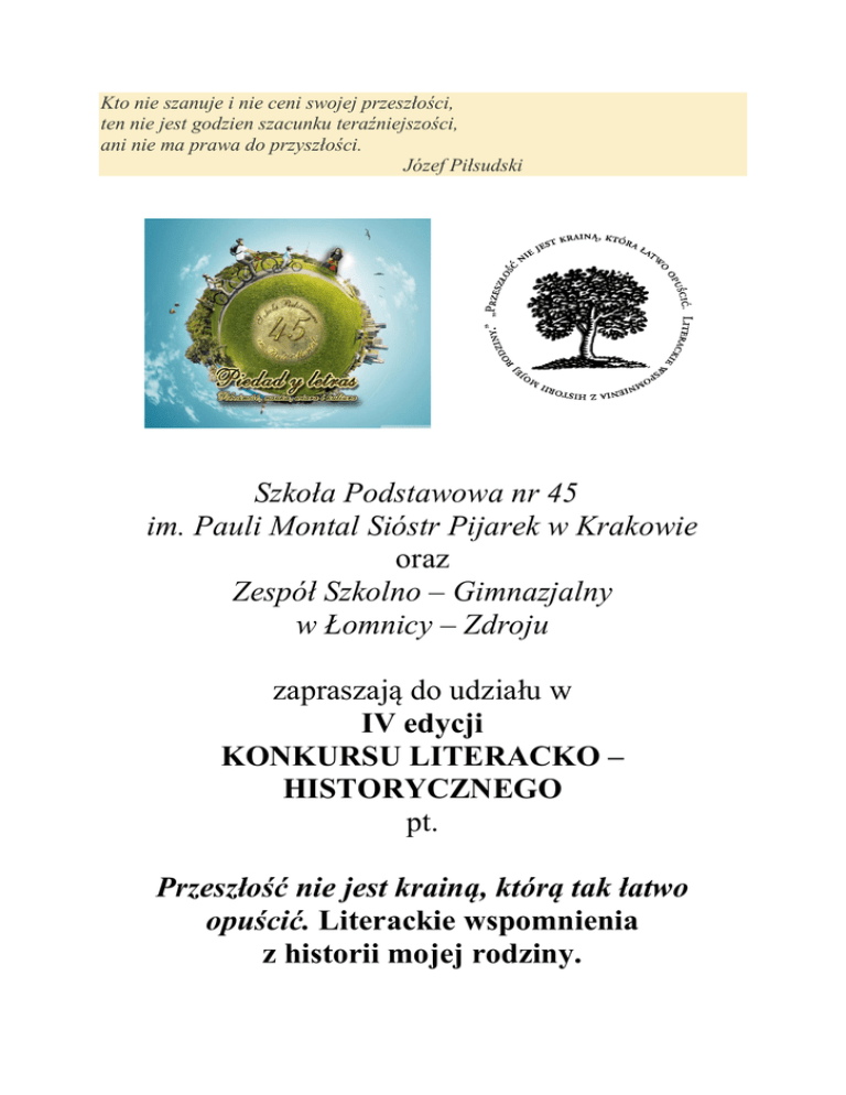 Kto nie szanuje i nie ceni swojej przeszłości, ten nie jest godzien szacunku teraźniejszości, ani nie ma prawa do przyszłości. Józef Piłsudski Szkoła Podstawowa nr 45 im. Pauli Montal Sióstr Pijarek w Krakowie oraz Zespół Szkolno – Gimnazjalny w Łomnicy – Zdroju zapraszają do udziału w IV edycji KONKURSU LITERACKO – HISTORYCZNEGO pt. Przeszłość nie jest krainą, którą tak łatwo opuścić. Literackie wspomnienia z historii mojej rodziny. REGULAMIN 1. Konkurs przeznaczony jest dla uczniów szkół podstawowych i gimnazjalnych województwa małopolskiego oraz szkół zaprzyjaźnionych. Konkurs będzie podzielony na dwie kategorie: I. klasy IV – VI (szkoły podstawowe) II. klasy I – III (szkoły gimnazjalne) 2. Cele konkursu: Zachęcenie uczniów do zapoznawania się z przeszłością własnej rodziny. Pogłębienie wiedzy na temat historii własnej rodziny. Kształcenie umiejętności pisania tekstu literackiego na bliski uczniowi temat. Kształcenie umiejętności zbierania materiału źródłowego i przekładania go na pracę pisemną. Kształcenie umiejętności syntezy faktów historycznych i wykształcenie świadomości ich wpływu na życie codzienne. 3. Konkurs polega na napisaniu opowiadania lub reportażu pokazującego autentyczną historię, która wydarzyła się w rodzinie ucznia w czasie przełomowych wydarzeń historycznych XX/XXI wieku (ok. 1900 – 2015) 4. Praca powinna obejmować maksymalnie 4 strony A4 (czcionka Times New Roman rozmiar 12, interlinia 1,5) w formie wydruku komputerowego lub starannego pisma odręcznego. Do pracy można dołączyć dowolną ilość materiału ikonograficznego. 5. a. b. c. d. Prosimy o opatrzenie prac następującymi informacjami: tytuł pracy, imię i nazwisko autora, jego wiek, imię i nazwisko opiekuna, nazwa, adres, telefon szkoły. 6. Prace należy przesłać do 18.12.2015 (decyduje data stempla pocztowego) na adres: Szkoła Podstawowa nr 45 im. Pauli Montal Sióstr Pijarek w Krakowie ul. Meissnera 20 31-457 Kraków (z dopiskiem KONKURS) 7. Prace oceni jury powołane przez organizatora. 8. Wyniki zostaną ogłoszone najpóźniej 01.02.2016 roku (po feriach zimowych) na stronie internetowej szkoły www.sp45.pijarki.pl, natomiast nagrody przesłane do laureatów pocztą. Nauczyciele – opiekunowie otrzymają dyplomy potwierdzające udział w konkursie. 9. Dodatkowe informacje można uzyskać w sekretariacie SP nr 45 pod numerem telefonu 12 4135770 (osoby koordynujące: mgr Grzegorz Mroczek, nauczyciel języka polskiego (SP45); mgr Beata Miechurska (Gimnazjum w Łomnicy – Zdroju))