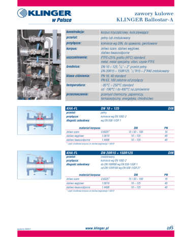 zawory kulowe KLINGER Ballostar-A konstrukcja: korpus trzyczęściowy, kula pływająca przelot: pełny lub zredukowany przyłącza: kołnierze wg DIN, do spawania, gwintowane korpus: żeliwo szare, staliwo węglowe, staliwo kwasoodporne PTFE+25% grafitu (KFC) standard, metal, metal specjalny, viton, czyste PTFE DN 10 ÷ 125, 3/8” ÷ 2” przelot pełny DN 20R15 ÷ 150R125, 1/2”R15 ÷ 2”R40 zredukowany PN 16, 40 standard PN 63, 100 zależnie od przyłączy - 85°C ÷ 250°C standard od -196°C i do 400°C na zamówienie przemysł chemiczny, papierniczy, farmaceutyczny, energetyka, chłodnictwo uszczelnienie: średnice: klasa ciśnienia: temperatura: przeznaczenie: KHA-FL DN 10 ÷ 125 przelot: przyłącza: długość zabudowy: pełny kołnierze wg EN 1092-2 wg EN 558-1/GR 1 materiał korpusu żeliwo szare 0.6025*) staliwo węglowe 1.0619 staliwo kwasoodporne 1.4408 *) DN 15 i 50 ÷ 100 10 ÷ 125 10 ÷ 125 KHA-FL DN 20R15 ÷ 150R125 przelot: przyłącza: długość zabudowy: zredukowany kołnierze wg EN 1092-2 do DN 100R80 wg EN 558-1/GR 1 od DN 125R100 wg EN 558-1/GR 27 staliwo węglowe staliwo kwasoodporne *) PN 16 40 40 część środkowa korpusu ze staliwa węglowego 1.0619 materiał korpusu żeliwo szare 0.6025*) wydanie 2004/1 DIN 1.0619 1.4408 DIN DN 15 i 50 ÷ 100 PN 16 10 ÷ 125 10 ÷ 125 40 40 część środkowa korpusu ze staliwa węglowego 1.0619 www.klinger.pl a6 zawory kulowe KLINGER Ballostar-A KHA-FK DN 65R50 ÷ 100R80 przelot: przyłącza: długość zabudowy: zredukowany kołnierze wg EN 1092-2 wg EN 558-1/GR 27 (krótka) materiał korpusu żeliwo szare 0.6025*) staliwo węglowe 1.0619 staliwo kwasoodporne 1.4408 *) DN 65R50 ÷ 100R80 65R50 ÷ 100R80 65R50 ÷ 100R80 PN 16 40 40 część środkowa korpusu ze staliwa węglowego 1.0619 KHA-SL DN 10 ÷ 125 przelot: przyłącza: długość zabudowy: pełny do spawania wg EN 12627 (długie) do DN 40 wg DIN 3202-S10 od DN 50 wg ANSI B16.10 klasa 300 materiał korpusu staliwo węglowe staliwo węglowe staliwo węglowe staliwo kwasoodporne staliwo kwasoodporne 1.0619 1.0619 1.0619 1.4408 1.4408 DIN DN 10 ÷ 20 25 ÷ 40 50 ÷ 125 10 ÷ 20 25 ÷ 125 KHA-SL DN 20R15 ÷ 100R80 przelot: przyłącza: długość zabudowy: zredukowany do spawania wg EN 12627 (długie) do DN 40R32 wg DIN 3202-S10 od DN 50R40 wg ANSI B16.10 klasa 300 materiał korpusu staliwo węglowe staliwo węglowe staliwo węglowe staliwo kwasoodporne staliwo kwasoodporne 1.0619 1.0619 1.0619 1.4408 1.4408 DN 20R15 ÷ 25R20 32R25 ÷ 50R40 65R50 ÷ 100R80 20R15 ÷ 25R20 32R25 ÷ 100R80 DN 10 ÷ 40 przelot: przyłącza: długość zabudowy: pełny do spawania wg EN 12627 (krótkie) do DN 40 wg DIN 3202-S13 1.0619 1.0619 1.4408 1.4408 www.klinger.pl PN 100 63 40 63 40 DIN KHA-SK materiał korpusu staliwo węglowe staliwo węglowe staliwo kwasoodporne staliwo kwasoodporne wydanie 2004/1 DIN PN 100 63 40 63 40 DIN DN 10 ÷ 20 25 ÷ 40 10 ÷ 20 25 ÷ 40 PN 100 63 63 40 a7 zawory kulowe KLINGER Ballostar-A KHA-SK DN 20R15 ÷ 50R40 przelot: przyłącza: długość zabudowy: zredukowany do spawania wg EN 12627 (krótkie) do DN 40R32 wg DIN 3202-S13 od DN 50R40 wg ANSI B16.10 klasa 300 materiał korpusu staliwo węglowe staliwo węglowe staliwo kwasoodporne staliwo kwasoodporne 1.0619 1.0619 1.4408 1.4408 DN 3/8” ÷ 2” przelot: przyłącza: długość zabudowy: pełny gwint rurowy wg ISO 228/1 wg DIN 3202-M4 DN /8” ÷ 3/4” 1” ÷ 1 1/2” 2” 3 /8” ÷ 3/4” 1” ÷ 2” 3 KHA-G DN 1/2”R15 ÷ 2”R40 przelot: przyłącza: długość zabudowy: zredukowany gwint rurowy wg ISO 228/1 wg DIN 3202-M3 *) PN 100 63 63 40 DIN 1.0619 1.0619 1.0619 1.4408 1.4408 materiał korpusu żeliwo szare 0.6025*) staliwo węglowe 1.0619 staliwo węglowe 1.0619 staliwo kwasoodporne 1.4408 staliwo kwasoodporne 1.4408 wydanie 2004/1 DN 20R15 ÷ 25R20 32R25 ÷ 50R40 20R15 ÷ 25R20 32R25 ÷ 50R40 KHA-G materiał korpusu staliwo węglowe staliwo węglowe staliwo węglowe staliwo kwasoodporne staliwo kwasoodporne DIN DN /2”R15 ÷ 2”R40 3 /4”R15 ÷ 1”R20 1 1 /4”R25 ÷ 2”R40 3 /4”R15 ÷ 1”R20 1 1 /4”R25 ÷ 2”R40 1 PN 100 63 40 63 40 DIN PN 16 100 63 63 40 część środkowa korpusu ze staliwa węglowego 1.0619 www.klinger.pl a8