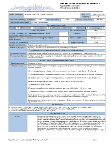 SYLABUS rok akademicki 2016/17 Wydział Ekonomiczny Uniwersytet Gdański Nazwa przedmiotu Gospodarka krajów Europy Środkowej Jednostka prowadząca przedmiot Nazwisko prowadzącego KPG Nazwa kierunku MSG Kod ECTS 14.6.E.SZ.779 Pkt.ECTS 3 Nazwa specjalności HZ;MM; dr Piotr Kuropatwiński Forma zajęć/Liczba godzin Wykład 10 Ćwiczenia 0 Konwersatoria 0 Laboratoria komputerowe Forma aktywności 0 Sumaryczna liczba godzin: 0 0 Lektoraty Rok i rodzaj studiów: 3 NS1, Semestr: 5, Status przedmiotu: Obligatoryjny Język wykładowy: polski Godziny z udziałem nauczyciela akademickiego (w tym konsultacje, egzaminy i inne): Godziny bez udziału nauczyciela akademickiego (samodzielna praca studenta): Seminaria 0 Sposób realizacji zajęć Zajęcia w sali dydaktycznej. Metody dydaktyczne Wykłady z prezentacjami multimedialnymi, Projekty indywidualne, Określenie przedmiotów wprowadzających wraz z wymogami wstępnymi Wymagania formalne Przedmioty, które student powinien wcześniej zaliczyć to mikroekonomia i makroekonomia. Wymagania wstepne Punktem wyjścia do realizacji przedmiotu jest znajomośc podstawowych pojęć i zależności makro i mikroekonomicznych. Sposób i forma zaliczenia oraz kryteria oceny Sposób zaliczenia Kryteria oceny Zaliczenie na ocenę Warunkiem zaliczenia przedmiotu jest przygotowanie projektu w zespole projektowym Temat projektu powinien dotyczyć: (1) wybranego aspektu sytuacji makroekonomicznej w wybranym kraju Europy Środkowej, (2) wybranego aspektu wybranego rynku (sektora gospodarki) w kraju (krajach) Europy Środkowej (3) studium porównawczego wybranego aspektu gospodarki w dwóch krajach Europy Środkowej. Wyniki realizacji projektu powinny zostać przedstawione w trzech formach: (1) prezentacji w formacie ppt, (2) opracowania pisemnego podzielonego przy pomocy śródtytułów (< 5 stron) oraz (3) jednostronicowego dokumentu typu lessons learnt opisującego proces realizacji projektu. Wynik projektu będzie oceniany zgodnie z poniższymi kryteriami: 40% istotność tematyki, 30% atrakcyjność formy ujęcia tematyki, 30% oryginalność zastosowanego podejścia. Na ocenę wpływ ma także aktywność na zajęciach. Skala ocen końcowych jest wyznaczana zgodnie z regulaminem studiów. Cele przedmiotu w zakresie wiedzy: MSG1_W01, MSG1_W02, MSG1_W03, MSG1_W07, MSG1_W10, MSG1_W15, MSG1_W17 w zakresie umiejętności: MSG1_U01, MSG1_U02, MSG1_U03, MSG1_U04, MSG1_U07; w zakresie kompetencji społecznych: MSG1_K05, MSG1_K06 Efekty kształcenia się Wiedza Student zna podstawową terminologię oraz posiada podstawową wiedzę o różnych rodzajach rozwiązań instytucjonalnych stosowanych w różnych krajach Europy Srodkowej oraz o relacjach między nimi.Student dysponuje podstawową i uporządkowaną wiedzą na temat gospodarki i polityki gospodarczej krajów Europy Środkowej i przejawów ich zmian w okresie przed i po akcesji do UE.Student ma podstawową i uporządkowaną wiedzę na temat systemów i norm prawnych, organizacyjnych i kulturowych stosowanych w organizacjach i instytucjach ekonomicznych krajów Europy Środkowej, szczególnie w odniesieniu do działalności przedsiębiorstw na rynku międzynarodowym.Student dysponuje podstawową wiedzą na temat działań wymaganych do spełnienia przez kraje Wszystkie prawa zastrzeżone (c) Piotr Kuropatwiński 1/2 SYLABUS rok akademicki 2016/17 Wydział Ekonomiczny Uniwersytet Gdański Europy Środkowej kryteriów akcesji do UE i wstąpienia do strefy euro oraz sposobów identyfikowania kosztów i korzyści wynikających z ich spełniania. Umiejętności Student umie wykorzystać podstawową wiedzę teoretyczną do diagnozowania przesłanek różnic sposobu funkcjonowania gospodarek krajów Europy Środkowej wynikających z różnic rozwiązań instytucjonalnych i różnic w kulturach organizacyjnych poszczególnych krajów.Student potrafi dokonywać obserwacji i analiz podstawowych procesów gospodarczych zachodzących w krajach Europy Środkowej oraz interpretować tablice porównawcze danych statystycznych i wskaźników ekonomicznych a także formułować ogólne prognozy kształtowania podstawowych wskaźników makroekonomicznych w tych krajach.Student potrafi określać nie tylko kierunki zmian podstawowych parametrów sytuacji makroekonomicznej krajów Europy Środkowej, ale również diagnozować, analizować i nakreślać pożądane kierunki modyfikacji narzędzi polityki gospodarczej realizowanej w tych krajach. Kompetencje Student potrafi pracować w zespole, posiada umiejętności pozwalające na efektywne uczestnictwo w procesie podejmowania i realizacji projektów dotyczących funkcjonowania przedsiębiorstw i rynków.Student potrafi ustalić i zastosować kryteria umożliwiające rozstrzyganie dylematów pojawiających się w związku z realizacją określonych w ramach zespołu zadań projektowych.Student potrafi wykazywać się kreatywnością i przedsiębiorczością we właściwym komunikowaniu się z otoczeniem i w ramach pracy zespołowej, z poszanowaniem różnorodności poglądów i kultur występujących w krajach Europy Środkowej. Treści programowe 1. Charakterystyka infrastruktury instytucjonalnej i istota sposobu funkcjonowania gospodarki państwowo-monopolistycznej w wybranych krajach Europy Środkowej. Podstawowe elementy doktryny oraz jej prezentowania w warunkach ograniczeń instytucjonalnych. Przejawy strukturalnej nierównowagi gospodarczej. 2. Istota procesów transformacji w krajach Europy Środkowej. Techniki przywracania równowagi makroekonomicznej i wprowadzania zmian instytucjonalnych. Prywatyzacja. Intensyfikacja konkurencji. Podstawowe płaszczyzny restrukturyzacji. 3. Zmiany głównych parametrów makroekonomicznych w okresie między transformacja a akcesją do UE. Spełnianie kryteriów akcesji w różnych krajach Europy Środkowej. 4. Kształtowanie się głównych agregatów makroekonomicznych w okresie po akcesyjnym. Polityka makroekonomiczna prowadząca do wejści