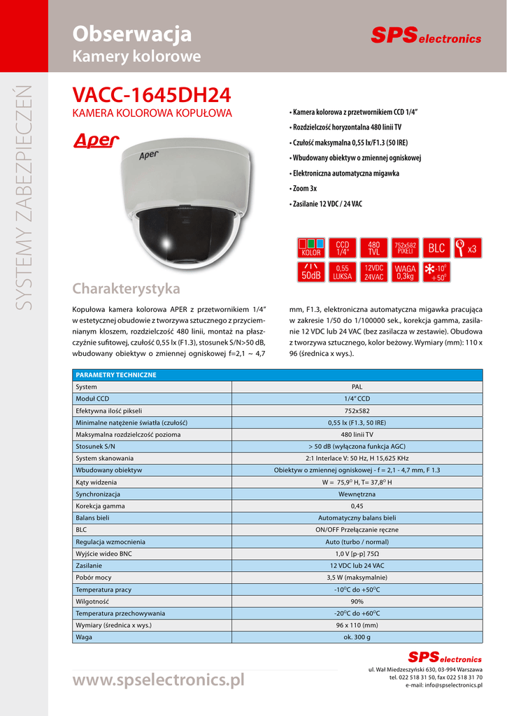 Obserwacja SYSTEMY ZABEZPIECZEŃ Kamery kolorowe VACC-1645DH24 KAMERA KOLOROWA KOPUŁOWA • Kamera kolorowa z przetwornikiem CCD 1/4” • Rozdzielczość horyzontalna 480 linii TV • Czułość maksymalna 0,55 lx/F1.3 (50 IRE) • Wbudowany obiektyw o zmiennej ogniskowej • Elektroniczna automatyczna migawka • Zoom 3x • Zasilanie 12 VDC / 24 VAC Charakterystyka Kopułowa kamera kolorowa APER z przetwornikiem 1/4” w estetycznej obudowie z tworzywa sztucznego z przyciemnianym kloszem, rozdzielczość 480 linii, montaż na płaszczyźnie sufitowej, czułość 0,55 lx (F1.3), stosunek S/N>50 dB, wbudowany obiektyw o zmiennej ogniskowej f=2,1 ~ 4,7 mm, F1.3, elektroniczna automatyczna migawka pracująca w zakresie 1/50 do 1/100000 sek., korekcja gamma, zasilanie 12 VDC lub 24 VAC (bez zasilacza w zestawie). Obudowa z tworzywa sztucznego, kolor beżowy. Wymiary (mm): 110 x 96 (średnica x wys.). PARAMETRY TECHNICZNE System Moduł CCD Efektywna ilość pikseli Minimalne natężenie światła (czułość) Maksymalna rozdzielczość pozioma Stosunek S/N System skanowania Wbudowany obiektyw PAL 1/4” CCD 752x582 0,55 lx (F1.3, 50 IRE) 480 linii TV > 50 dB (wyłączona funkcja AGC) 2:1 Interlace V: 50 Hz, H 15,625 KHz Obiektyw o zmiennej ogniskowej - f = 2,1 - 4,7 mm, F 1.3 Kąty widzenia W = 75,9O H, T= 37,8O H Synchronizacja Wewnętrzna Korekcja gamma Balans bieli BLC Regulacja wzmocnienia Wyjście wideo BNC Zasilanie Pobór mocy Temperatura pracy 0,45 Automatyczny balans bieli ON/OFF Przełączanie ręczne Auto (turbo / normal) 1,0 V [p-p] 75Ω 12 VDC lub 24 VAC 3,5 W (maksymalnie) -10OC do +50OC Wilgotność 90% Temperatura przechowywania -20 C do +60OC Wymiary (średnica x wys.) 96 x 110 (mm) Waga www.spselectronics.pl O ok. 300 g ul. Wał Miedzeszyński 630, 03-994 Warszawa tel. 022 518 31 50, fax 022 518 31 70 e-mail: [email protected]