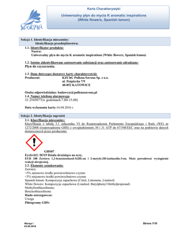 Karta Charakterystyki Uniwersalny płyn do mycia K aromatic inspirations (White flowers, Spanish lemon) Sekcja 1. Identyfikacja mieszaniny: Identyfikacja przedsiębiorstwa: 1.1. Identyfikator produktu: Nazwa: Uniwersalny płyn do mycia K aromatic inspirations (White flowers, Spanish lemon) 1.2. Istotne zidentyfikowane zastosowanie substancji oraz zastosowanie odradzane: Płyn do czyszczenia. 1.3. Dane dotyczące dostawcy karty charakterystyki: Producent: KZChG Pollena-Savona Sp. z o.o. ul. Pośpiecha 7/9 40-852 KATOWICE Osoba odpowiedzialna: [email protected] 1.4. Numer telefonu alarmowego 32 2545077(w godzinach:7.00-15.00) Data wykonania karty:16.04.2016 r. . Sekcja 2. Identyfikacja zagrożeń 2.1. Klasyfikacja mieszaniny: Klasyfikacja z tabelą 3.1 załącznika VI do Rozporządzenia Parlamentu Europejskiego i Rady (WE) nr 1272/2008 (rozporządzenie GHS) z uwzględnieniem 30 i 31 ATP do 67/548/EEC oraz na podstawie danych dostarczonych przez producenta: GHS07 EyeIrrit2: H319 Działa drażniąco na oczy. EUH 208 Zawiera 1,2-benzoizotiazol-3(2H)-on i 2-metylo-2H-izotiazolin-3-on. Może powodować wystąpienie reakcji alergicznej. 2.2. Elementy oznakowania: Zawiera: <5% anionowe środki powierzchniowo czynne <5% niejonowe środki powierzchniowo czynne Spanish lemon: Kompozycja zapachowa (Citral, Limonene, Linalool) White flowers: Kompozycja zapachowa (Linalool, Butylphenyl Methylpropional) Methylisothiazolinone; Benzisothiazolinone Hasło ostrzegawcze: Uwaga Piktogramy GHS: Wersja I 03.05.2016 Strona 1/10 Karta Charakterystyki Uniwersalny płyn do mycia K aromatic inspirations (White flowers, Spanish lemon) GHS07 Zwroty wskazujące rodzaj zagrożenia: H319 Działa drażniąco na oczy. EUH 208 Zawiera 1,2-benzoizotiazol-3(2H)-on i 2-metylo-2H-izotiazolin-3-on. Może powodować wystąpienie reakcji alergicznej. Zwroty wskazujące środki ostrożności: P101 W razie konieczności zasięgnięcia porady lekarza należy pokazać pojemnik lub etykietę. P102 Chronić przed dziećmi. P264 Dokładnie umyć ręce po użyciu. P301 + P330 + P331 W PRZYPADKU POŁKNIĘCIA: Wypłukać usta. NIE wywoływać wymiotów. P305+P351+P338 W PRZYPADKU DOSTANIA SIĘ DO OCZU: Ostrożnie płukać wodą przez kilka minut. Wyjąć soczewki kontaktowe, jeżeli są i można je łatwo usunąć. Nadal płukać. P405 Przechowywać pod zamknięciem. 2.3. Inne zagrożenia: Brak informacji dot. spełniania kryteriów PBT lub vPvB zgodnie z zał. XIII rozporządzenia 1907/2006 (REACH).Badania nie zostały przeprowadzone. Sekcja 3. Skład/informacja o składnikach 3.1. Substancje: Nie dotyczy. 3.2. Mieszaniny: Klasyfikację substancji zawartych w produkcie podano zgodnie z tabelą 3.1 oraz 3.2 załącznika VI do Rozporządzenia Parlamentu Europejskiego i Rady (WE) nr 1272/2008 (rozporządzenie CLP) z uwzględnieniem 30 i 31 ATP do 67/548/EEC oraz na podstawie danych dostarczonych przez producenta. Nazwa niebezpiecznej substancji Zakres stężeń Numer CAS Numer indeksowy Numer WE Alkohole, C12-14, etoksylowane <1,5% 68439-50-9 brak 500-213-3 Alkohole, C12-C14, etoksylowane, siarczanowane, sole sodowe Nr Rej. REACH: 01-2119488639-16 Wersja I 03.05.2016 <1,5% 68891-38-3 brak 500-234-8 Symbole niebezpieczeństwa GHS05; GHS07; Niebezpieczeństwo EyeDam1: H318 AcuteTox4: H302 GHS05;GHS07; NIebezpieczeństwo SkinIrrit2: H315 EyeDam1: H318 AquaticChronic3: H412 Strona 2/10 Karta Charakterystyki Uniwersalny płyn do mycia K aromatic inspirations (White flowers, Spanish lemon) Kwasy benzenosulfonowe, C10-13 pochodne alkilowe, sole sodowe Nr Rej. REACH: 01-2119489428-22 <1,1 68411-30-3 brak 270-115-0 1,2-benzoizotiazol-3(2H)-on <0,0045% 2634-33-5 613-088-006 220-120-9 2-metylo-2H-izotiazolin-3-on <0,0045% 2682-20-4 - 220-239-6 GHS05;GHS07; NIebezpieczeństwo SkinIrrit2: H315 EyeDam1: H318 AcuteTox4: H302 GHS05; GHS07; GHS09 Niebezpieczeństwo AcuteTox4: H302 SkinIrrit2: H315 EyeDam1: H318 SkinSens1: H317 AquaticAcute1: H400 GHS05; GHS06; GHS07 Niebezpieczeństwo AcuteTox3: H301 AcuteTox3: H311 SkinCorr1B: H314 SkinSens1: H317 Brzmienie użytych zwrotów – patrz p. 16. Sekcja 4. Środki pierwszej pomocy 4.1. Opis środków pierwszej pomocy: 4.1.1 Wytyczne dotyczące pierwszej pomocy wg istotnych dróg narażenia: Kartę Charakterystyki okazać lekarzowi udzielającemu pomocy. W przypadku narażenia na pary i aerozole produktu osobę poszkodowaną przenieść do dobrze wentylowanego pomieszczenia zwrócić się o pomoc lekarską a) drogi oddechowe: osobę poszkodowaną natychmiast przenieść do dobrze wentylowanego pomieszczenia; osobę poszkodowaną umieścić w pozycji półleżącej, rozluźnić ubranie, upewnić się czy w ustach osoby poszkodowanej nie zalegają przedmioty lub wydzielina utrudniające oddychanie; jęli poszkodowany nie oddycha – wykonać sztuczne oddychanie; niezwłocznie zwrócić się o pomoc lekarską w przypadku wystąpienia trudności z oddychaniem. b) skóra: zdjąć zanieczyszczone ubranie; zabrudzoną skórę przemyć dużą ilością wody z mydłem; do mycia skóry nie używać żadnych rozpuszczalników ani rozcieńczalników; niezwłocznie skonsultować z lekarzem jeżeli wystąpi podrażnienie. c) oczy: zanieczyszczone oczy płukać, przy otwartych powiekach, ciągłym strumieniem bieżącej wody przez 10 ÷ 15 minut; unikać silnego strumienia wody, który może stworzyć ryzyko uszkodzenia rogówki; w przypadku utrzymującego się pieczenia lub podrażnienia skonsultować się z lekarzem; nie używać żadnych płynów do przemywania oczu ani żadnych maści przed konsultacją lekarską; w przypadku, gdy osoba poszkodowana nosi szkła kontaktowe zdjąć je, jeżeli to możliwe; niezwłocznie zwrócić się o pomoc lekarską d) przewód pokarmowy: wypłukać usta dużą ilością bieżącej wody; osobie nieprzytomnej nie podawać nic do ust ; nie wywoływać wymiotów; niezwłocznie skonsultować z lekarzem – pokazać lekarzowi Kartę Charakterystyki lub etykietę 4.1.2. Inne: Wersja I 03.05.2016 