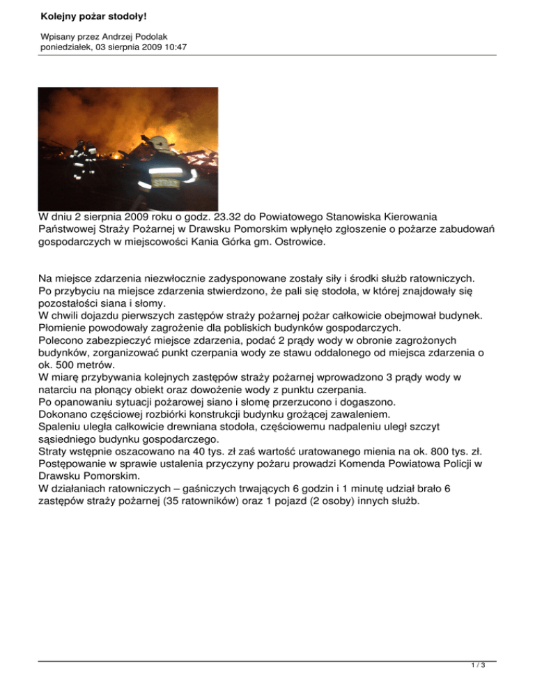 Kolejny pożar stodoły! Wpisany przez Andrzej Podolak poniedziałek, 03 sierpnia 2009 10:47 W dniu 2 sierpnia 2009 roku o godz. 23.32 do Powiatowego Stanowiska Kierowania Państwowej Straży Pożarnej w Drawsku Pomorskim wpłynęło zgłoszenie o pożarze zabudowań gospodarczych w miejscowości Kania Górka gm. Ostrowice. Na miejsce zdarzenia niezwłocznie zadysponowane zostały siły i środki służb ratowniczych. Po przybyciu na miejsce zdarzenia stwierdzono, że pali się stodoła, w której znajdowały się pozostałości siana i słomy. W chwili dojazdu pierwszych zastępów straży pożarnej pożar całkowicie obejmował budynek. Płomienie powodowały zagrożenie dla pobliskich budynków gospodarczych. Polecono zabezpieczyć miejsce zdarzenia, podać 2 prądy wody w obronie zagrożonych budynków, zorganizować punkt czerpania wody ze stawu oddalonego od miejsca zdarzenia o ok. 500 metrów. W miarę przybywania kolejnych zastępów straży pożarnej wprowadzono 3 prądy wody w natarciu na płonący obiekt oraz dowożenie wody z punktu czerpania. Po opanowaniu sytuacji pożarowej siano i słomę przerzucono i dogaszono. Dokonano częściowej rozbiórki konstrukcji budynku grożącej zawaleniem. Spaleniu uległa całkowicie drewniana stodoła, częściowemu nadpaleniu uległ szczyt sąsiedniego budynku gospodarczego. Straty wstępnie oszacowano na 40 tys. zł zaś wartość uratowanego mienia na ok. 800 tys. zł. Postępowanie w sprawie ustalenia przyczyny pożaru prowadzi Komenda Powiatowa Policji w Drawsku Pomorskim. W działaniach ratowniczych – gaśniczych trwających 6 godzin i 1 minutę udział brało 6 zastępów straży pożarnej (35 ratowników) oraz 1 pojazd (2 osoby) innych służb. 1/3 Kolejny pożar stodoły! Wpisany przez Andrzej Podolak poniedziałek, 03 sierpnia 2009 10:47 2/3 Kolejny pożar stodoły! Wpisany przez Andrzej Podolak poniedziałek, 03 sierpnia 2009 10:47 3/3