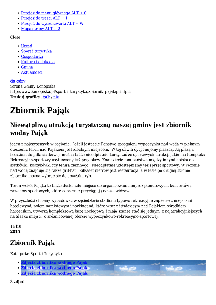 Przejdź do menu głównego ALT + 0 Przejdź do treści ALT + 1 Przejdź do wyszukiwarki ALT + W Mapa strony ALT + 2 Close Urząd Sport i turystyka Gospodarka Kultura i edukacja Gmina Aktualności do góry Strona Gminy Konopiska http://www.konopiska.pl/sport_i_turystyka/zbiornik_pajak/printpdf Drukuj grafikę : tak / nie Zbiornik Pająk Niewątpliwą atrakcją turystyczną naszej gminy jest zbiornik wodny Pająk jeden z najczystszych w regionie. Jeżeli jesteście Państwo spragnieni wypoczynku nad woda w pięknym otoczeniu teren nad Pająkiem jest idealnym miejscem. W tej chwili dysponujemy piaszczystą plażą z boiskiem do piłki siatkowej, można także nieodpłatnie korzystać ze sportowych atrakcji jakie ma Kompleks Rekreacyjno-sportowy usytuowany tuż przy plaży. Znajdziecie tam państwo między innymi boiska do siatkówki, koszykówki czy tenisa ziemnego. Nieodpłatnie udostępniamy też sprzęt sportowy. W sezonie nad wodą znajduje się także gril-bar, kilkaset metrów jest restauracja, a w lesie po drugiej stronie zbiornika można wybrać się do smażalni ryb. Teren wokół Pająka to także doskonałe miejsce do organizowania imprez plenerowych, koncertów i zawodów sportowych, które corocznie przyciągają rzesze widzów. W przyszłości chcemy wybudować w sąsiedztwie stadionu typowo rekreacyjne zaplecze z miejscami hotelowymi, polem namiotowym i parkingami, które wraz z istniejącym nad Pająkiem ośrodkiem harcerskim, utworzą kompleksową bazę noclegową i maja szansę stać się jednym z najatrakcyjniejszych na Śląsku miejsc, o zróżnicowanej ofercie wypoczynkowo-rekreacyjno-sportowej. 14 lis 2015 Zbiornik Pająk Kategoria: Sport i Turystyka Zdjęcia zbiornika wodnego Pająk Zdjęcia zbiornika wodnego Pająk Zdjęcia zbiornika wodnego Pająk 3 zdjęć