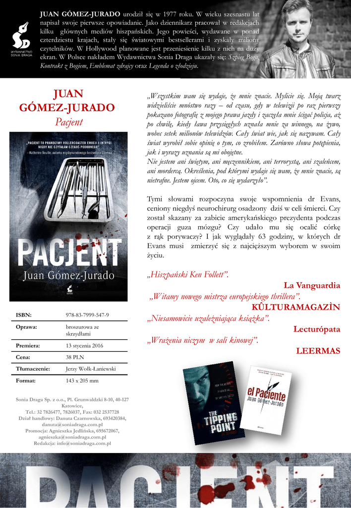 JUAN GÓMEZ-JURADO urodził się w 1977 roku. W wieku szesnastu lat napisał swoje pierwsze opowiadanie. Jako dziennikarz pracował w redakcjach kilku głównych mediów hiszpańskich. Jego powieści, wydawane w ponad czterdziestu krajach, stały się światowymi bestsellerami i zyskały miliony czytelników. W Hollywood planowane jest przeniesienie kilku z nich na duży ekran. W Polsce nakładem Wydawnictwa Sonia Draga ukazały się: Szpieg Boga, Kontrakt z Bogiem, Emblemat zdrajcy oraz Legenda o złodzieju. JUAN GÓMEZ-JURADO Pacjent „Wszystkim wam się wydaje, że mnie znacie. Mylicie się. Moją twarz widzieliście mnóstwo razy – od czasu, gdy w telewizji po raz pierwszy pokazano fotografię z mojego prawa jazdy i zaczęła mnie ścigać policja, aż po chwilę, kiedy ława przysięgłych uznała mnie za winnego, na żywo, wobec setek milionów telewidzów. Cały świat wie, jak się nazywam. Cały świat wyrobił sobie opinię o tym, co zrobiłem. Zarówno słowa potępienia, jak i wyrazy uznania są mi obojętne. Nie jestem ani świętym, ani męczennikiem, ani terrorystą, ani szaleńcem, ani mordercą. Określenia, pod którymi wydaje się wam, że mnie znacie, są nietrafne. Jestem ojcem. Oto, co się wydarzyło”. Tymi słowami rozpoczyna swoje wspomnienia dr Evans, ceniony niegdyś neurochirurg osadzony dziś w celi śmierci. Czy został skazany za zabicie amerykańskiego prezydenta podczas operacji guza mózgu? Czy udało mu się ocalić córkę z rąk porywaczy? I jak wyglądały 63 godziny, w których dr Evans musi zmierzyć się z najcięższym wyborem w swoim życiu. „Hiszpański Ken Follett”. ISBN: 978-83-7999-547-9 Oprawa: broszurowa ze skrzydłami Premiera: 13 stycznia 2016 Cena: 38 PLN Tłumaczenie: Jerzy Wołk-Łaniewski Format: 143 x 205 mm Sonia Draga Sp. z o.o., Pl. Grunwaldzki 8-10, 40-127 Katowice, Tel.: 32 7826477, 7826037, Fax: 032 2537728 Dział handlowy: Danuta Czarnowska, 693420384, [email protected] Promocja: Agnieszka Jedlińska, 695672067, [email protected] Redakcja: [email protected] La Vanguardia „Witamy nowego mistrza europejskiego thrillera”. KÛLTURAMAGAZÌN „Niesamowicie uzależniająca książka”. Lecturópata „Wrażenia niczym w sali kinowej”. LEERMAS