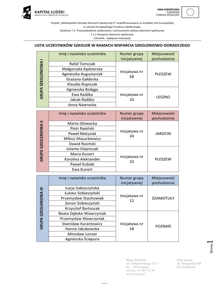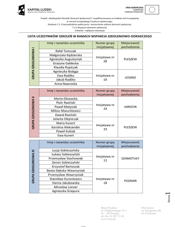Projekt „Wielkopolski Ośrodek Ekonomii Społecznej II” współfinansowany ze środków Unii Europejskiej w ramach Europejskiego Funduszu Społecznego. Działanie 7.2. Przeciwdziałanie wykluczeniu i wzmocnienie sektora ekonomii społecznej. 7.2.2 Wsparcie ekonomii społecznej. Człowiek - najlepsza inwestycja LISTA UCZESTNIKÓW SZKOLEŃ W RAMACH WSPARCIA SZKOLENIOWO-DORADCZEGO GRUPA SZKOLENIOWA II Imię i nazwisko uczestnika Marta Głowacka Piotr Rasiński Paweł Matysiak Miłosz Mazurkiewicz Dawid Rasiński Jolanta Olejniczak Maria Kunert Karolina Aleksander Paweł Kubiak Ewa Kunert GRUPA SZKOLENIOWA III Imię i nazwisko uczestnika Łucja Sobieszyńska Łukasz Sobieszyński Przemysław Stachowiak Zenon Sobieszyński Krzysztof Bartoszak Beata Dębska-Wawrzyniak Przemysław Wawrzyniak Stanisław Kurantowicz Hanna Jakubowska Mirosław Lonzer Agnieszka Ściepura Miejscowość pochodzenia Inicjatywa nr 28 PLESZEW Inicjatywa nr 10 LESZNO Numer grupy inicjatywnej Miejscowość pochodzenia Inicjatywa nr 24 JAROCIN Inicjatywa nr 23 PLESZEW Numer grupy inicjatywnej Miejscowość pochodzenia Inicjatywa nr 12 SZAMOTUŁY Inicjatywa nr 18 POZNAŃ 1 Rafał Tomczak Małgorzata Kędzierska Agnieszka Augustyniak Grażyna Gałdecka Klaudia Rupiczak Agnieszka Bzdęga Ewa Radźko Jakub Radźko Anna Nawrocka Numer grupy inicjatywnej Strona GRUPA SZKOLENIOWA I Imię i nazwisko uczestnika Biuro Projektu: ul. Chłapowskiego 15/ 1 61 – 504 Poznań, tel./fax. 61 887 11 66 www.woes.pl Filia Konin: ul. Energetyka 6B 62-510 Konin Projekt „Wielkopolski Ośrodek Ekonomii Społecznej II” współfinansowany ze środków Unii Europejskiej w ramach Europejskiego Funduszu Społecznego. Działanie 7.2. Przeciwdziałanie wykluczeniu i wzmocnienie sektora ekonomii społecznej. 7.2.2 Wsparcie ekonomii społecznej. Człowiek - najlepsza inwestycja Joanna Drogomirecka Julia Wójcik - Pleyn Mirosława Kościelska Iwona Matysiak Maciej Reczek Wojciech Zarzycki Beata Chrobak Izabela Brodawska Wojciech Wysopal Patryk Karzkowiak Irena Wiśniewska - Smolarek Aleksander Smolarek Paweł Prokopowicz Danuta Pisarska Adrian Toporowicz Michał Listwoń Darek Wilczewski Małgorzata Tłok Lila Kubicka Andrzej Hercog Sylwia Wawrzyniak Angelika Laskowska Małgorzata Budkowska Jan Jastrzębski Danuta Czarnecka Instytucja/organizacja Inicjatywa nr 20 Jeżycka Fundacja Senioralna Inicjatywa nr 3 Gmina Pobiedziska Inicjatywa nr 25 Województwo Wielkopolskie Inicjatywa nr 4 Akcja Humanitarna Życie Piła/ ChSD Krzyż Inicjatywa nr 11 Gmina Piła/ Powiat Pilski Numer grupy inicjatywnej Inicjatywa nr 26 Instytucja/organizacja Inicjatywa nr 7 Miasto Konin/ Gmina Stare Miasto Inicjatywa nr 13 Stowarzyszenie Dom Pomocna Dłoń Inicjatywa nr 14 Gmina Skulsk/ Fundacja „Mielnica” Renata Kopczyk Inicjatywa nr 8 Danuta Wilczak Piotr Cebulski Cezary Słomkowski Gmina Krobia/ Powiat Gostyński Inicjatywa nr 29 Stowarzyszenie „Kawęczyńskie Towarzystwo Rozwoju”/ Gmina Kawęczyn Stowarzyszenie Trzeźwości (...) / Stowarzyszenie „Dolina Baryczy” 2 GRUPA SZKOLENIOWA V Imię i nazwisko uczestnika Numer grupy inicjatywnej Strona GRUPA SZKOLENIOWA IV Imię i nazwisko uczestnika Biuro Projektu: ul. Chłapowskiego 15/ 1 61 – 504 Poznań, tel./fax. 61 887 11 66 www.woes.pl Filia Konin: ul. Energetyka 6B 62-510 Konin Projekt „Wielkopolski Ośrodek Ekonomii Społecznej II” współfinansowany ze środków Unii Europejskiej w ramach Europejskiego Funduszu Społecznego. Działanie 7.2. Przeciwdziałanie wykluczeniu i wzmocnienie sektora ekonomii społecznej. 7.2.2 Wsparcie ekonomii społecznej. Człowiek - najlepsza inwestycja Imię i nazwisko uczestnika Waldemar Hyla Bartosz Łowczynowski Zdzisław Nijak Numer grupy inicjatywnej Instytucja/organizacja Inicjatywa nr 2 Miasto Poznań Inicjatywa nr 5 Fundacja Podaj Dalej Inicjatywa nr 16 Kolskie Stowarzyszenie Osób Niepełnosprawnych „Sprawni inaczej” w Kole Inicjatywa nr 9 Miasto Kostrzyn Inicjatywna nr 27 Stowarzyszenie na rzecz Aktywności Zawodowej i Społecznej Osób Niepełnospr.Ziemi Leszczyńskiej „Pro-Activ”/ Powiat Leszczyński Marek Bystrzycki Daniel Polichnowski Joanna Obiała Leszek Molicki Leokadia Grzebielucha Dorota Karaszewska Agnieszka Anna Piasecka Małgorzata Janiak Anna Binkiewicz 3 Piotr Cichoński Strona GRUPA SZKOLENIOWA VI Karol Włodarczyk Biuro Projektu: ul. Chłapowskiego 15/ 1 61 – 504 Poznań, tel./fax. 61 887 11 66 www.woes.pl Filia Konin: ul. Energetyka 6B 62-510 Konin