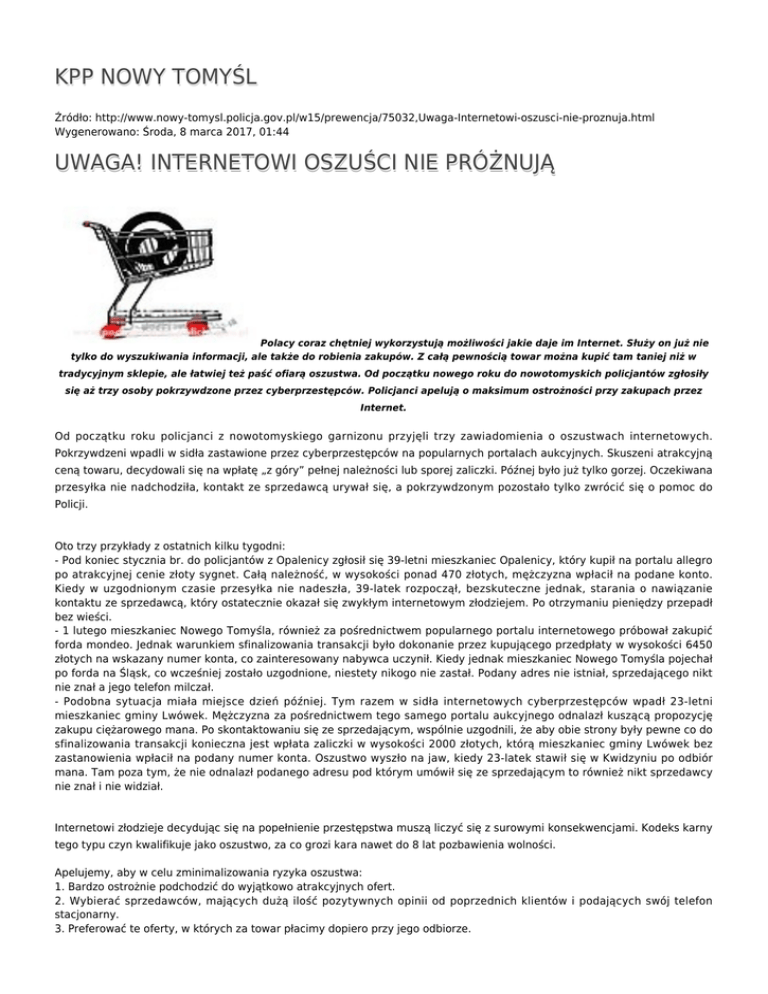 KPP NOWY TOMYŚL Źródło: http://www.nowy-tomysl.policja.gov.pl/w15/prewencja/75032,Uwaga-Internetowi-oszusci-nie-proznuja.html Wygenerowano: Środa, 8 marca 2017, 01:44 UWAGA! INTERNETOWI OSZUŚCI NIE PRÓŻNUJĄ Polacy coraz chętniej wykorzystują możliwości jakie daje im Internet. Służy on już nie tylko do wyszukiwania informacji, ale także do robienia zakupów. Z całą pewnością towar można kupić tam taniej niż w tradycyjnym sklepie, ale łatwiej też paść ofiarą oszustwa. Od początku nowego roku do nowotomyskich policjantów zgłosiły się aż trzy osoby pokrzywdzone przez cyberprzestępców. Policjanci apelują o maksimum ostrożności przy zakupach przez Internet. Od początku roku policjanci z nowotomyskiego garnizonu przyjęli trzy zawiadomienia o oszustwach internetowych. Pokrzywdzeni wpadli w sidła zastawione przez cyberprzestępców na popularnych portalach aukcyjnych. Skuszeni atrakcyjną ceną towaru, decydowali się na wpłatę „z góry” pełnej należności lub sporej zaliczki. Późnej było już tylko gorzej. Oczekiwana przesyłka nie nadchodziła, kontakt ze sprzedawcą urywał się, a pokrzywdzonym pozostało tylko zwrócić się o pomoc do Policji. Oto trzy przykłady z ostatnich kilku tygodni: - Pod koniec stycznia br. do policjantów z Opalenicy zgłosił się 39-letni mieszkaniec Opalenicy, który kupił na portalu allegro po atrakcyjnej cenie złoty sygnet. Całą należność, w wysokości ponad 470 złotych, mężczyzna wpłacił na podane konto. Kiedy w uzgodnionym czasie przesyłka nie nadeszła, 39-latek rozpoczął, bezskuteczne jednak, starania o nawiązanie kontaktu ze sprzedawcą, który ostatecznie okazał się zwykłym internetowym złodziejem. Po otrzymaniu pieniędzy przepadł bez wieści. - 1 lutego mieszkaniec Nowego Tomyśla, również za pośrednictwem popularnego portalu internetowego próbował zakupić forda mondeo. Jednak warunkiem sfinalizowania transakcji było dokonanie przez kupującego przedpłaty w wysokości 6450 złotych na wskazany numer konta, co zainteresowany nabywca uczynił. Kiedy jednak mieszkaniec Nowego Tomyśla pojechał po forda na Śląsk, co wcześniej zostało uzgodnione, niestety nikogo nie zastał. Podany adres nie istniał, sprzedającego nikt nie znał a jego telefon milczał. - Podobna sytuacja miała miejsce dzień później. Tym razem w sidła internetowych cyberprzestępców wpadł 23-letni mieszkaniec gminy Lwówek. Mężczyzna za pośrednictwem tego samego portalu aukcyjnego odnalazł kuszącą propozycję zakupu ciężarowego mana. Po skontaktowaniu się ze sprzedającym, wspólnie uzgodnili, że aby obie strony były pewne co do sfinalizowania transakcji konieczna jest wpłata zaliczki w wysokości 2000 złotych, którą mieszkaniec gminy Lwówek bez zastanowienia wpłacił na podany numer konta. Oszustwo wyszło na jaw, kiedy 23-latek stawił się w Kwidzyniu po odbiór mana. Tam poza tym, że nie odnalazł podanego adresu pod którym umówił się ze sprzedającym to również nikt sprzedawcy nie znał i nie widział. Internetowi złodzieje decydując się na popełnienie przestępstwa muszą liczyć się z surowymi konsekwencjami. Kodeks karny tego typu czyn kwalifikuje jako oszustwo, za co grozi kara nawet do 8 lat pozbawienia wolności. Apelujemy, aby w celu zminimalizowania ryzyka oszustwa: 1. Bardzo ostrożnie podchodzić do wyjątkowo atrakcyjnych ofert. 2. Wybierać sprzedawców, mających dużą ilość pozytywnych opinii od poprzednich klientów i podających swój telefon stacjonarny. 3. Preferować te oferty, w których za towar płacimy dopiero przy jego odbiorze. 4. Paczkę otwierać w obecności kuriera, a po ujawnieniu oszustwa natychmiast zawiadomić Policję. Ocena: 0/5 (0) Tweetnij