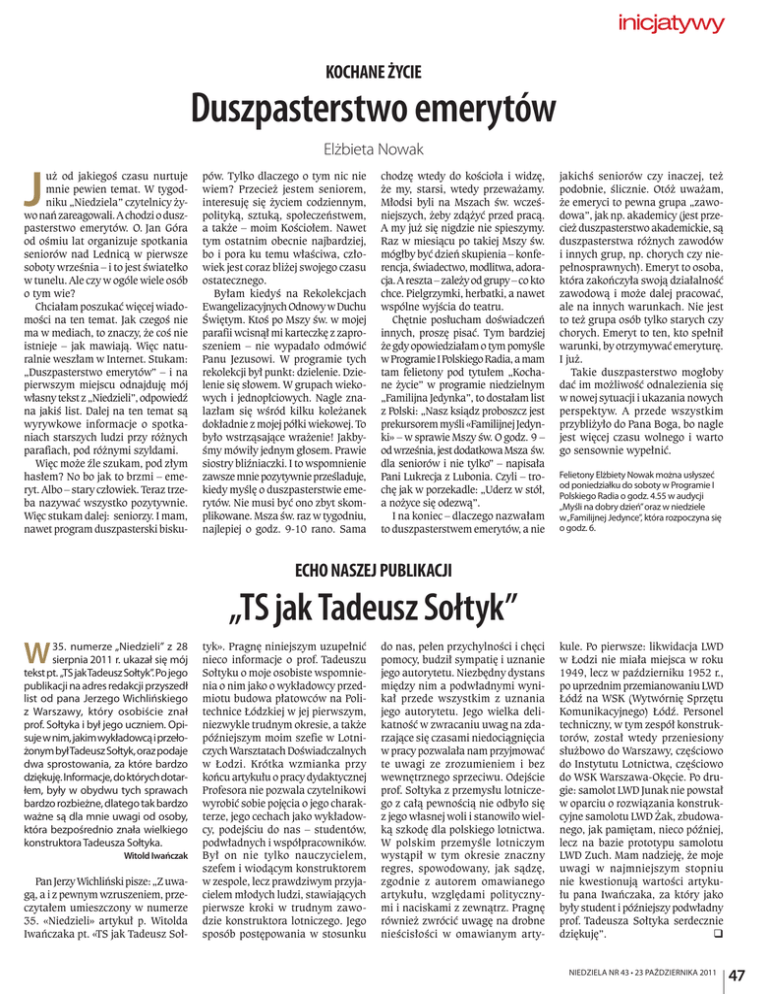 inicjatywy Kochane życie Duszpasterstwo emerytów Elżbieta Nowak J uż od jakiegoś czasu nurtuje mnie pewien temat. W tygodniku „Niedziela” czytelnicy żywo nań zareagowali. A chodzi o duszpasterstwo emerytów. O. Jan Góra od ośmiu lat organizuje spotkania seniorów nad Lednicą w pierwsze soboty września – i to jest światełko w tunelu. Ale czy w ogóle wiele osób o tym wie? Chciałam poszukać więcej wiadomości na ten temat. Jak czegoś nie ma w mediach, to znaczy, że coś nie istnieje – jak mawiają. Więc naturalnie weszłam w Internet. Stukam: „Duszpasterstwo emerytów” – i na pierwszym miejscu odnajduję mój własny tekst z „Niedzieli”, odpowiedź na jakiś list. Dalej na ten temat są wyrywkowe informacje o spotkaniach starszych ludzi przy różnych parafiach, pod różnymi szyldami. Więc może źle szukam, pod złym hasłem? No bo jak to brzmi – emeryt. Albo – stary człowiek. Teraz trzeba nazywać wszystko pozytywnie. Więc stukam dalej: seniorzy. I mam, nawet program duszpasterski bisku- pów. Tylko dlaczego o tym nic nie wiem? Przecież jestem seniorem, interesuję się życiem codziennym, polityką, sztuką, społeczeństwem, a także – moim Kościołem. Nawet tym ostatnim obecnie najbardziej, bo i pora ku temu właściwa, człowiek jest coraz bliżej swojego czasu ostatecznego. Byłam kiedyś na Rekolekcjach Ewangelizacyjnych Odnowy w Duchu Świętym. Ktoś po Mszy św. w mojej parafii wcisnął mi karteczkę z zaproszeniem – nie wypadało odmówić Panu Jezusowi. W programie tych rekolekcji był punkt: dzielenie. Dzielenie się słowem. W grupach wiekowych i jednopłciowych. Nagle znalazłam się wśród kilku koleżanek dokładnie z mojej półki wiekowej. To było wstrząsające wrażenie! Jakbyśmy mówiły jednym głosem. Prawie siostry bliźniaczki. I to wspomnienie zawsze mnie pozytywnie prześladuje, kiedy myślę o duszpasterstwie emerytów. Nie musi być ono zbyt skomplikowane. Msza św. raz w tygodniu, najlepiej o godz. 9-10 rano. Sama chodzę wtedy do kościoła i widzę, że my, starsi, wtedy przeważamy. Młodsi byli na Mszach św. wcześniejszych, żeby zdążyć przed pracą. A my już się nigdzie nie spieszymy. Raz w miesiącu po takiej Mszy św. mógłby być dzień skupienia – konferencja, świadectwo, modlitwa, adoracja. A reszta – zależy od grupy – co kto chce. Pielgrzymki, herbatki, a nawet wspólne wyjścia do teatru. Chętnie posłucham doświadczeń innych, proszę pisać. Tym bardziej że gdy opowiedziałam o tym pomyśle w Programie I Polskiego Radia, a mam tam felietony pod tytułem „Kochane życie” w programie niedzielnym „Familijna Jedynka”, to dostałam list z Polski: „Nasz ksiądz proboszcz jest prekursorem myśli «Familijnej Jedynki» – w sprawie Mszy św. O godz. 9 – od września, jest dodatkowa Msza św. dla seniorów i nie tylko” – napisała Pani Lukrecja z Lubonia. Czyli – trochę jak w porzekadle: „Uderz w stół, a nożyce się odezwą”. I na koniec – dlaczego nazwałam to duszpasterstwem emerytów, a nie jakichś seniorów czy inaczej, też podobnie, ślicznie. Otóż uważam, że emeryci to pewna grupa „zawodowa”, jak np. akademicy (jest przecież duszpasterstwo akademickie, są duszpasterstwa różnych zawodów i innych grup, np. chorych czy niepełnosprawnych). Emeryt to osoba, która zakończyła swoją działalność zawodową i może dalej pracować, ale na innych warunkach. Nie jest to też grupa osób tylko starych czy chorych. Emeryt to ten, kto spełnił warunki, by otrzymywać emeryturę. I już. Takie duszpasterstwo mogłoby dać im możliwość odnalezienia się w nowej sytuacji i ukazania nowych perspektyw. A przede wszystkim przybliżyło do Pana Boga, bo nagle jest więcej czasu wolnego i warto go sensownie wypełnić. Felietony Elżbiety Nowak można usłyszeć od poniedziałku do soboty w Programie I Polskiego Radia o godz. 4.55 w audycji „Myśli na dobry dzień” oraz w niedziele w „Familijnej Jedynce”, która rozpoczyna się o godz. 6. ECHO NASZEJ PUBLIKACJI „TS jak Tadeusz Sołtyk” W 35. numerze „Niedzieli” z 28 sierpnia 2011 r. ukazał się mój tekst pt. „TS jak Tadeusz Sołtyk”. Po jego publikacji na adres redakcji przyszedł list od pana Jerzego Wichlińskiego z Warszawy, który osobiście znał prof. Sołtyka i był jego uczniem. Opisuje w nim, jakim wykładowcą i przełożonym był Tadeusz Sołtyk, oraz podaje dwa sprostowania, za które bardzo dziękuję. Informacje, do których dotarłem, były w obydwu tych sprawach bardzo rozbieżne, dlatego tak bardzo ważne są dla mnie uwagi od osoby, która bezpośrednio znała wielkiego konstruktora Tadeusza Sołtyka. Witold Iwańczak Pan Jerzy Wichliński pisze: „Z uwagą, a i z pewnym wzruszeniem, przeczytałem umieszczony w numerze 35. «Niedzieli» artykuł p. Witolda Iwańczaka pt. «TS jak Tadeusz Soł- tyk». Pragnę niniejszym uzupełnić nieco informacje o prof. Tadeuszu Sołtyku o moje osobiste wspomnienia o nim jako o wykładowcy przedmiotu budowa płatowców na Politechnice Łódzkiej w jej pierwszym, niezwykle trudnym okresie, a także późniejszym moim szefie w Lotniczych Warsztatach Doświadczalnych w Łodzi. Krótka wzmianka przy końcu artykułu o pracy dydaktycznej Profesora nie pozwala czytelnikowi wyrobić sobie pojęcia o jego charakterze, jego cechach jako wykładowcy, podejściu do nas – studentów, podwładnych i współpracowników. Był on nie tylko nauczycielem, szefem i wiodącym konstruktorem w zespole, lecz prawdziwym przyjacielem młodych ludzi, stawiających pierwsze kroki w trudnym zawodzie konstruktora lotniczego. Jego sposób postępowania w stosunku do nas, pełen przychylności i chęci pomocy, budził sympatię i uznanie jego autorytetu. Niezbędny dystans między nim a podwładnymi wynikał przede wszystkim z uznania jego autorytetu. Jego wielka delikatność w zwracaniu uwag na zdarzające się czasami niedociągnięcia w pra
