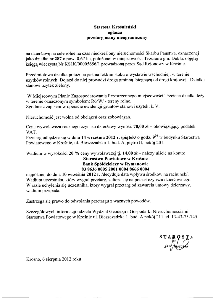 Starosta Krośnieński ogłasza przetarg ustny nieograniczony na dzierżawę na cele rolne na czas nieokreślony nieruchomości Skarbu Państwa. oznaczonej jako działka nr 287 o pow. 0,67 ha, położonej w miejscowości Trzciana gm. Dukla. objętej księgą wieczystą Nr KS lK/00005656/l prowadzoną przez Sąd Rejonowy w Krośnie. Przedmiotowa działka położona jest na lekkim stoku o wystawie wschodniej. w terenie użytków rolnych. Dojazd do niej prowadzi drogągminną, biegnącą od drogi krajowej. Działka stanowi użytek zielony. W Miejscowym Planie Zagospodarowania Przestrzennego miejscowości Trzciana w terenie oznaczonym symbolem: R6/W/ - tereny rolne. Zgodnie z zapisem w operacie ewidencji gruntów stanowi użytek: Ł V. Nieruchomość jest wolna od obciążeń działka leży oraz zobowiązań. Cena wywoławcza rocznego czynszu dzierżawy wynosi: 70,00 zł+ obowiązujący podatek VAT. 30 Przetarg odbędzie się w dniu 14 września 2012 r. /piątek/ o godz. 9 w budynku Starostwa Powiatowego w Krośnie, ul. Bieszczadzka 1, bud. A, piętro II, pokój 201. 20 °/o ceny wywoławczej tj. 14,00 zł- należy uiścić na konto: Starostwo Powiatowe w Krośnie Bank Spółdzielczy w Rymanowie 83863600052001000486660004 najpóźniej do dnia 10 września 2012 r. /decyduje data wpływu środków na rachunek/. Wadium uczestnika, który wygrał przetarg, zalicza się na poczet czynszu dzierżawnego. W razie uchylenia się uczestnika, który wygrał przetarg od zawarcia umowy dzierżawy. wadium przepada. Wadium w wysokości Zastrzega się prawo do odwołania przetargu z ważnych powodów. informacji udziela Wydział Geodezji i Gospodarki Nieruchomościami Starostwa Powiatowego w Krośnie ul. Bieszczadzka 1, bud. A pokój 211 tel. 13-43-75-745. Szczegółowych Krosno, 6 sierpnia 2012 roku