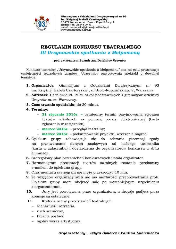 REGULAMIN KONKURSU TEATRALNEGO III Ursynowskie spotkania z Melpomeną pod patronatem Burmistrza Dzielnicy Ursynów Konkurs teatralny „Ursynowskie spotkania z Melpomeną” ma na celu prezentację umiejętności teatralnych uczniów. Uczestnicy przygotowują spektakl o dowolnej tematyce. 1. Organizator: Gimnazjum z Oddziałami Dwujęzycznymi nr 93 im. Księżnej Izabeli Czartoryskiej, ul Szolc-Rogozińskiego 2, Warszawa. 2. Adresaci: Uczniowie kl. IV-VI szkół podstawowych i gimnazjów dzielnicy Ursynów m. st. Warszawy. 3. Czas trwania spektaklu: do 20 minut. 4. Terminy: 31 stycznia 2016r. – ostateczny termin przyjmowania zgłoszeń teatrów szkolnych za pomocą poczty elektronicznej (karta zgłoszenia w załączniku); marzec 2016r. – przegląd teatralny; marzec 2016r. – podsumowanie projektu, wręczenie nagród. 5. Opiekun grupy zobowiązuje się do zebrania pisemnej zgody na przetwarzanie danych osobowych od każdego uczestnika (karta w załączniku) i dostarczenia do organizatorów konkursu w dniu eliminacji. 6. Szczegółowy plan przesłuchań konkursowych ustala organizator. 7. Harmonogram prezentacji teatrów szkolnych zostanie przekazany e-mailem do opiekuna grupy. 8. Czas montażu scenografii nie może przekroczyć 10 min. 9. Ze względów organizacyjnych nie ma możliwości przeprowadzania prób. Opiekun grupy może obejrzeć salę po wcześniejszym uzgodnieniu z organizatorami. 10. Jury jest powoływane przez organizatora, a decyzje podjęte przez komisję są ostateczne. 11. Kryteria oceny przedstawień teatralnych: scenariusz i reżyseria, ruch sceniczny, kreacja postaci, ogólny wyraz artystyczny. Organizatorzy: Edyta Świercz i Paulina Lubieniecka