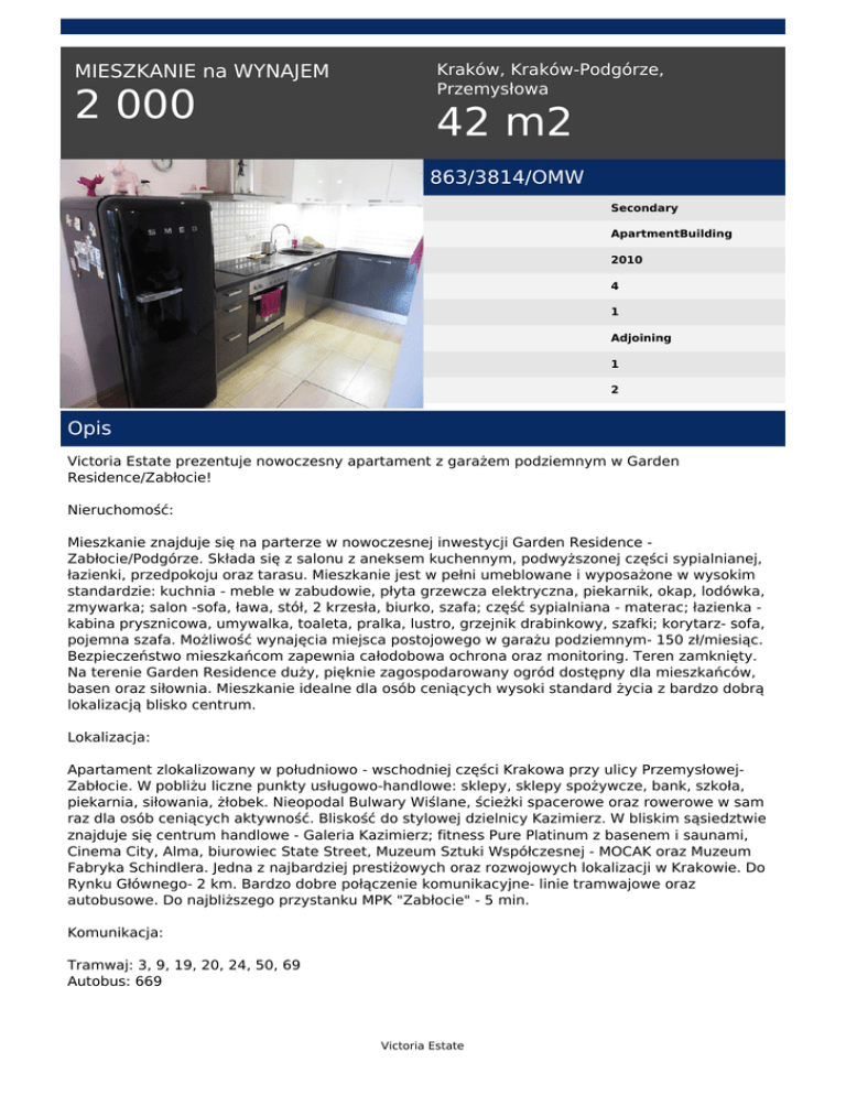 MIESZKANIE na WYNAJEM 2 000 Kraków, Kraków-Podgórze, Przemysłowa 42 m2 863/3814/OMW Secondary ApartmentBuilding 2010 4 1 Adjoining 1 2 Opis Victoria Estate prezentuje nowoczesny apartament z garażem podziemnym w Garden Residence/Zabłocie! Nieruchomość: Mieszkanie znajduje się na parterze w nowoczesnej inwestycji Garden Residence Zabłocie/Podgórze. Składa się z salonu z aneksem kuchennym, podwyższonej części sypialnianej, łazienki, przedpokoju oraz tarasu. Mieszkanie jest w pełni umeblowane i wyposażone w wysokim standardzie: kuchnia - meble w zabudowie, płyta grzewcza elektryczna, piekarnik, okap, lodówka, zmywarka; salon -sofa, ława, stół, 2 krzesła, biurko, szafa; część sypialniana - materac; łazienka kabina prysznicowa, umywalka, toaleta, pralka, lustro, grzejnik drabinkowy, szafki; korytarz- sofa, pojemna szafa. Możliwość wynajęcia miejsca postojowego w garażu podziemnym- 150 zł/miesiąc. Bezpieczeństwo mieszkańcom zapewnia całodobowa ochrona oraz monitoring. Teren zamknięty. Na terenie Garden Residence duży, pięknie zagospodarowany ogród dostępny dla mieszkańców, basen oraz siłownia. Mieszkanie idealne dla osób ceniących wysoki standard życia z bardzo dobrą lokalizacją blisko centrum. Lokalizacja: Apartament zlokalizowany w południowo - wschodniej części Krakowa przy ulicy PrzemysłowejZabłocie. W pobliżu liczne punkty usługowo-handlowe: sklepy, sklepy spożywcze, bank, szkoła, piekarnia, siłowania, żłobek. Nieopodal Bulwary Wiślane, ścieżki spacerowe oraz rowerowe w sam raz dla osób ceniących aktywność. Bliskość do stylowej dzielnicy Kazimierz. W bliskim sąsiedztwie znajduje się centrum handlowe - Galeria Kazimierz; fitness Pure Platinum z basenem i saunami, Cinema City, Alma, biurowiec State Street, Muzeum Sztuki Współczesnej - MOCAK oraz Muzeum Fabryka Schindlera. Jedna z najbardziej prestiżowych oraz rozwojowych lokalizacji w Krakowie. Do Rynku Głównego- 2 km. Bardzo dobre połączenie komunikacyjne- linie tramwajowe oraz autobusowe. Do najbliższego przystanku MPK "Zabłocie" - 5 min. Komunikacja: Tramwaj: 3, 9, 19, 20, 24, 50, 69 Autobus: 669 Victoria Estate Opłaty: 2000 zł najem + ok. 320 zł czynsz administracyjny + prąd według zużycia Serdecznie polecam i zapraszam do oglądania! Małgorzata Wicha tel. +48 511 560 721 email: [email protected] Victoria Estate Powered by TCPDF (www.tcpdf.org)