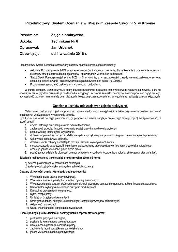 Przedmiotowy System Oceniania w Miejskim Zespole Szkół nr 5 w Krośnie Przedmiot: Zajęcia praktyczne Szkoła: Technikum Nr 6 Opracował: Jan Urbanek Obowiązuje: od 1 września 2016 r. Przedmiotowy system oceniania opracowany został w oparciu o następujące dokumenty: · · · Aktualne Rozporządzenie MEN w sprawie warunków i sposobu oceniania, klasyfikowania i promowania uczniów i słuchaczy oraz przeprowadzenia egzaminów i sprawdzianów w szkołach publicznych Statut Szkół Ponadgimnazjalnych w MZS nr 5 w Krośnie, a w szczególności zasady wewnątrzszkolnego systemu oceniania, klasyfikowania i przeprowadzania egzaminów (stan na dzień 1.09.2015r.) Program nauczania zajęć praktycznych w zawodach budowlanych W trakcie semestru uczeń otrzymuje oceny bieżące (cząstkowe) notowane przez właściwego nauczyciela zawodu, który ma obowiązek raz w tygodniu przenieść je do dziennika lekcyjnego. W trakcie semestru nauczyciel zawodu powinien dążyć do tego, aby wystawić uczniowi minimum tyle ocen bieżących, ile godzin przeznaczonych jest w tygodniu na realizację zajęć praktycznych. Ocenianie uczniów odbywających zajęcia praktyczne. Celem zajęć praktycznych jest nabycie przez ucznia wiadomości i umiejętności, a także przyswojenie postaw i zachowań niezbędnych w późniejszym wykonywaniu zawodu. Cykl kształcenia w trakcie zajęć praktycznych, (w połączeniu z wiedzą nabytą w czasie zajęć teoretycznych) ma spowodować, że uczeń potrafi: 1. czytać instrukcje oraz interpretować rysunki techniczne, 2. zaplanować przebieg i sposób wykonania swojej pracy i prawidłowo ją wykonać, 3. posługiwać się instrukcjami użytkowania, 4. dobierać odpowiednie narzędzia, elektronarzędzia, sprzęt, nazywać je oraz posługiwać się nimi w sposób prawidłowy 5. wykonywać podstawowe operacje, 6. dobierać środki ochrony osobistej do rodzaju i zakresu wykonywanych zadań, 7. stosować zasady bezpiecznej i higienicznej pracy, ochrony przeciwpożarowej i ochrony środowiska naturalnego, 8. ocenić jej jakość wykonanej przez siebie pracy, 9. podać zasady udzielania pierwszej pomocy w nagłych wypadkach (oparzenia, omdlenia, skaleczenia, złamania, itp.). Szkolenie realizowane w trakcie zajęć praktycznych może mieć formę: a) ćwiczeń praktycznych w pracowniach szkolnych, b) zadań produkcyjnych, wykonywanych w szkole lub poza nią. Obszary aktywności ucznia, które będą podlegać ocenie: 1. Wykonanie przez ucznia pracy użytkowej. 2. Wykonanie ćwiczeń, prostych czynności i operacji zawodowych. 3. Wykonywanie prac bardziej złożonych obejmujących wyuczone poprzednio czynności, zabiegi i operacje zawodowe. 4. Samodzielne wykonywanie ćwiczeń oraz prac produkcyjnych. 5. Dyscyplina procesu technologicznego. 6. Rytm i tempo pracy. 7. Umiejętność czytania dokumentacji. 8. Umiejętność doboru narzędzi, elektronarzędzi, sprzętu i przyrządów pomiarowych. 9. Aktywność na zajęciach. 10. Udział w konkursach i olimpiadach zawodowych. Ocenie podlegają także działania i postawy ucznia zaprezentowane przez: 1. 2. 3. 4. 5. punktualne przybycie na zajęcia, posiadanie kompletnego stroju roboczego, umiejętność organizacji stanowiska pracy, zachowanie ładu i porządku na stanowisku pracy, jakość wykonania zadania praktycznego, 6. umiejętność łączenia teorii z praktyką, 7. umiejętność współdziałania ucznia w zespole, 8. poszanowanie mienia Szkoły lub w innym miejscu odbywania zajęć praktycznych, 9. przestrzeganie regulaminów i instrukcji obsługi, 10. przestrzeganie przepisów bhp i dyscypliny pracy, 11. zaangażowanie ucznia podczas wszystkich form zajęć praktycznych. Formy sprawdzania umiejętności i wiedzy ucznia Obowiązują następujące formy sprawdzania umiejętności i wiedzy: 1. Formy ustne: · odpowiedź (zazwyczaj dotycząca wiedzy nabytej na wcześniejszych zajęciach praktycznych lub zajęciach teoretycznych, wymaganej do realizacji zadań praktycznych), · czytanie dokumentacji technicznej potrzebnej do wykonania zadania lub operacji, · aktywność w trakcie instruktażu wstępnego, bieżącego i końcowego, · prezentacja (ocenienie) wykonanego przez siebie zadania praktycznego. 2. Formy praktyczne: · ćwiczenia (poszczególne operacje lub bardziej złożone procesy), · wykonanie zadania produkcyjnego, a w jego ramach: ü etap planowania i dobierania rodzaju i ilości materiałów, narzędzi i sprzętu kontrolno-pomiarowego, ü umiejętność zorganizowania stanowiska pracy i zachowania odpowiedniego porządku tamże, ü prawidłowa, zgodna z technologią, warunkami technicznymi, przepisami bhp oraz ochrony środowiska naturalnego realizacja zadania, ü umiejętność współpracy w zespole, przy wykonywaniu prac · sprawdzian praktyczny na stanowisku. Uczeń może zgłosić nieprzygotowanie do zajęć praktycznych (np. w razie braku odzieży roboczej), nie częściej jednak niż tyle razy w każdym semestrze, ile dni w tygodniu odbywają się te zajęcia (czyli jeden lub dwa razy). Zgłoszenia należy dokonać na początku zajęć, najlepiej w czasie sprawdzania frekwencji. W takim przypadku, przez czas trwania zajęć, nauczyciel zawodu organizuje uczniowi prace o charakterze samokształceniowym lub innym (np. dyżur, lub prace porządkowe), a pod koniec zajęć sprawdza stopień opanowania zadanych wiadomości lub jakość wykonanych poleceń. Uczeń nie może być dopuszczony do zajęć z praktycznej nauki zawodu w przypadku braku ważnych badań lekarskich lub braku ubrania roboczego, a więc przy kolejnej takiej sytuacji będzie oceniony jako nieprzygotowany do zajęć i otrzyma ocenę niedostateczną. W przypadku nieobecności na zajęciach lub uzyskania oceny niedostatecznej, uczeń może być zobowiązany do zaliczania niektórych ćwiczeń, partii materiału, itp., ważnych dla realizacji celów edukacyjnych. Zakres i sposoby zaliczania są określane przez nauczyciela i podawane na początku ro