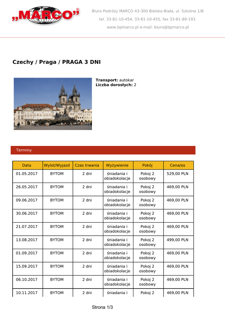 Biuro Podróży MARCO 43-300 Bielsko-Biała, ul. Szkolna 1/B tel. 33-81-10-454, 33-81-10-455, fax 33-81-89-193 www.bpmarco.pl e-mail: [email protected] Czechy / Praga / PRAGA 3 DNI Transport: autokar Liczba dorosłych: 2 Terminy Data Wylot/Wyjazd Czas trwania Wyżywienie Pokój Cena/os 01.05.2017 BYTOM 2 dni śniadania i obiadokolacje Pokoj 2 osobowy 529,00 PLN 26.05.2017 BYTOM 2 dni śniadania i obiadokolacje Pokoj 2 osobowy 469,00 PLN 09.06.2017 BYTOM 2 dni śniadania i obiadokolacje Pokoj 2 osobowy 469,00 PLN 30.06.2017 BYTOM 2 dni śniadania i obiadokolacje Pokoj 2 osobowy 469,00 PLN 21.07.2017 BYTOM 2 dni śniadania i obiadokolacje Pokoj 2 osobowy 469,00 PLN 13.08.2017 BYTOM 2 dni śniadania i obiadokolacje Pokoj 2 osobowy 499,00 PLN 01.09.2017 BYTOM 2 dni śniadania i obiadokolacje Pokoj 2 osobowy 469,00 PLN 15.09.2017 BYTOM 2 dni śniadania i obiadokolacje Pokoj 2 osobowy 469,00 PLN 06.10.2017 BYTOM 2 dni śniadania i obiadokolacje Pokoj 2 osobowy 469,00 PLN 10.11.2017 BYTOM 2 dni śniadania i Pokoj 2 469,00 PLN Strona 1/3 Biuro Podróży MARCO 43-300 Bielsko-Biała, ul. Szkolna 1/B tel. 33-81-10-454, 33-81-10-455, fax 33-81-89-193 www.bpmarco.pl e-mail: [email protected] obiadokolacje osobowy Opis Kategoria Wycieczka Region Czechy Program wycieczki PRAGA • KUTNA HORA 1 dzień Bielsko-Biała - Praga wyjazd z Bielska-Białej o godz. 7.30, przejazd przez Czechy do Pragi, zwiedzanie, w programie m.in. Katedra Św. Wita, Zamek Królewski, Bazylika Św. Jerzego. Przejście Schodami Zamkowymi na Małą Stranę. Rejs statkiem spacerowym po Wełtawie. Obiadokolacja w restauracji. Nocleg w hotelu. 2 dzień Praga po śniadaniu kontynuacja zwiedzania Pragi, w programie m.in. spacer Dzielnicą Żydowską Józefów (Staronowa Synagoga, Ratusz Żydowski, Stary Cmentarz Żydowski), Stare Miasto, Ratusz z XVI w. ze słynnym zegarem Orloj, Kościół Św. Mikołaja, Pałac Golz-Kinskych, Teatr Stanowy, Karolinium (pierwszy Uniwersytet w Europie Środkowej). Przejście Drogą Królewską pod Bramą Prochową na Nowe Miasto, spacer po Placu Wacława. Czas wolny. Obiadokolacja w restauracji. Wyjazd na spektakl z cyklu "Światło, Woda, Dźwięk" - Kriżikowe Fontanny. Nocleg w hotelu. 3 dzień Praga - Kutna Hora - Bielsko-Biała po śniadaniu przejazd do Kutnej Hory - miasta wpisanego na listę Światowego Dziedzictwa Kultury UNESCO, które w XIV w. rywalizowało z królewską Pragą za sprawą tutejszych kopalń srebra. Zwiedzanie - Kaplica Czaszek, następnie przejazd do centrum, spacer po Starym Mieście, kontynuacja zwiedzania, w programie m.in. Katedra Św. Barbary, Kościół Św. Jakuba - najstarsza świątynia w Kutnej Horze, przejście do kompleksu pałacowo-zamkowego zwanego Włoskim Dworem - miejsce wyboru Władysława Jagiellończyka na króla Czech, Kolumna Zarazy, Rynek. Czas wolny. W godzinach popołudniowych wyjazd w drogę powrotną do Polski. Powrót do Bielska-Białej około godz. 20.00 Uwaga Uczestnicy sami pokrywają koszty biletów wstępu do zwiedzanych obiektów, spektaklu "Światło, Woda, Dźwięk" oraz rejsu statkiem (około 850 CZK). Powyższy program jest programem ramowym. Kolejność zwiedzania może ulec zmianie. Połączenia z innymi miastami wg rozkładu jazdy. Świadczenia Transport komfortowy autokar (klimatyzacja, video, barek, wc) Zakwaterowanie 2 noclegi w hotelu ** - *** (pokoje 2, 3-osobowe z pełnym węzłem sanitarnym) Wyżywienie 2 śniadania, 2 obiadokolacje w restauracji (piwo lub napój bezalkoholowy w cenie) Ubezpieczenie KL + NW Strona 2/3 Biuro Podróży MARCO 43-300 Bielsko-Biała, ul. Szkolna 1/B tel. 33-81-10-454, 33-81-10-455, fax 33-81-89-193 www.bpmarco.pl e-mail: [email protected] + bagaż, nie obejmuje CP Opieka pilota PREZENTOWANE CENY UWZGLĘDNIAJĄ OBOWIĄZUJĄCE RABATY I PROMOCJE. Strona 3/3 Powered by TCPDF (www.tcpdf.org)