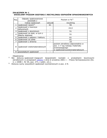 ZAŁĄCZNIK Nr 1 DOCELOWY POZIOM ODZYSKU I RECYKLINGU ODPADÓW OPAKOWANIOWYCH 5 6 7 Odpady opakowaniowe powstałe z rodzaj opakowań opakowań razem2) opakowań z tworzyw sztucznych opakowań z aluminium opakowań ze stali, w tym z blachy stalowej opakowań z papieru i tektury opakowań ze szkła opakowań z drewna 8 opakowań wielomateriałowych - 9 pozostałych opakowań - Poz. 1 2 3 4 1) 2) Poziom w %1) odzysk 61 recykling 56 - 23,5 - 51 - 51 - 61 61 16 poziom określony odpowiednio w poz. 1-7 wg rodzaju materiału przeważającego w opakowaniuwielomateriałowym - Objaśnienia: Nie dotyczy opakowań mających bezpośredni kontakt z produktami leczniczymi określonymi w przepisach ustawy z dnia 6 września 2001 r. - Prawo farmaceutyczne (Dz. U. z 2008 r. Nr 45, poz. 271, z późn. zm.). Dotyczy sumy wszystkich opakowań wymienionych w poz. 2-9.