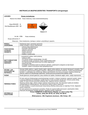 INSTRUKCJA BEZPIECZEŃSTWA TRANSPORTU (drogowego) ŁADUNEK: Kwas mrówkowy Nazwa inna /skład/: Kwas metanowy, kwas wodorokarboksylowy Klasa RID/ADR: 8 Kod klasyfikacyjny ADR: C3 80 1779 Nalepka nr 8 Nr UN: 1779 Kwas mrówkowy Grupa pakowania: II Własności: Ciecz bezbarwna, dymiąca o ostrym, przenikliwym zapachu RODZAJ ZAGROŻENIA PODSTAWOWA OCHRONA OSOBISTA NATYCHMIASTOWE DZIAŁANIE KIEROWCY Substancja żrąca, powoduje oparzenia Unikać kontaktu z silnymi utleniaczami - ochrona dróg oddechowych. - kamizelka ostrzegawcza - rękawice ochronne - okulary ochronne - odzież ochronna - butelka z czystą wodą - powiadomić policje i straż pożarną - wyłączyć silnik, - nie używać światła nieosłoniętego, nie palić, - oznakować drogę i przestrzec innych użytkowników drogi, - nie dopuszczać osób postronnych do strefy zagrożenia, - stanąć pod wiatr, - przystąpić do likwidacji awarii we własnym zakresie, a jeżeli jest to związane ze zbyt dużym ryzykiem, czekać na przybycie ekip specjalistycznych. WYCIEK LUB WYSYPANIE SIĘ MATERIAŁU Usunąć źródła zapłonu ( ugasić otwarty ogień, ogłosić zakaz palenia, nie używać iskrzących narzędzi). Pary rozcieńczać rozproszonymi prądami wodnymi, zabezpieczyć studzienki ściekowe. Unikać bezpośredniego kontaktu z uwalniającą się substancją. Miejsca gromadzenia się cieczy przysypać niepalną substancją chłonną, zebrać do zamykanego pojemnika, zanieczyszczoną powierzchnię spłukać wodą. POŻAR Środki gaśnicze: proszki gaśnicze, piany średnie lub ciężkie, dwutlenek węgla, woda - prądy rozproszone. PIERWSZA POMOC W razie zatrucia inhalacyjnego poszkodowanego wynieść z miejsca narażenia, zapewnić spokój, ułożyć w pozycji półleżącej lub siedzącej, wysiłek fizyczny może wyzwolić obrzęk płic. Chronić przed utratą ciepła. W razie uczucia duszności podawać tlen, zapewnić pomoc medyczną. Skażoną odzież zdjąć, oblane miejsca spłukać dużą ilością wody. Nie stosować mydła ani środków zobojętniających (alkalizujących). Na oparzenia nałożyć jałowy opatrunek. W razie kontaktu z oczami przemywać dużą ilością chłodnej wody przez co najmniej 15 min. Zapewnić pomoc medyczną. W razie spożycia nie wywoływać wymiotów. Podać do wypicia białko jaj kurzych, ewentualnie mleko. Poza tym nie podawać niczego doustnie. Zapewnić pomoc medyczną. INFORMACJE DODATKOWE Firma CHEMPUR 41-940 Piekary Śląskie, ul. Jana Lortza 70a. Tel/fax. (032) 287-20-52, tel. (032) 767-88-91 Straż pożarna - 998, Pogotowie ratunkowe - 999, Policja - 997 Wydrukowane i przygotowane przez Firmę CHEMPUR. Strona 1 z 1