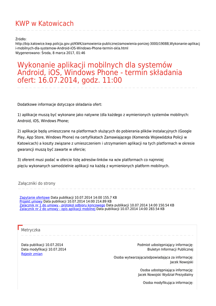 KWP w Katowicach Źródło: http://bip.katowice.kwp.policja.gov.pl/KWK/zamowienia-publiczne/zamowienia-ponizej-3000/19088,Wykonanie-aplikacj i-mobilnych-dla-systemow-Android-iOS-Windows-Phone-termin-skla.html Wygenerowano: Środa, 8 marca 2017, 01:46 Wykonanie aplikacji mobilnych dla systemów Android, iOS, Windows Phone - termin składania ofert: 16.07.2014, godz. 11:00 Dodatkowe informacje dotyczące składania ofert: 1) aplikacje muszą być wykonane jako natywne (dla każdego z wymienionych systemów mobilnych: Android, iOS, Windows Phone; 2) aplikacje będą umieszczane na platformach służących do pobierania plików instalacyjnych (Google Play, App Store, Windows Phone) na certyfikatach Zamawiającego (Komenda Wojewódzka Policji w Katowicach) a koszty związane z umieszczeniem i utrzymaniem aplikacji na tych platformach w okresie gwarancji muszą być zawarte w ofercie; 3) oferent musi podać w ofercie listę adresów-linków na w/w platformach co najmniej pięciu wykonanych samodzielnie aplikacji na każdą z wymienionych platform mobilnych. Załączniki do strony Zapytanie ofertowe Data publikacji 10.07.2014 14:00 155.7 KB Projekt umowy Data publikacji 10.07.2014 14:00 214.89 KB Zalacznik nr 1 do umowy - protokol odbioru koncowego Data publikacji 10.07.2014 14:00 150.54 KB Zalacznik nr 2 do umowy - opis aplikacji mobilnej Data publikacji 10.07.2014 14:00 283.54 KB Metryczka Data publikacji 10.07.2014 Data modyfikacji 10.07.2014 Rejestr zmian Podmiot udostępniający informację: Biuletyn Informacji Publicznej Osoba wytwarzająca/odpowiadająca za informację: Jacek Nowojski Osoba udostępniająca informację: Jacek Nowojski Wydział Prezydialny Osoba modyfikująca informację: Jacek Nowojski