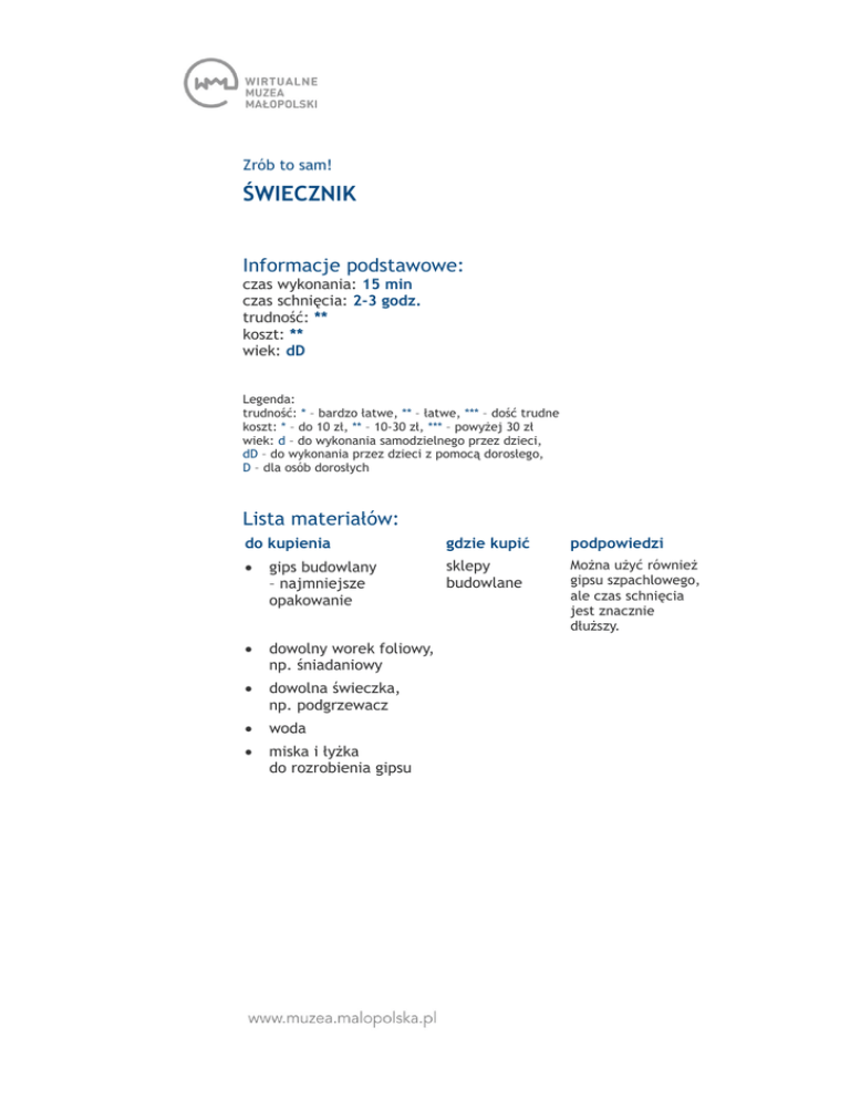 Zrób to sam! ŚWIECZNIK Informacje podstawowe: czas wykonania: 15 min czas schnięcia: 2-3 godz. trudność: ** koszt: ** wiek: dD Legenda: trudność: * – bardzo łatwe, ** – łatwe, *** – dość trudne koszt: * – do 10 zł, ** – 10-30 zł, *** – powyżej 30 zł wiek: d – do wykonania samodzielnego przez dzieci, dD – do wykonania przez dzieci z pomocą dorosłego, D – dla osób dorosłych Lista materiałów: do kupienia gdzie kupić podpowiedzi gips budowlany – najmniejsze opakowanie sklepy budowlane Można użyć również gipsu szpachlowego, ale czas schnięcia jest znacznie dłuższy. dowolny worek foliowy, np. śniadaniowy dowolna świeczka, np. podgrzewacz woda miska i łyżka do rozrobienia gipsu Wykonanie krok po kroku: Krok 1 Wsyp do miski gips i zalej wodą w proporcjach 1:1. Wymieszaj. Na pojedynczy świecznik potrzebujesz około 3 łyżek gipsu i 3 łyżek wody. Krok 2 Wlej gips do worka. Uformuj według uznania. Jeśli użyjesz małego woreczka z zapięciem strunowym, uzyskasz regularną formę przypominającą poduszkę. Jeśli użyjesz większego worka, możesz uzyskać nieregularną, „pomiętą” bryłę. Możesz również włożyć worek do dowolnego naczynia. Wówczas świecznik przyjmie jego kształt. Postaw świeczkę na worku, wciśnij lekko w gips i zostaw na czas schnięcia. Krok 3 Odczekaj godzinę, aż gips wyschnie. Zdejmij ostrożnie worek. Świecznik nie jest jeszcze zupełnie gotowy. Możesz go już używać, ale jeśli chcesz go pomalować, musisz poczekać jeszcze 2-3 godziny. Suchy gips będzie biały. Gotowe! Więcej pomysłów: Z gipsu możesz również wykonać: - podstawkę pod kubek, - kieliszek na jajko, - klocki.