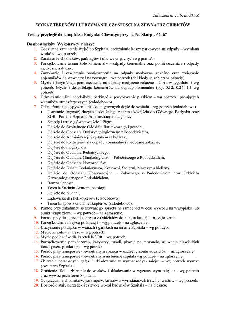 Załącznik nr 1.19. do SIWZ WYKAZ TERENÓW I UTRZYMANIE CZYSTOŚCI NA ZEWNĄTRZ OBIEKTÓW Tereny przyległe do kompleksu Budynku Głównego przy os. Na Skarpie 66, 67 Do obowiązków Wykonawcy należy: 1. Codzienne zamiatanie wejść do Szpitala, opróżnianie koszy parkowych na odpady – wymiana worków i wg potrzeb. 2. Zamiatanie chodników, parkingów i ulic wewnętrznych wg potrzeb. 3. Porządkowanie terenu koło kontenerów – odpady komunalne oraz pomieszczenia na odpady medyczne zakaźne. 4. Zamykanie i otwieranie pomieszczenia na odpady medyczne zakaźne oraz wciąganie pojemników do wewnątrz i na zewnątrz – wg potrzeb (dni kiedy są zabierane odpady) 5. Mycie i dezynfekcja pomieszczenia na odpady medyczne zakaźne – 3 raz w tygodniu i wg potrzeb. Mycie i dezynfekcja kontenerów na odpady komunalne (poj. 0,12; 0,24; 1,1 wg potrzeb) 6. Odśnieżanie ulic i chodników, parkingów, posypywanie piaskiem – wg potrzeb i panujących warunków atmosferycznych (całodobowo). 7. Odśnieżanie i posypywanie piaskiem głównych dojść do szpitala – wg potrzeb (całodobowo). Usuwanie (wywóz) dużych ilości śniegu z terenu k/wejścia do Głównego Budynku oraz SOR i Poradni Szpitala, Administracji oraz garaży, Schody i taras: główne wejście I Piętro, Dojście do Szpitalnego Oddziału Ratunkowego i poradni, Dojście do Oddziału Otolaryngologicznego z Pododdziałem, Dojście do Administracji Szpitala oraz k/garaży, Dojście do kontenerów na odpady komunalne i medyczne zakaźne, Dojście do magazynów, Dojście do Oddziału Pediatrycznego, Dojście do Oddziału Ginekologiczno – Położniczego z Pododdziałem, Dojście do Oddziału Noworodków, Dojście do Działu Technicznego, Kotłowni, Stolarni, Magazynu bielizny, Dojście do Oddziału Obserwacyjno – Zakaźnego z Pododdziałem oraz Oddziału Dermatologicznego z Pododdziałem, Rampa tlenowa, Teren k/Zakładu Anatomopatologii, Dojście do Kuchni, Lądowisko dla helikopterów (całodobowo), Teren k/lądowiska dla helikopterów (całodobowo). 8. Pomoc przy załadunku skasowanego sprzętu na samochód w celu wywozu na wysypisko lub punkt skupu złomu – wg potrzeb – na zgłoszenie. 9. Pomoc przy dostarczeniu sprzętu z Oddziałów do punktu kasacji – na zgłoszenie. 10. Porządkowanie miejsca po kasacji – wg potrzeb – na zgłoszenie. 11. Utrzymanie porządku w wiatach i garażach na terenie Szpitala – wg potrzeb. 12. Mycie schodów i tarasu – wg potrzeb. 13. Mycie podjazdów dla karetek k/SOR – wg potrzeb. 14. Porządkowanie pomieszczeń, korytarzy, tuneli, piwnic po remoncie, usuwanie niewielkich ilości gruzu, piasku itp. – wg potrzeb. 15. Pomoc przy transporcie wewnętrznym sprzętu w czasie remontu oddziałów – na zgłoszenie. 16. Pomoc przy transporcie wewnętrznym na terenie szpitala wg potrzeb – na zgłoszenie. 17. Zbieranie połamanych gałęzi i składowanie w wyznaczonym miejscu– wg potrzeb wywóz poza teren Szpitala.. 18. Grabienie liści – zbieranie do worków i składowanie w wyznaczonym miejscu - wg potrzeb oraz wywóz poza teren Szpitala.. 19. Oczyszczanie chodników, parkingów, tarasów z wyrastających traw i chwastów – wg potrzeb. 20. Dbałość o stały porządek i estetykę wokół budynków Szpitala – na bieżąco. 21. Wykonywanie innych drobnych czynności wg potrzeb zleconych przez Zamawiającego nie objętych niniejszym zakresem (np. sadzenie kwiatów na skwerku w ilości 100 szt. bratków i 100 szt. aksamitek rocznie). Uwaga! Wykonawca jest zobowiązany do wyposażenia ciągów komunikacyjnych wewnątrz budynków oraz terenów zewnętrznych w kosze i worki na odpady komunalne, które przejdą na własność Szpitala, jak również do uzupełnienia na bieżąco w trakcie trwania umowy.
