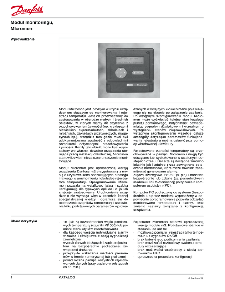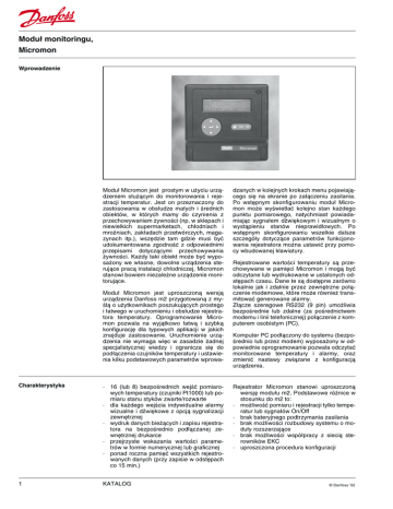 Modu³ monitoringu, Micromon Wprowadzenie Modu³ Micromon jest prostym w u¿yciu urz¹dzeniem s³u¿¹cym do monitorowania i rejestracji temperatur. Jest on przeznaczony do zastosowania w obs³udze ma³ych i rednich obiektów, w których mamy do czynienia z przechowywaniem ¿ywnoci (np. w sklepach i niewielkich supermarketach, ch³odniach i mroniach, zak³adach przetwórczych, magazynach itp.), wszêdzie tam gdzie musi byæ udokumentowana zgodnoæ z odpowiednimi przepisami dotycz¹cymi przechowywania ¿ywnoci. Ka¿dy taki obiekt mo¿e byæ wyposa¿ony we w³asne, dowolne urz¹dzenia steruj¹ce prac¹ instalacji ch³odniczej, Micromon stanowi bowiem niezale¿ne urz¹dzenie monitoruj¹ce. Modu³ Micromon jest uproszczon¹ wersj¹ urz¹dzenia Danfoss m2 przygotowan¹ z myl¹ o u¿ytkownikach poszukuj¹cych prostego i ³atwego w uruchomieniu i obs³udze rejestratora temperatury. Oprogramowanie Micromon pozwala na wyj¹tkowo ³atw¹ i szybk¹ konfiguracjê dla typowych aplikacji w jakich znajduje zastosowanie. Uruchomienie urz¹dzenia nie wymaga wiêc w zasadzie ¿adnej specjalistycznej wiedzy i ogranicza siê do pod³¹czenia czujników temperatury i ustawienia kilku podstawowych parametrów wprowa- Charakterystyka · 16 (lub 8) bezporednich wejæ pomiarowych temperatury (czujniki Pt1000) lub pomiaru stanu styków zwarte/rozwarte · dla ka¿dego wejcia indywidualne alarmy wizualne i dwiêkowe z opcj¹ sygnalizacji zewnêtrznej · wydruk danych bie¿¹cych i zapisu rejestratora na bezporednio pod³¹czanej zewnêtrznej drukarce · przejrzyste wskazania wartoci parametrów w formie numerycznej lub graficznej · ponad roczna pamiêæ wszystkich rejestrowanych danych (przy zapisie w odstêpach co 15 min.) 1 KATALOG dzanych w kolejnych krokach menu pojawiaj¹cego siê na ekranie po za³¹czeniu zasilania. Po wstêpnym skonfigurowaniu modu³ Micromon mo¿e wywietlaæ kolejno stan ka¿dego punktu pomiarowego, natychmiast powiadamiaj¹c sygna³em dwiêkowym i wizualnym o wyst¹pieniu stanów nieprawid³owych. Po wstêpnym skonfigurowaniu wszelkie dalsze szczegó³y dotycz¹ce parametrów funkcjonowania rejestratora mo¿na ustawiæ przy pomocy wbudowanej klawiatury. Rejestrowane wartoci temperatury s¹ przechowywane w pamiêci Micromon i mog¹ byæ odczytane lub wydrukowane w ustalonych odstêpach czasu. Dane te s¹ dostêpne zarówno lokalnie jak i zdalnie przez zewnêtrzne po³¹czenie modemowe, które mo¿e równie¿ transmitowaæ generowane alarmy. Z³¹cze szeregowe RS232 (9 pin) umo¿liwia bezporednie lub zdalne (za porednictwem modemu i linii telefonicznej) po³¹czenie z komputerem osobistym (PC). Komputer PC pod³¹czony do systemu (bezporednio lub przez modem) wyposa¿ony w odpowiednie oprogramowanie pozwala odczytaæ monitorowane temperatury i alarmy, oraz zmieniæ nastawy zwi¹zane z konfiguracj¹ urz¹dzenia. Rejestrator Micromon stanowi uproszczon¹ wersjê modu³u m2. Podstawowe ró¿nice w stosunku do m2 to: · mo¿liwoæ pomiaru i rejestracji tylko temperatur lub sygna³ów On/Off · brak bateryjnego podtrzymania zasilania · brak mo¿liwoci rozbudowy systemu o modu³y rozszerzaj¹ce · brak mo¿liwoci wspó³pracy z sieci¹ sterowników EKC · uproszczona procedura konfiguracji © Danfoss '02 Modu³ monitoringu Micromon Przegl¹d systemu Micromon jako uproszczona wersja m2 mo¿e monitorowaæ wy³¹cznie temperaturê lub stan styków zwarte/rozwarte. Sygna³y te pod³¹czone s¹ bezporednio do jego listwy zaciskowej. Alarmy Modu³ Micromon zapewnia dwiêkowe i wizualne alarmy, je¿eli wartoæ temperatury przekroczy uprzednio zaprogramowany poziom. System mo¿na ustawiæ na zdalne sygnalizowanie stanów alarmowych przez po³¹czenie telefoniczne (zewnêtrzne urz¹dzenie wybieraj¹ce) lub przez modem, a tak¿e za pomoc¹ wiadomoci tekstowych SMS, o ile pod³¹czono odpowiedni modem GSM. Mo¿liwe jest zró¿nicowanie sposobu alarmowania w zale¿noci od pory doby i wejcia pomiarowego, dla którego wyst¹pi³ alarm. Zabezpieczenia Bezpieczeñstwo dzia³ania jest zagwarantowane przez zastosowanie kodu dostêpu do nastaw zwi¹zanych z konfiguracj¹ systemu, uniemo¿liwiaj¹c tym samym ich zmianê przez osoby niepowo³ane. Podtrzymanie bateryjne Brak. Uwaga: W przypadku zaniku zasilania wszystkie zapisane w pamiêci dane pozostaj¹ zachowane i nie s¹ w takiej sytuacji tracone. Przegl¹d aplikacji Po³¹czenia zewnêtrzne Do modu³u micromon mo¿na pod³¹czyæ bezporednio: · Czujniki temperatury lub styki zwarte/ rozwarte pod³¹czane na listwie zaciskowej max. 16 (8) szt. · Drukarkê kompatybiln¹ ze standardem Epson (z³¹cze równoleg³e) · Komputer PC lub modem (z³¹cze szeregowe RS232) · 2 zewnêtrzne urz¹dzenia alarmowe Aplikacja nr 1 micromon wyposa¿ony w czujniki typu PT1000 © Danfoss '02 KATALOG 2 Modu³ monitoringu Micromon Dane techniczne Napiêcie zasilania Wywietlacz Obs³uga Wejcia sygna³ów 230V +10/-15%, 50/60 Hz Graficzny LCD, 240 x 64 Przyciski na panelu czo³owym i/lub komputer PC Maksimum 16 (8) wejæ pomiarowych temperatury do pod³¹czenia czujników temperatury Pt1000 lub sygna³ów On/Off (styki zwarte/rozwarte). Dok³adnoæ pomiarów z czujnikami Pt1000 Rejestracja danych Przekaniki alarmu (2 szt.) Z³¹cze drukarki Podtrzymanie bateryjne Transmisja danych Jêzyki Temperatura otoczenia W czasie transportu: W czasie pracy: Wilgotnoæ: Obudowa Zamawianie -20 do +70 °C 0 do +55 °C 20 80 %RH IP20 Typ Numer kodowy Patrz dane dla EKC201/301 Max. pojemnoæ 2 MB. Obci¹¿alnoæ: 24 V / 50Hz, 1A Równoleg³e (standard EPSON) Brak RS 232 angielski, niemiecki, francuski, w³oski, hiszpañski, duñski, polski i inne Ilo æ wej æ Pamiêæ w MB Max. ilo æ wej æ przy pamiêci min. 1 rok (1) 080Z8171 Micromon 8 2 8 080Z8172 Micromon 16 2 16 Akcesoria Opis Nr kodowy Czujnik AKS12 z kablem 1,5m 084N0035 Czujnik AKS12 z kablem 3,5m 084N0039 Czujnik AKS12 z kablem 5,5m 084N0038 Czujnik EKS111 PTC z kablem 3,5m 084N1163 m2 kabel do drukarki 3m odpowiedni do Micromon 080N84