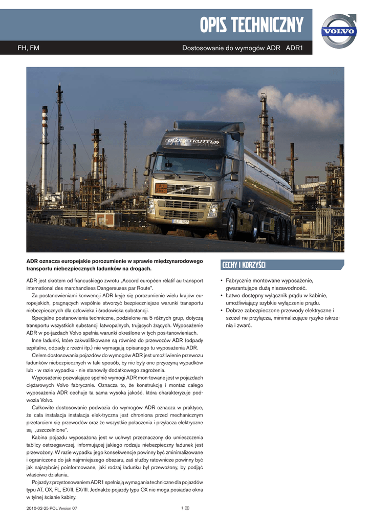 Opis techniczny FH, FM Dostosowanie do wymogów ADR ADR1 ADR oznacza europejskie porozumienie w sprawie międzynarodowego transportu niebezpiecznych ładunków na drogach. ADR jest skrótem od francuskiego zwrotu „Accord européen rélatif au transport international des marchandises Dangereuses par Route”. Za postanowieniami konwencji ADR kryje się porozumienie wielu krajów europejskich, pragnących wspólnie stworzyć bezpieczniejsze warunki transportu niebezpiecznych dla człowieka i środowiska substancji. Specjalne postanowienia techniczne, podzielone na 5 różnych grup, dotyczą transportu wszystkich substancji łatwopalnych, trujących żrących. Wyposażenie ADR w po-jazdach Volvo spełnia warunki określone w tych pos-tanowieniach. Inne ładunki, które zakwalifikowane są również do przewozów ADR (odpady szpitalne, odpady z rzeźni itp.) nie wymagają opisanego tu wyposażenia ADR. Celem dostosowania pojazdów do wymogów ADR jest umożliwienie przewozu ładunków niebezpiecznych w taki sposób, by nie były one przyczyną wypadków lub - w razie wypadku - nie stanowiły dodatkowego zagrożenia. Wyposażenie pozwalające spełnić wymogi ADR mon-towane jest w pojazdach ciężarowych Volvo fabrycznie. Oznacza to, że konstrukcję i montaż całego wyposażenia ADR cechuje ta sama wysoka jakość, która charakteryzuje podwozia Volvo. Całkowite dostosowanie podwozia do wymogów ADR oznacza w praktyce, że cała instalacja instalacja elek-tryczna jest chroniona przed mechanicznym przetarciem się przewodów oraz że wszystkie połaczenia i przyłacza elektryczne są „uszczelnione”. Kabina pojazdu wyposażona jest w uchwyt przeznaczony do umieszczenia tablicy ostrzegawczej, informującej jakiego rodzaju niebezpieczny ładunek jest przewożony. W razie wypadku jego konsekwencje powinny być zminimalizowane i ograniczone do jak najmniejszego obszaru, zaś służby ratownicze powinny być jak najszybciej poinformowane, jaki rodzaj ładunku był przewożony, by podjąć właściwe działania. Pojazdy z przystosowaniem ADR1 spełniają wymagania techniczne dla pojazdów typu AT, OX, FL, EX/II, EX/III. Jednakże pojazdy typu OX nie moga posiadac okna w tylnej ścianie kabiny. 2010-02-25 POL Version 07 1 (2) CECHY I KORZYŚCI • Fabrycznie montowane wyposażenie, gwarantujące dużą niezawodność. • Łatwo dostępny wyłącznik prądu w kabinie, umożliwiający szybkie wyłączenie prądu. • Dobrze zabezpieczone przewody elektryczne i szczel-ne przyłącza, minimalizujące ryzyko iskrzenia i zwarć. Opis techniczny FH, FM Dostosowanie do wymogów ADR ADR1 Łatwo dostępny, awaryjny wyłącznik prądu Ogrzewacz postojowy spełniający normy ADR Szybkie wyłączenie prądu w razie wypadku umożliwia kierowcy łatwo dostępny, główny wyłącznik prądu umieszczony w kabinie. Wyłącznik prądu jest wyłącznikiem dwustop-niowym, co uniemożliwia przypadko-we wyłączenie prądu. Wyłącznik jest wyraźnie oznaczony. Ogrzewacz postojowy spełniający normy ADR dotyczące instalacji dostępny jest jako opcja. Ogrzewacz jest automatycznie wyłączany w przy-padku przerwania pracy silnika lub użycia przystawki odbioru mocy. Uchwyt na tablicę ostrzegawczą z przodu kabiny Przewożące większość niebezpiecznych ładunków pojazdy powinny być oznakowane za pomocą kwadratowych odblaskowych tablic koloru pomarańczowego. Kabiny Volvo spełniające wymogi ADR wyposażone są w przedniej części w uchwyty na tablice ostrzegawcze (EC zatwierdzony). Obowiązkowym elementem wyposażenia ADR jest gaśnica(e) Pojazd przeznaczony do przewozu materiałów niebezpiecznych musi być wyposażony w jedną lub więcej przenośnych gaśnic o łącznej pojemności co najmniej 12 kg suchego proszku gaśniczego (lub równoważnej pojemności innego dozwolonego środka gaśniczego). Jedna z gaśnic musi mieć pojemność co najmniej 6 kg. Gaśnice nie należą do standardowego wyposażenia i należy je zamawiać odrębnie. Powyższy przepis dotyczący gaśnic odnosi się do jazdy samochodem i dlatego jego spełnienie jest obowiązkiem użytkownika pojazdu. Czerwony wyłącznik prądu na tablicy roz-dzielczej jest wyraźny i łatwo dostępny. Dobrze zabezpieczone przewody elektryczne i szczelne przyłącza Wszystkie przewody elektryczne znajdujące się w podwoziu za kabiną są dodatkowo zabezpieczone przed przetarciem i innymi uszkodzeniami mechanicznymi za pomocą wytrzy-małych osłon z tworzywa sztucznego. Eliminuje to niebezpieczeństwo iskrzenia i spięć w układzie elektrycznym. Tylne gniazdo przyłączeniowe umieszczone na ramie, boczne światła pozycyjne oraz tylne lampy są również starannie izolowane, co uniemożliwia kontakt ulatniającego się gazu lub łatwopalnej cieczy z przewodzącymi prąd elementami. Pojazdy przystosowane do holowania przyczepy wyposażone są w 15-szpilkowe złącze, specjalnie przystosowane do przewozu ładunków niebezpiecznych. Dodatkowe wyposażenie Niektóre elementy dodatkowego wyposażenia zwiększającego bezpie-czeństwo mogą być zamawiane bez-pośrednio w fabryce. Należą do nich m.in. klocki blokujące, czy też kamizelki i trójkąty ostrzegawcze. Zgodnie z regułami ADR obowią-zującymi od 1 stycznia 1999 r. w wyposażeniu pojazdu mogą znajdować się dwa trójkąty bezpieczeństwa. Obowiązkowe do tego czasu lampy os-trzegawcze mogą być jednak w dalszym ciągu zamawiane bezpośrednio z fabryki. Należy w takim wypadku wyspecyfikować wariant FLASHL-A. Skrzynka akumulatorowa z elektronicznym modułem ADR Skrzynka akumulatorowa może być zamocowana w różnych miejscach, zależnie od wersji pojazdu. W skrzynce akumulatorowej znajduje się specjalny elektroniczny moduł ADR, którego zadaniem jest przekazywanie sygnałów od każdego z wyłączników (znajdujących się wewnątrz i na zewnątrz kabiny) i odłączanie akumulatorów. Wszystkie złącza elektryczne są umieszczone w oprawach z tworzywa sztucznego. Skrzynka akumulato
