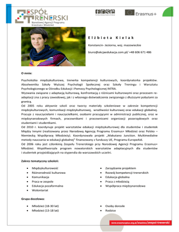 Elżbieta Kielak Konstancin- Jeziorna, woj. mazowieckie [email protected]/ +48 606 671 486 O mnie: Psycholożka międzykulturowa, trenerka kompetencji kulturowych, koordynatorka projektów. Absolwentka Szkoły Wyższej Psychologii Społecznej oraz Szkoły Treningu i Warsztatu Psychologicznego w Ośrodku Edukacji i Pomocy Psychologicznej INTRA. Wyzwania związane z adaptacją kulturową, konfrontacją z różnicami kulturowymi oraz procesem readaptacji zna z pracy zawodowej, jak i z własnego doświadczenia związanego z dłuższymi pobytami za granicą. Od 2005 roku aktywnie szkoli oraz tworzy materiały szkoleniowe w zakresie kompetencji międzykulturowych, komunikacji międzykulturowej, wrażliwości kulturowej oraz edukacji globalnej. Pracuje z nauczycielami i nauczycielkami, osobami pracującymi w administracji publicznej, oraz w międzynarodowych firmach, pracownikami i pracownicami organizacji pozarządowych oraz studentami i studentkami. Od 2010 r. koordynuje projekt warsztatów edukacji międzykulturowej dla studentów i studentek Między Innymi (realizowany przez Narodową Agencję Programu Erasmus+ Młodzież oraz Polsko – Niemiecką Współpracę Młodzieży). Koordynowała projekt „Makutano Junction. Multimedialne metody nauczania w edukacji globalnej” finansowany z funduszy UE, Programu EuropeAid. Od 2006 roku jest członkinią Zespołu Trenerskiego przy Narodowej Agencji Programu Erasmus+ Młodzież. Współtworzyła program nowatorskich warsztatów adaptacyjnych dla studentów i studentek przyjeżdżających na stypendia do warszawskich uczelni. Zakres tematyczny szkoleń: Międzykulturowość Różnorodność kulturowa Komunikacja Praca w zespole Edukacja pozaformalna Wolontariat Zarządzanie projektem Rozwój kompetencji trenerskich Edukacja globalna Praca z młodzieżą Współpraca międzynarodowa Osoby dorosłe Rodzice Grupa docelowa: Młodzież (18-30 lat) Młodzież (13-18 lat) Nauczyciele i nauczycielki Wolontariusze i wolontariuszki Studenci Kobiety Obcokrajowcy Grupy różnorodne kulturowo Liderzy młodzieżowi Pracownicy NGO Pracownicy naukowi Urzędnicy i urzędniczki/ Samorządowcy Migranci i migrantki Uchodźcy i uchodźczynie Biznes Organizacja, z którą jestem związana: Współpracuję z różnymi organizacjami. Od kwietnia 2014 roku ściśle współpracuję z Grupą Zagranica (www.zagranica.org.pl). Języki: polski - ojczysty angielski - biegle szwedzki - b. dobrze Najważniejsze doświadczenia trenerskie: 1. W ramach programu "Młodzież w działaniu" prowadziła szereg warsztatów z zakresu edukacji międzykulturowej dla studentów i studentek uczelni, które biorą udział w projekcie "Między Innymi" Warsztaty edukacji międzykulturowej dla studentów i studentek. Tematyka warsztatów dotyczyła: wprowadzenia do edukacji międzykulturowej, komunikacji międzykulturowej, zarządzania projektem, funkcjonowania w grupie zróżnicowanej kulturowo. 2. Od 2005 roku aktywnie szkoli młodych ludzi przyjeżdżających na międzynarodowe stypendia do Polski. Prowadziła i prowadzi cało-semestralne warsztaty adaptacyjne dla grup studentów i studentek międzynarodowych oraz krótsze programy adaptacyjne. 3. W 2012 roku, z ramienia Fundacji Partners Polska współprowadziła trzydniowe szkolenie zatytułowane „Wrażliwość kulturowa. Szkolenie dla pracowników Wydziału Spraw Obywatelskich i Cudzoziemców Lubelskiego Urzędu Wojewódzkiego”. Wykształcenie: 03.2007-06.2008 Ośrodek Edukacji i Pomocy Psychologicznej INTRA Szkoła Treningu i Warsztatu Psychologicznego 09.1998 - 05.2004 Szkoła Wyższa Psychologii Społecznej Magister Psychologii Specjalizacja: Psychologia Stosunków Międzykulturowych Publikacje: Peeking through Critical Incidents: German Cultural Interactions with Neighboring Poles and Far Eastern Chinese. Boski, P., Mazurowska, K., Olczak, E., Jędrzejczak, A. (2012). U. Zeutschel, S. Kammhuber (eds.). Kultur zwischen standard und kreativitat. Berlin: Bloomsbury Publishers. Bądź MIĘDZY INNYMI. Dialog Międzykulturowy. Wydanie specjalne 2012. Światowy Dzień Pomocy Humanitarnej. Wolontariusze i stypendyści w krajach Unii Europejskiej. Porównanie procesu adaptacji psychologicznej. Współautorstwo Studia Psychologiczne. t.44 (2006), z.1, s. 85-97 Doradztwo zawodowe a wyzwania międzykulturowe - podręcznik Cieslikowska, D., Kownacka, E., Olczak, E., Paszkowska-Rogacz, A. (2007), Warszawa: KOWEZiU