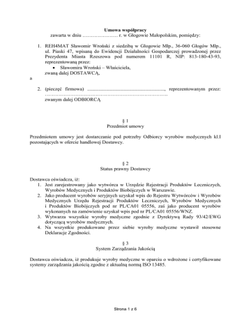 Umowa współpracy zawarta w dniu ………………… r. w Głogowie Małopolskim, pomiędzy: 1. REH4MAT Sławomir Wroński z siedzibą w Głogowie Młp., 36-060 Głogów Młp., ul. Piaski 47, wpisaną do Ewidencji Działalności Gospodarczej prowadzonej przez Prezydenta Miasta Rzeszowa pod numerem 11101 R, NIP: 813-180-43-93, reprezentowaną przez: Sławomira Wroński – Właściciela, zwaną dalej DOSTAWCĄ, a 2. (pieczęć firmowa) ............................................................., reprezentowanym przez: ………………………………………………………………. zwanym dalej ODBIORCĄ §1 Przedmiot umowy Przedmiotem umowy jest dostarczanie pod potrzeby Odbiorcy wyrobów medycznych kl.I pozostających w ofercie handlowej Dostawcy. §2 Status prawny Dostawcy Dostawca oświadcza, iż: 1. Jest zarejestrowany jako wytwórca w Urzędzie Rejestracji Produktów Leczniczych, Wyrobów Medycznych i Produktów Biobójczych w Warszawie. 2. Jako producent wyrobów seryjnych uzyskał wpis do Rejestru Wytwórców i Wyrobów Medycznych Urzędu Rejestracji Produktów Leczniczych, Wyrobów Medycznych i Produktów Biobójczych pod nr PL/CA01 05556, zaś jako producent wyrobów wykonanych na zamówienie uzyskał wpis pod nr PL/CA01 05556/WNZ. 3. Wytwarza wszystkie wyroby medyczne zgodnie z Dyrektywą Rady 93/42/EWG dotyczącą wyrobów medycznych. 4. Na wszystkie produkowane przez siebie wyroby medyczne wystawił stosowne Deklaracje Zgodności. §3 System Zarządzania Jakością Dostawca oświadcza, iż produkuje wyroby medyczne w oparciu o wdrożone i certyfikowane systemy zarządzania jakością zgodne z aktualną normą ISO 13485. Strona 1 z 6 §4 Prawa autorskie Dostawca oświadcza, iż posiada autorskie prawa majątkowe, prawa z patentów i wzorów wspólnotowych na wytwarzane przez siebie wyroby medyczne oraz że wyroby te zostały zastrzeżone w OHIM – OFFICE FOR HARMONIZATION IN THE INTERNAL MARKET w Alicante §5 Obowiązki Dostawcy Dostawca zobowiązuje się do: 1. Dostarczania Odbiorcy wyrobów seryjnych oraz wykonywania wyrobów na miarę. 2. Dołożenia najwyższej staranności podczas procesu produkcyjnego w celu zapewniania produkowanym przez siebie wyrobom medycznym odpowiedniej jakości, zgodnej z obowiązującymi dyrektywami europejskimi i ustawą o wyrobach medycznych. 3. Dostarczania na życzenie Odbiorcy wszelkich niezbędnych mu deklaracji zgodności i innych dokumentów dotyczących produkowanych przez Dostawcę wyrobów medycznych. §6 Obowiązki Odbiorcy 1. Odbiorca zobowiązany jest do: a) dostarczenia Dostawcy wszelkich dokumentów rejestrowych, potwierdzających status prawny Odbiorcy, pozwalających na zastosowanie w stosunku do Odbiorcy odroczonego terminu płatności. b) składania zamówień Dostawcy w formie pisemnej – za pośrednictwem formularza dostępnego na stronie www.reh4mat.com, serwisów facebook i twitter, faxu, e-mail, telefonicznie, przez regionalnego przedstawiciela Dostawcy c) każdorazowej zapłaty firmom kurierskim za dostawę towaru, jeżeli strony umowy tak postanowią. d) terminowej zapłaty Dostawcy za dostarczone wyroby medyczne. e) współpracy z Dostawcą w zakresie wykonywania wyrobów medycznych na miarę. f) uzyskania pisemnej zgody od Dostawcy na wykorzystywanie logo Dostawcy oraz zdjęć, materiałów informacyjnych i opisów produktów istniejących na stronach internetowych Dostawcy. W przypadku braku pisemnej akceptacji udzielonej przez Dostawcę wykorzystanie logo i materiałów informacyjnych Dostawcy jest bezwzględnie zakazane. g) dodatkowo Odbiorca zobowiązany jest do dokonania pierwszych trzech zamówień u Dostawcy z wyborem jako formy płatności przedpłata lub pobranie. Trzy pierwsze zamówienia Odbiorcy z określoną inną formą płatności nie będą realizowane. 2. Dodatkowo Odbiorca w wypadku nie regulowania wymagalnych wierzytelności na rzecz Dostawcy, zobowiązuje się do pokrycia na rzecz Dostawcy zryczałtowanych kosztów przedsądowej windykacji wierzytelności w wysokości 40,00 zł obejmującej kolejno dwa telefoniczne monity o płatność, pierwsze mailowe wezwanie do zapłaty Strona 2 z 6 oraz drugie pisemne wezwanie do zapłaty przesłane listem poleconym. W wypadku pokrycia całości wierzytelności Dostawcy w efekcie monitu(-ów) telefonicznego(ych) lub mailowego wezwania do zapłaty - koszty windykacji wskazane w zdaniu pierwszym nie zostaną naliczone. §7 Miejsce dostawy Każdorazowo w zamówieniu Odbiorca ma obowiązek określić Dostawcy miejsce do którego ma zostać zrealizowana dostawa wyrobów, jeżeli adres dostawy jest inny niż siedziba firmy Odbiorcy. §8 Sposób dostawy 1. Wyroby dostarczane będą na koszt Odbiorcy za pośrednictwem firm spedycyjnych, w przypadku jednorazowych zamówień do 600,00 zł netto. 2. W przypadku zamówień jednorazowych przekraczających kwotę 600,00 zł netto dostawy realizowane będą na koszt Dostawcy. 3. Dostawy realizowane będą w opakowaniach uniemożliwiających zniszczenie wyrobów w trakcie transportu. 4. Odbiorca bezwzględnie zobowiązany jest do kontroli jakości przesłanego towaru w momencie doręczenia mu go przez kuriera. 5. Odbiorca jest uprawniony do odmowy przyjęcia przesyłki w wypadku stwierdzenia: a) uszkodzenia mechanicznego zawartości przesyłki, b) niekompletności przesyłki, względnie c) niezgodności zawartości przesyłki z przedmiotem zamówienia. 6. W wypadku wskazanym w ust.5a Odbiorca zobowiązany jest do sporządzenia protokołu reklamacji w obecności Kuriera na formularzu doręczonym przez firmę kurierską i odmówić przyjęcia przesyłki. O zaistniałej sytuacji Odbiorca bezwzględnie zobowiązany jest niezwłocznie powiadomić Dostawcę i przekazać mu posiadany formularz reklamacji, o którym mowa w zdaniu poprzednim. Podpisanie listu przewozowego oznacza, że Odbiorca potwierdza, iż zawartość przesyłki jest w stanie nienaruszonym. 7. W wypadku wskazanym w ust.5b - 5c Odbiorca powinien (pr