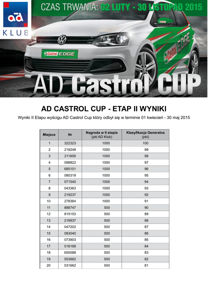 AD CASTROL CUP - ETAP II WYNIKI Wyniki II Etapu wyścigu AD Castrol Cup który odbył się w terminie 01 kwiecień - 30 maj 2015 Nagroda w II etapie (pkt AD Klub) Klasyfikacja Generalna (pkt) Miejsce Nr 1 322323 1000 100 2 219248 1000 99 3 211859 1000 98 4 098822 1000 97 5 685101 1000 96 6 080319 1000 95 7 071540 1000 94 8 043363 1000 93 9 219237 1000 92 10 278364 1000 91 11 888747 500 90 12 815153 500 89 13 218937 500 88 14 047202 500 87 15 083040 500 86 16 073903 500 85 17 018168 500 84 18 655588 500 83 19 053662 500 82 20 031662 500 81 Miejsce Nr Klasyfikacja Generalna (pkt) Miejsce Nr Klasyfikacja Generalna (pkt) 21 043040 80 61 062804 40 22 013807 79 62 280456 39 23 199900 78 63 817000 38 24 380648 77 64 001640 37 25 026383 76 65 066890 36 26 382802 75 66 274369 35 27 058157 74 67 016742 34 28 012654 73 68 012758 33 29 280591 72 69 000061 32 30 156281 71 70 868141 31 31 012820 70 71 015606 30 32 139190 69 72 000521 29 33 981104 68 73 280520 28 34 089503 67 74 863209 27 35 084964 66 75 089216 26 36 033807 65 76 279947 25 37 512112 64 77 280590 24 38 138925 63 78 034367 23 39 274464 62 79 813333 22 40 079505 61 80 010817 21 41 365241 60 81 070165 20 42 073930 59 82 272187 19 43 380860 58 83 013938 18 44 738179 57 84 273334 17 45 383294 56 85 149556 16 46 868282 55 86 280592 15 47 872209 54 87 779999 14 48 231516 53 88 382456 13 49 067979 52 89 272926 12 50 663211 51 90 333331 11 51 148958 50 91 050643 10 52 219372 49 92 140177 9 53 383711 48 93 380864 8 54 000841 47 94 015238 7 55 046498 46 95 999777 6 56 087003 45 96 275625 5 57 038953 44 97 382224 4 58 034940 43 98 000125 3 59 067268 42 99 380042 2 60 277489 41 100 366666 1