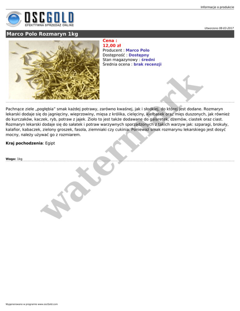 Informacje o produkcie Utworzono 08-03-2017 Marco Polo Rozmaryn 1kg Cena : 12,00 zł er m ar k Producent : Marco Polo Dostępność : Dostępny Stan magazynowy : średni Średnia ocena : brak recenzji Pachnące ziele „pogłębia” smak każdej potrawy, zarówno kwaśnej, jak i słodkiej, do której jest dodane. Rozmaryn lekarski dodaje się do jagnięciny, wieprzowiny, mięsa z królika, cielęciny, kiełbasek oraz mięs duszonych, jak również do kurczaków, kaczek, ryb, potraw z jajek. Zioło to jest także dodawane do galaretek, dżemów, ciastek oraz ciast. Rozmaryn lekarski dodaje się do sałatek i potraw warzywnych sporządzonych z takich warzyw jak: szparagi, brokuły, kalafior, kabaczek, zielony groszek, fasola, ziemniaki czy cukinia. Ponieważ smak rozmarynu lekarskiego jest dosyć mocny, należy używać go z rozmiarem. Kraj pochodzenia: Egipt w at Waga: 1kg Wygenerowano w programie www.oscGold.com
